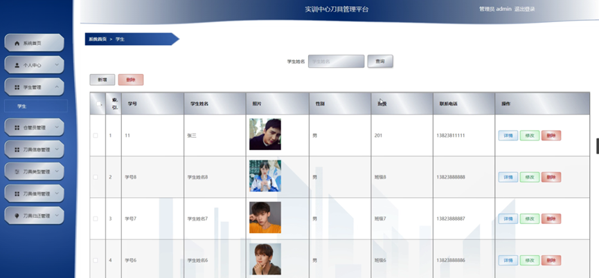 管理员点击学生管理。在学生页面输入学生姓名进行查询、新增或删除学生列表,并根据需要对学生详情信息进行详情、修改或删除操作;如图5-4所示: