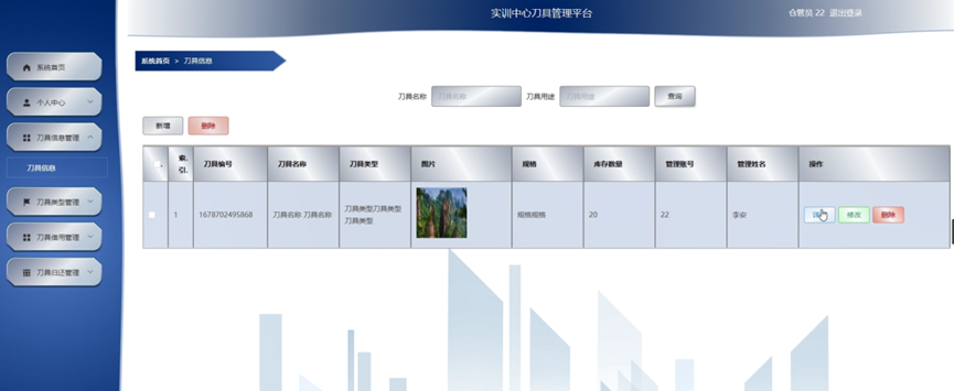 管理员点击刀具信息管理。在刀具信息页面输入刀具名称和刀具用途进行查询、新增或删除刀具信息列表,并根据需要对刀具详情信息进行详情、修改或删除操作;如图5-6所示: