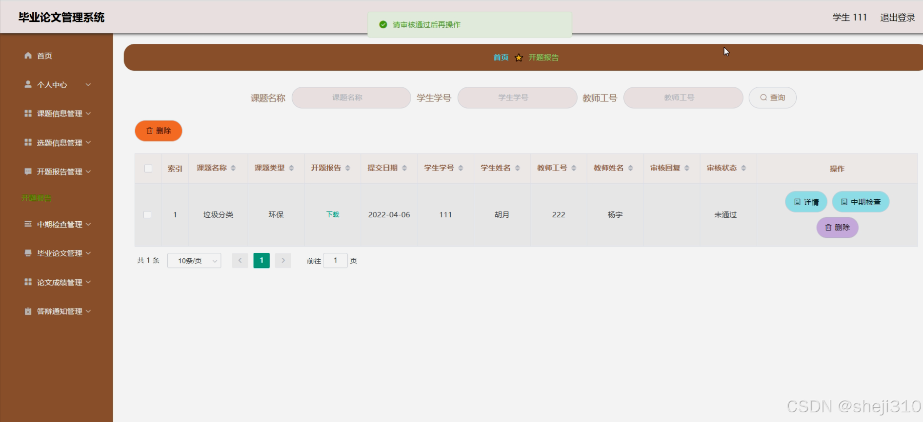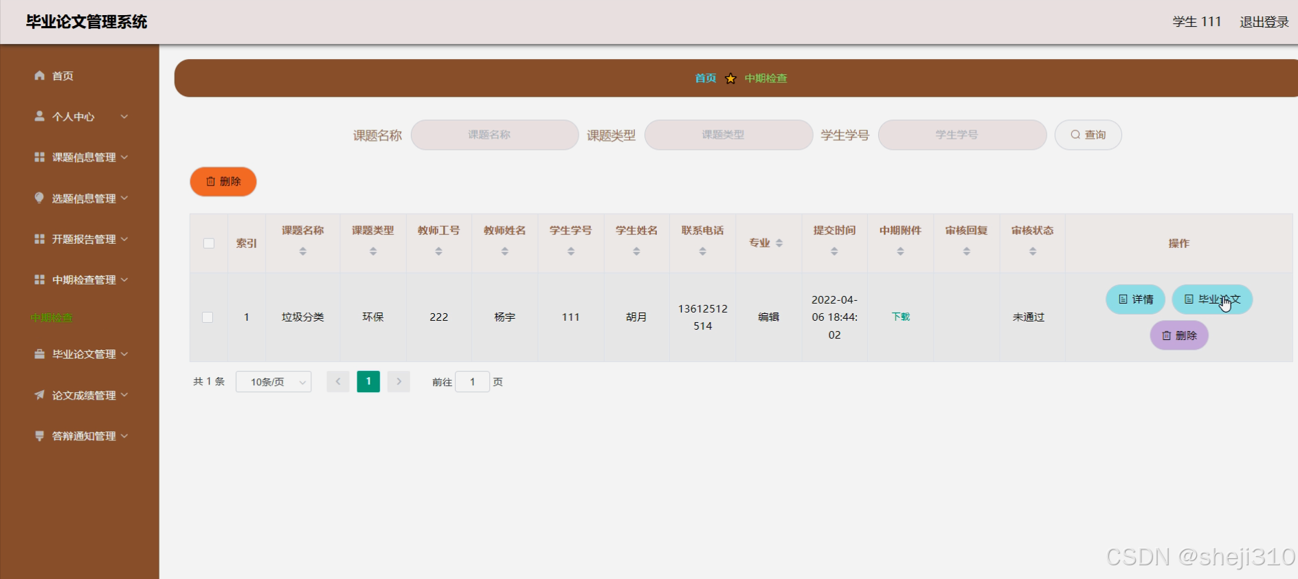 本研究旨在设计并实现一套功能完善、操作简便、易于维护的毕业论文管理系统,以解决当前高校毕业论文管理中存在的效率低下、信息丢失、管理混乱等问题。通过该系统,我们期望达到以下目的:一是实现毕业论文从选题、开题、中期检查到最终答辩的全流程电子化管理;二是为教师和学生提供便捷的论文提交、审核和查询功能,提高管理效率;三是通过内置的审核机制和评分标准,确保毕业论文的评审过程公正、透明,提高论文质量;四是为高校提供一套可定制化的管理方案,满足不同高校的具体需求。