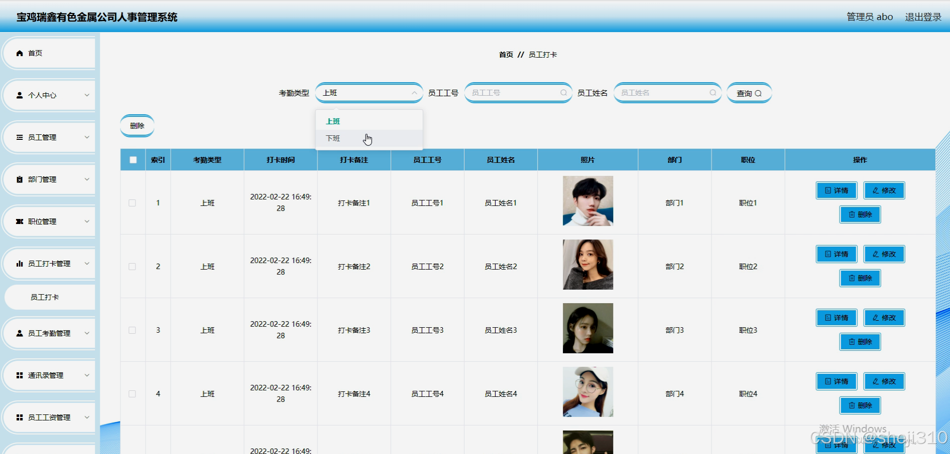 - 员工打卡与考勤管理:集成打卡设备或移动应用,实现员工上下班打卡,自动统计考勤数据,支持请假、加班等考勤情况的记录与管理。