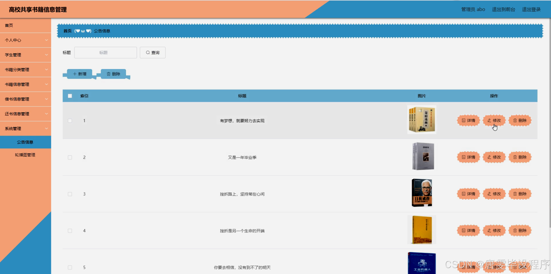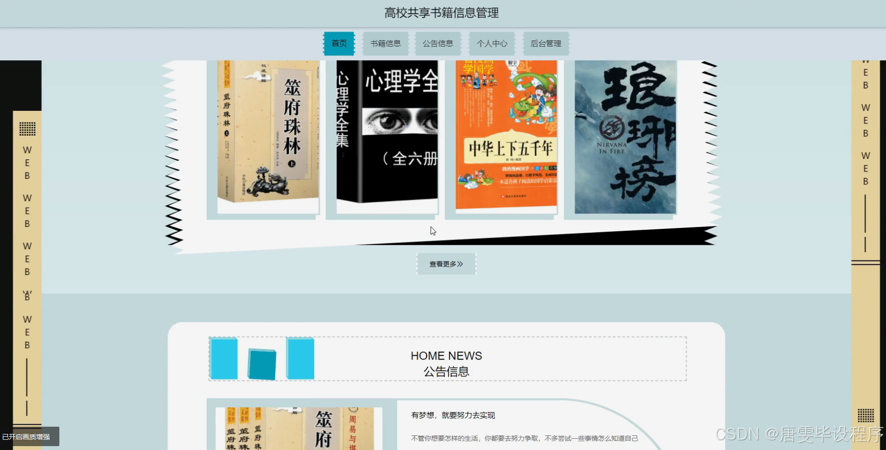 本研究旨在设计并实现一个高效、便捷的高校共享书籍信息管理系统,以满足学生日益增长的书籍资源需求。通过该系统,学生可以方便地查询书籍信息、进行在线借阅和归还操作,提高书籍资源的利用效率和学生的满意度。同时,该系统还将提供书籍分类管理功能,方便图书馆工作人员进行书籍的整理和维护,提升图书馆的整体管理水平。