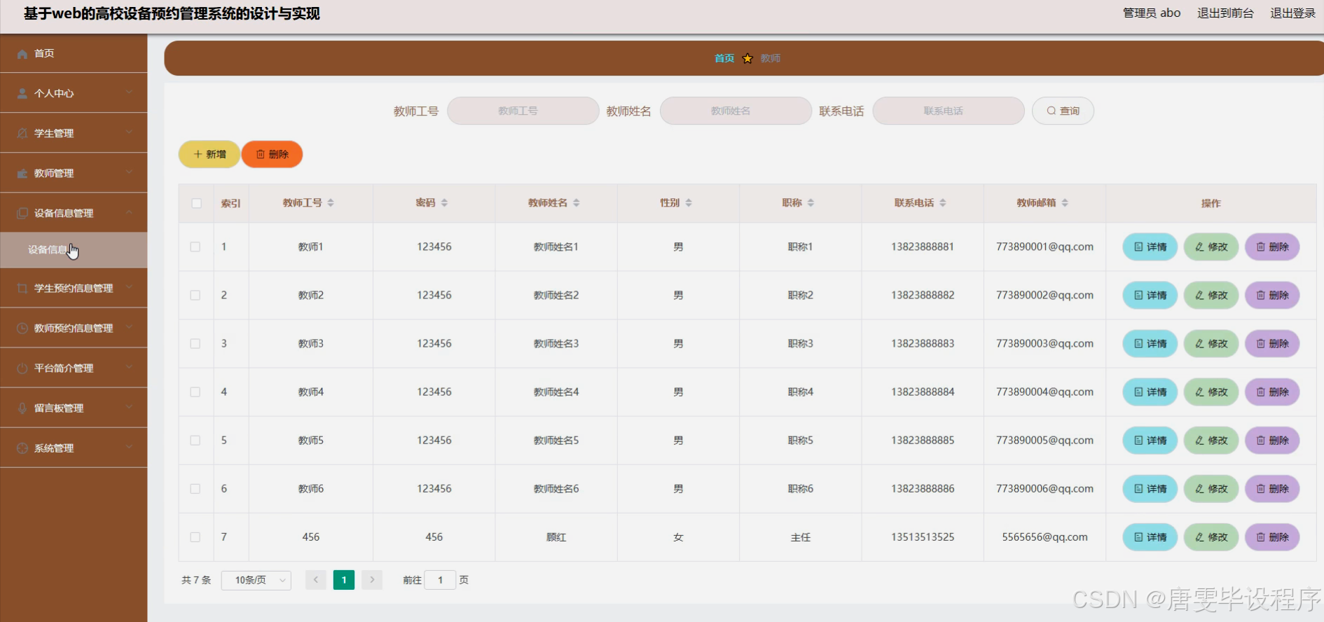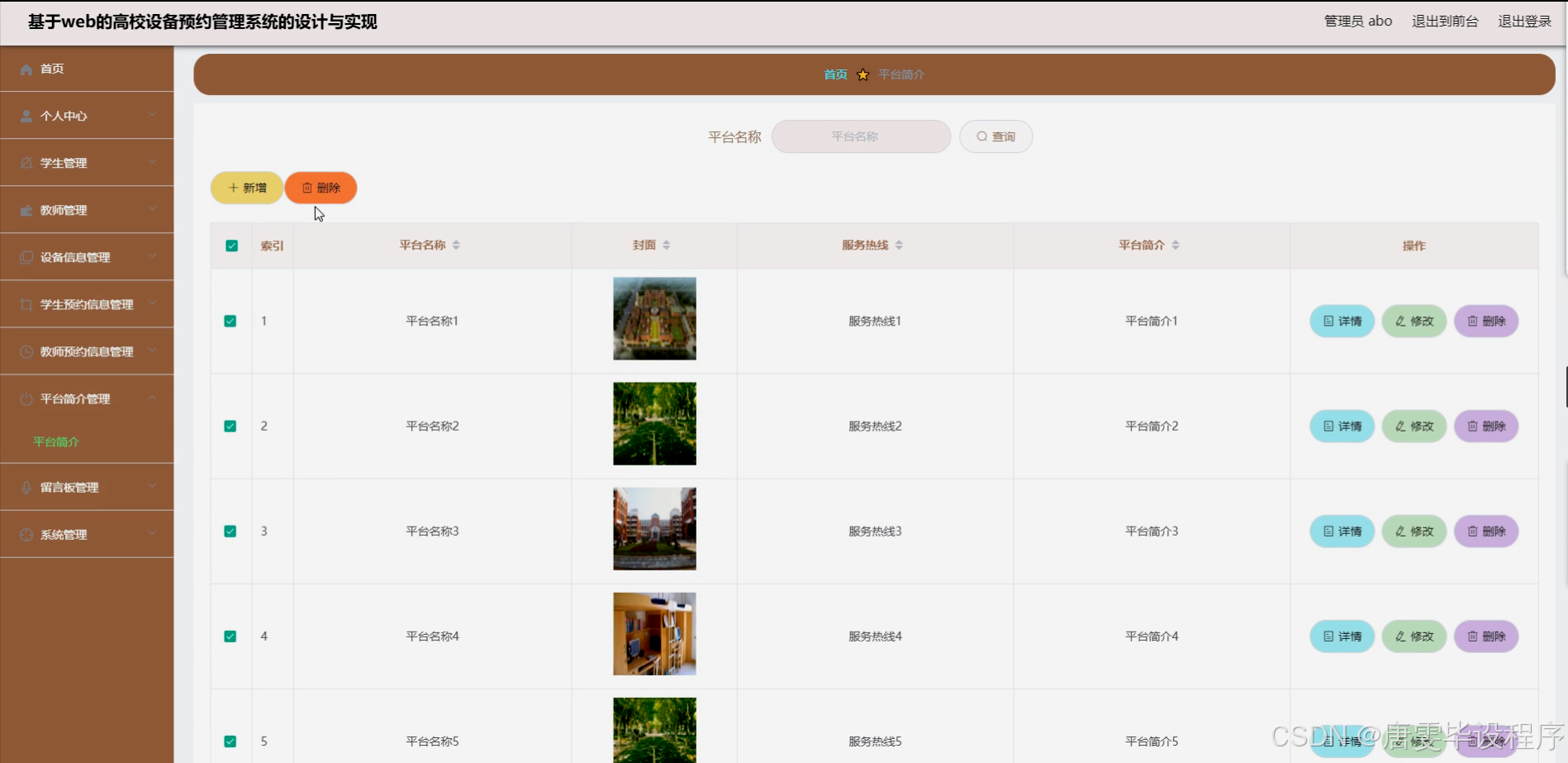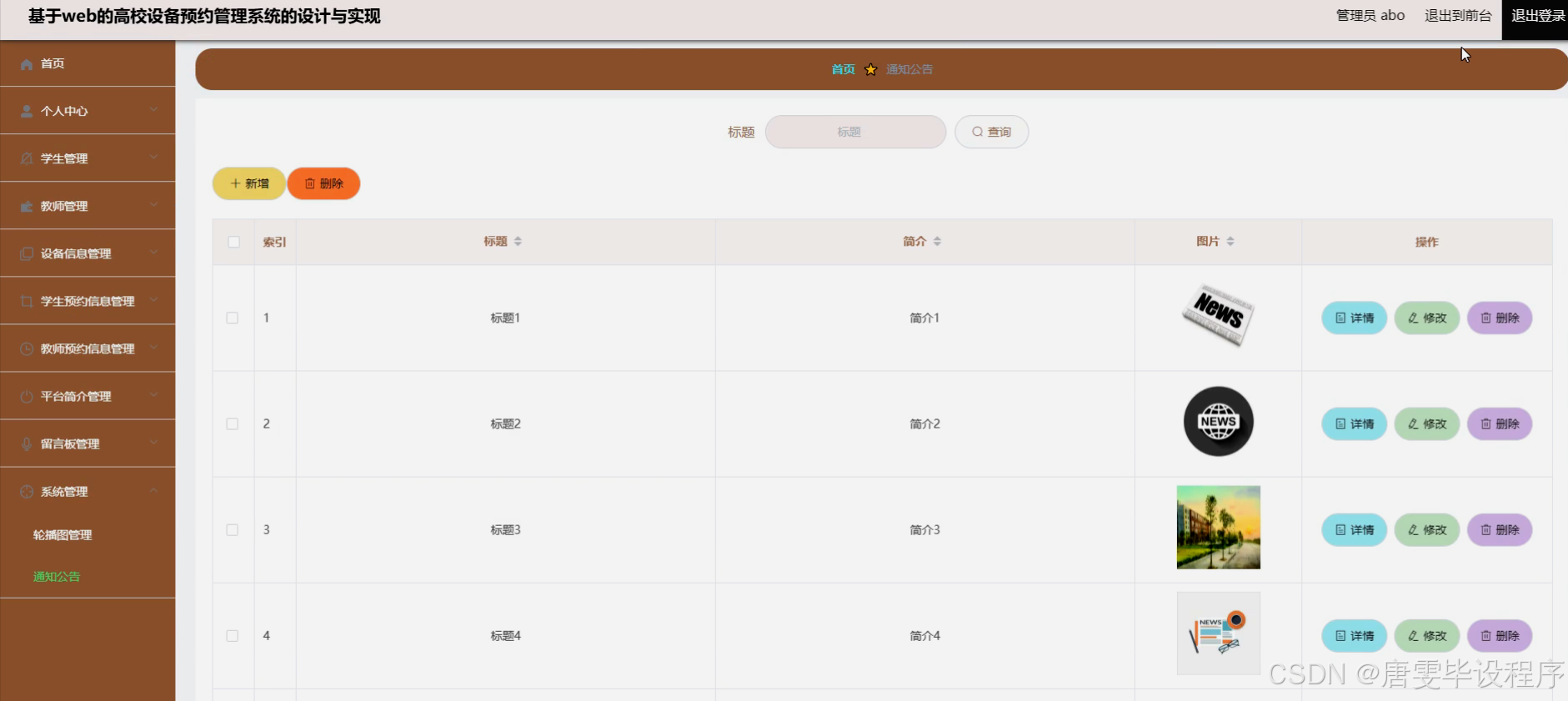本研究内容主要包括系统功能的设计与实现。系统需具备学生信息管理、教师信息管理、设备信息管理、学生预约信息管理、教师预约信息管理以及平台简介等功能模块。其中,学生信息管理模块和教师信息管理模块用于存储和管理用户的基本信息;设备信息管理模块用于展示设备的详细信息,包括设备名称、型号、数量、所在位置等;学生预约信息管理模块和教师预约信息管理模块则用于处理用户的预约请求,记录预约时间、地点等信息,并实时更新预约状态;平台简介模块则用于介绍系统的基本功能和使用方法,方便用户快速上手。通过这些功能模块的实现,系统将为用户提供全面、高效的设备预约管理服务。