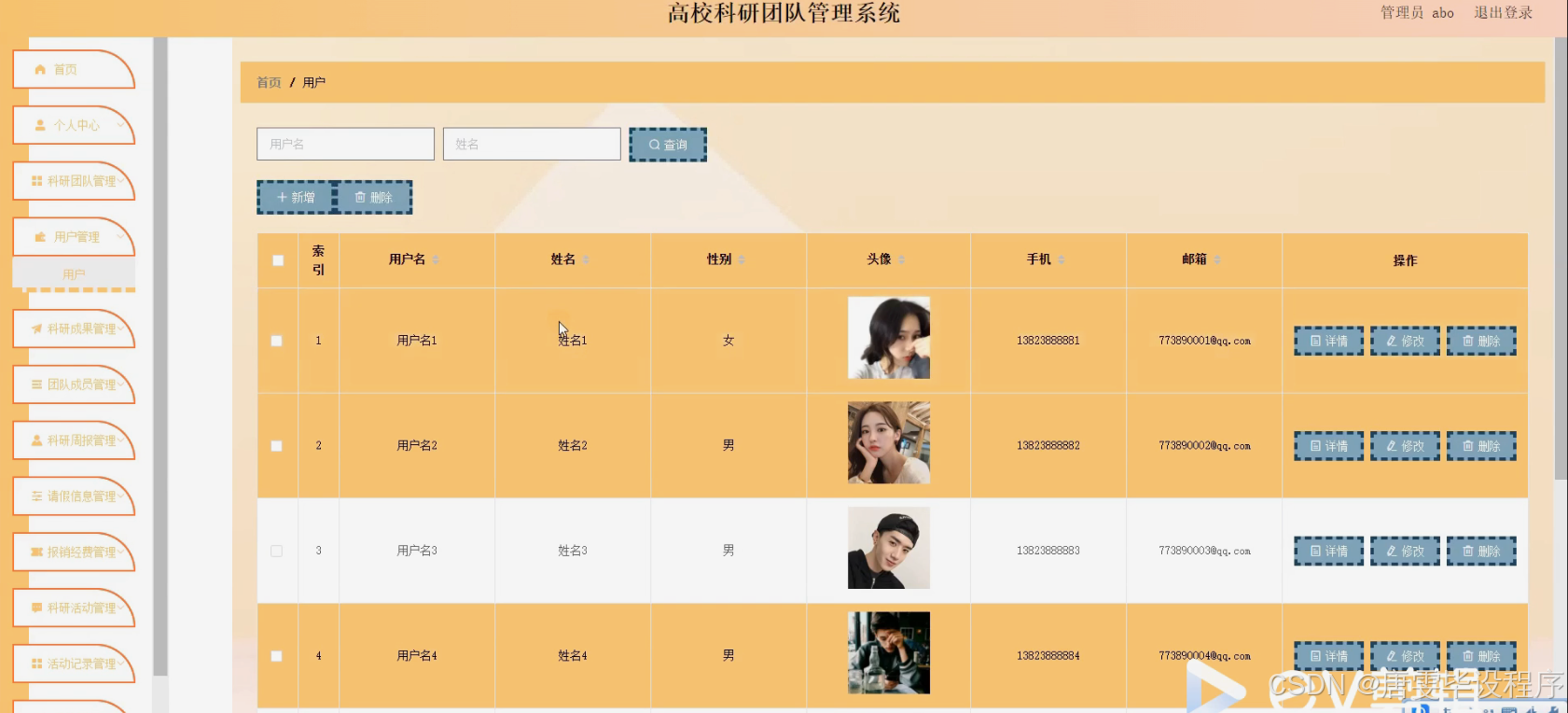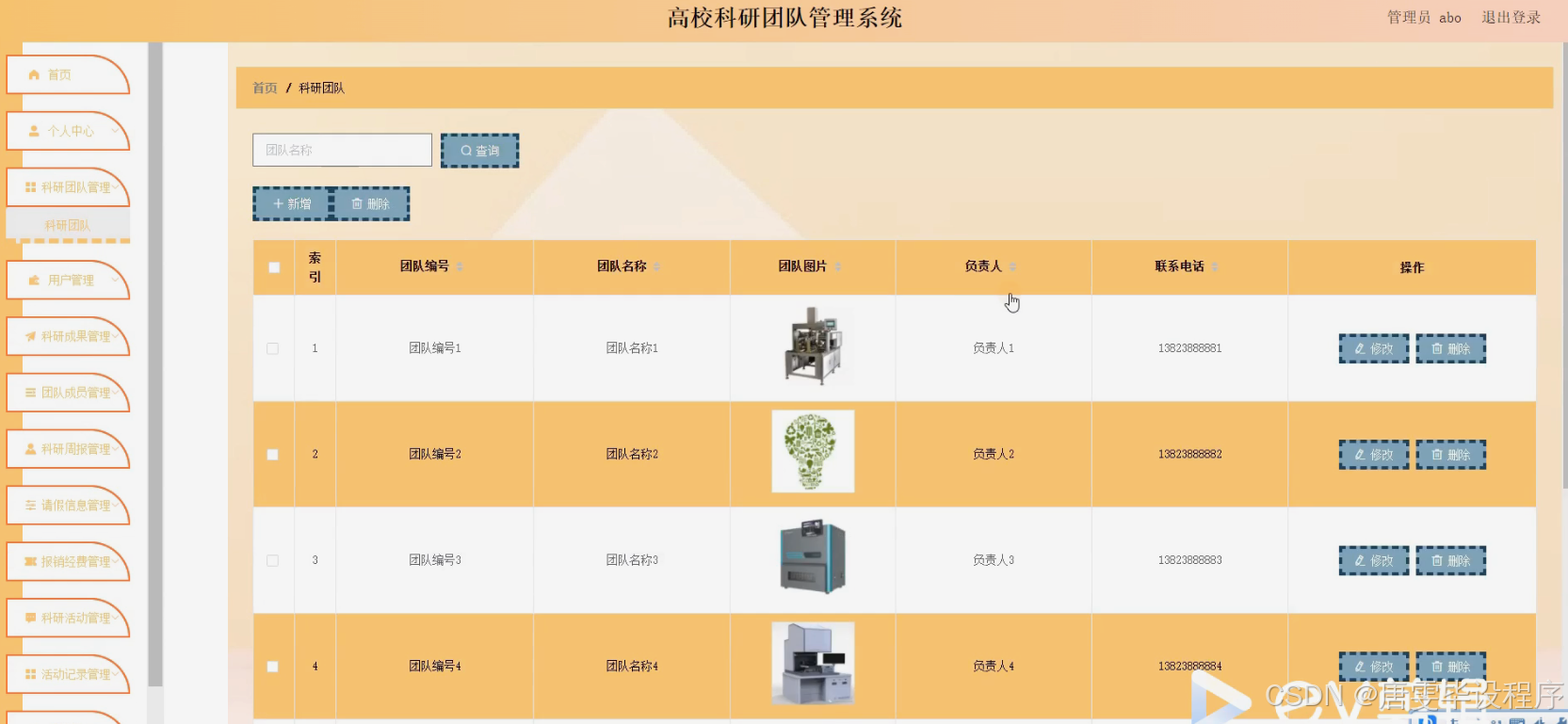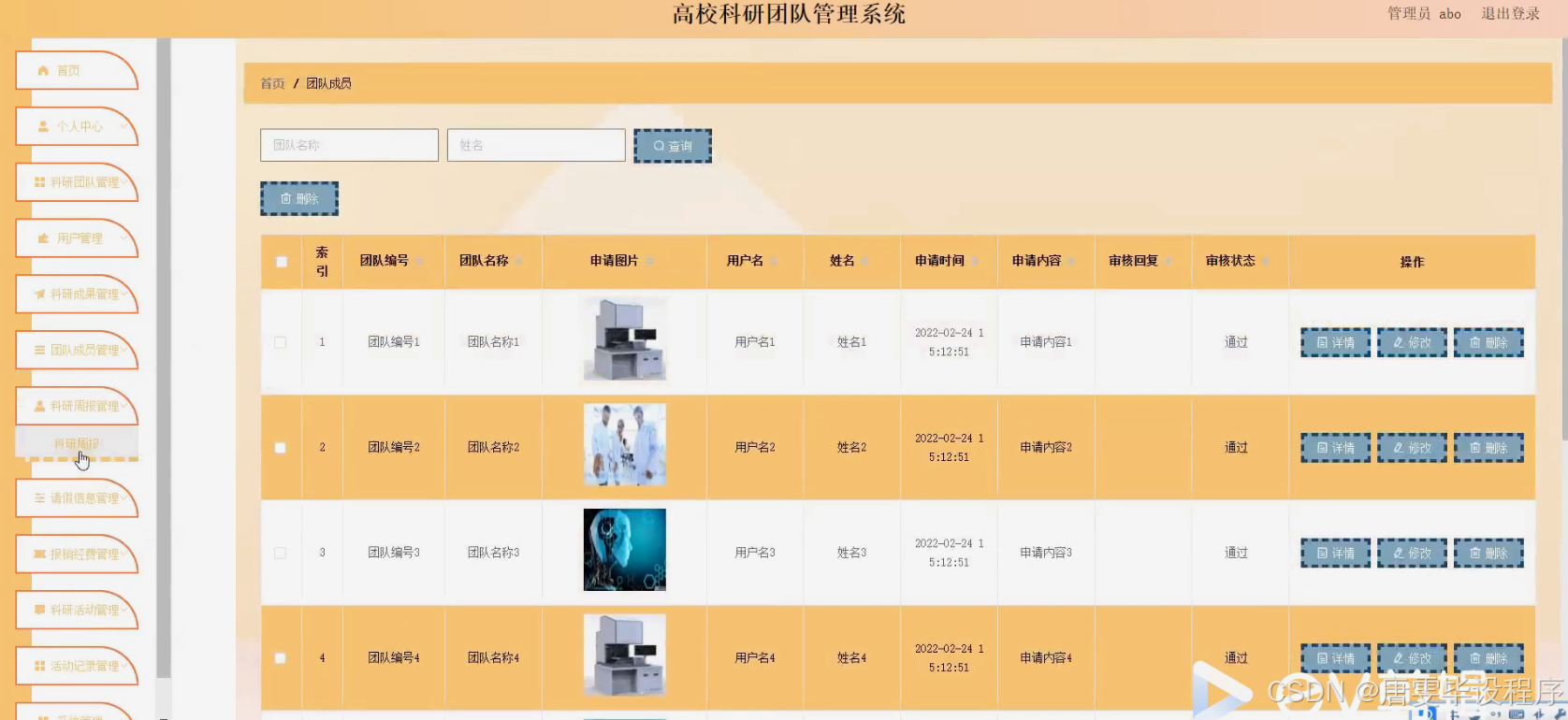 科研团队管理:实现科研团队的创建、编辑、删除和查询等功能,方便管理人员对团队信息进行集中管理。