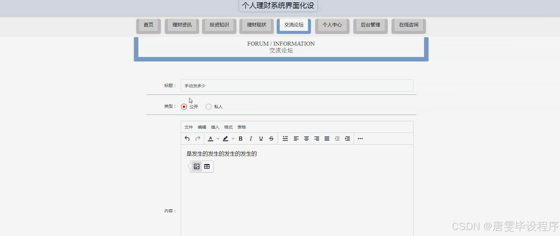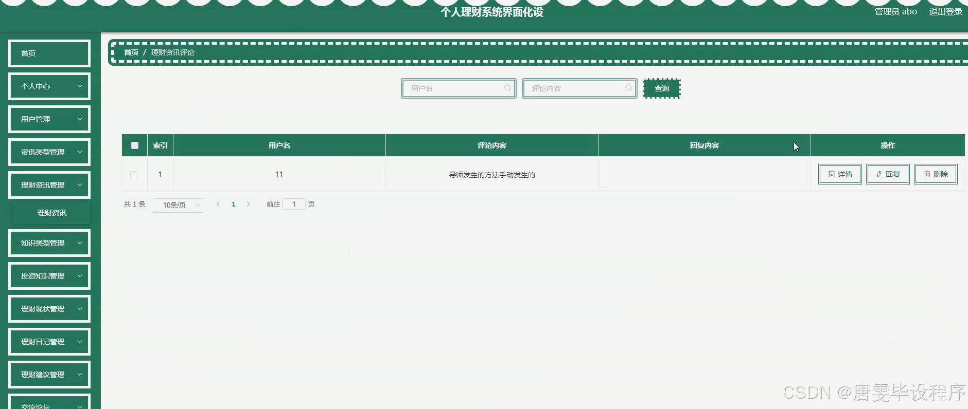 本研究将围绕个人理财系统的核心功能展开,具体包括用户信息管理模块,用于存储和管理用户的基本信息;资讯类型与理财资讯模块,用于收集和推送最新的市场动态和理财信息;理财现状分析模块,根据用户的财务数据,进行财务状况的评估和解读;投资知识库与知识类型模块,提供丰富的投资知识和案例,帮助用户提升理财技能;理财日记模块,允许用户记录每日的收支情况和理财心得;以及个性化理财建议模块,根据用户的财务状况和投资偏好,提供定制化的投资建议。通过这些功能模块的实现,构建一个全面、实用、易用的个人理财系统。