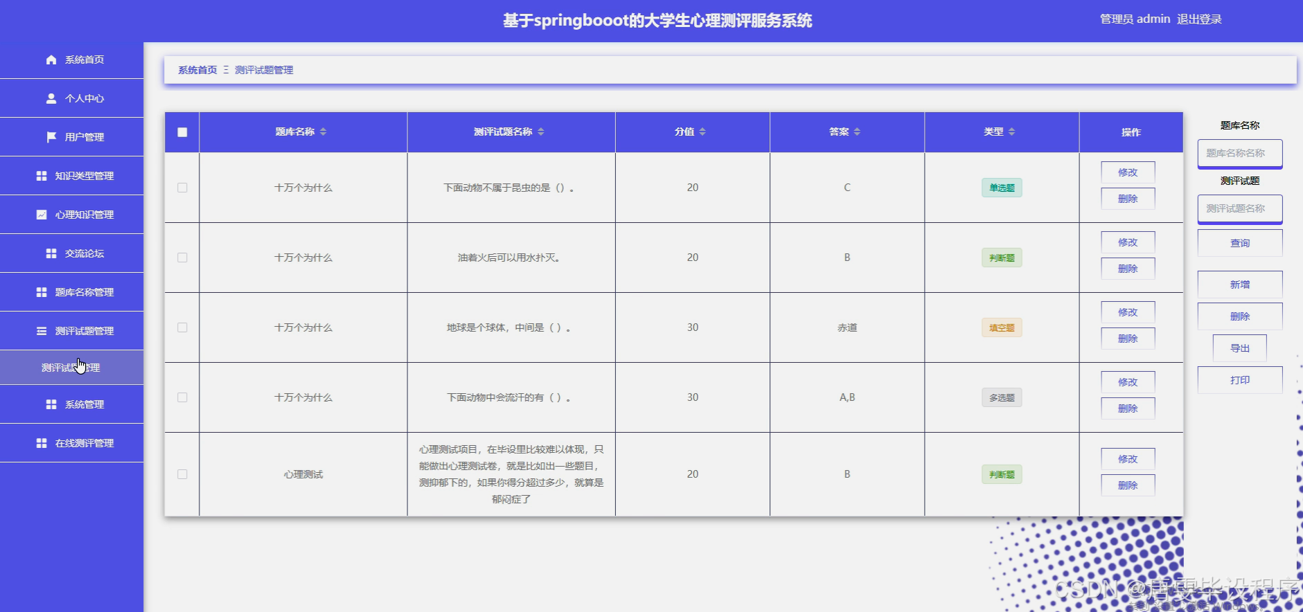 随着社会的快速发展和教育水平的普遍提升,大学生群体面临着前所未有的学业、就业、人际关系等多方面的压力。这些压力若得不到有效缓解,往往会导致一系列的心理问题,如焦虑、抑郁等,严重影响学生的身心健康和学业成就。因此,建立一套科学、全面的大学生心理测评服务系统显得尤为重要。该系统旨在通过科学的心理测评手段,及时发现并解决大学生的心理问题,为他们提供个性化的心理健康服务,从而保障其健康成长和全面发展。