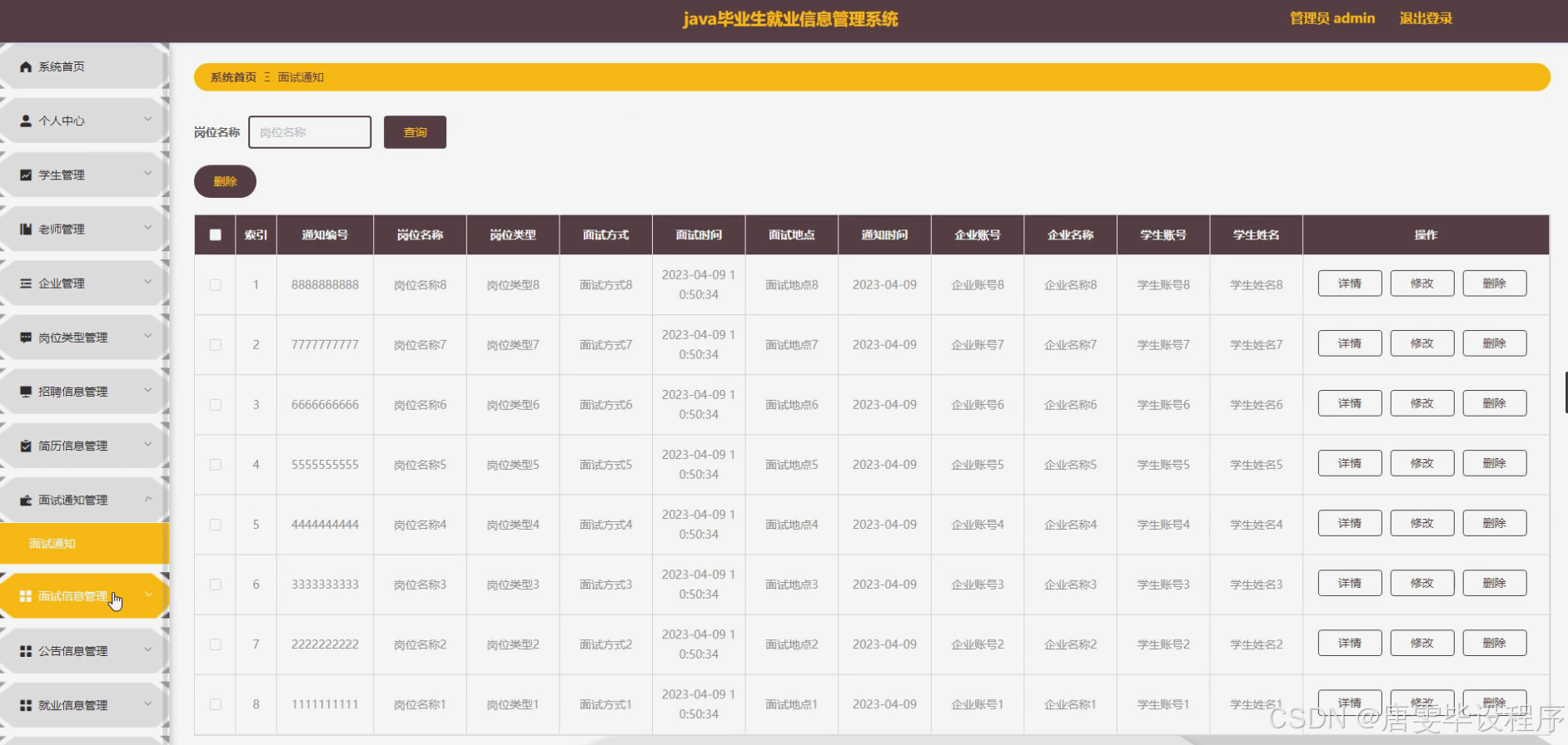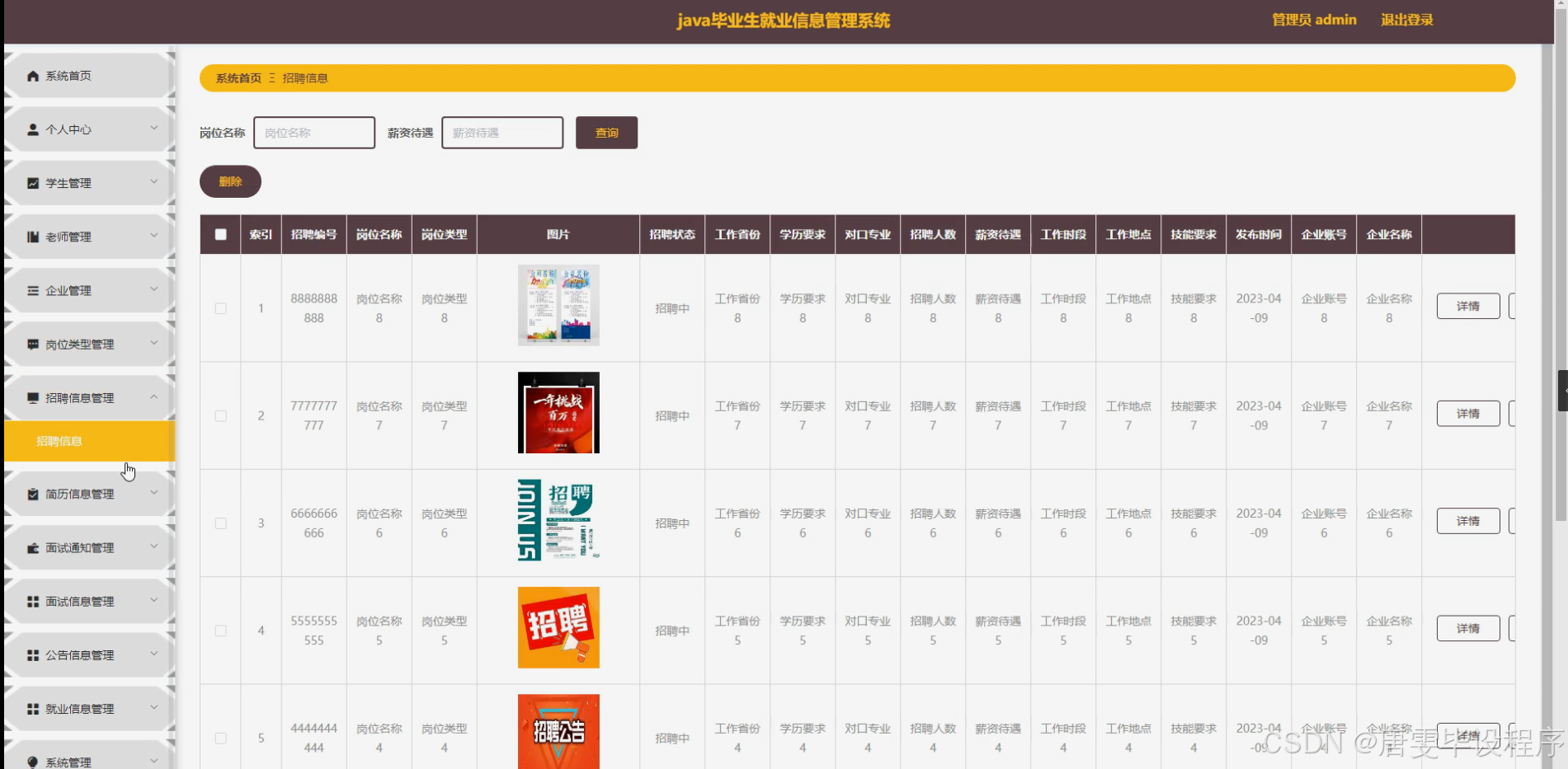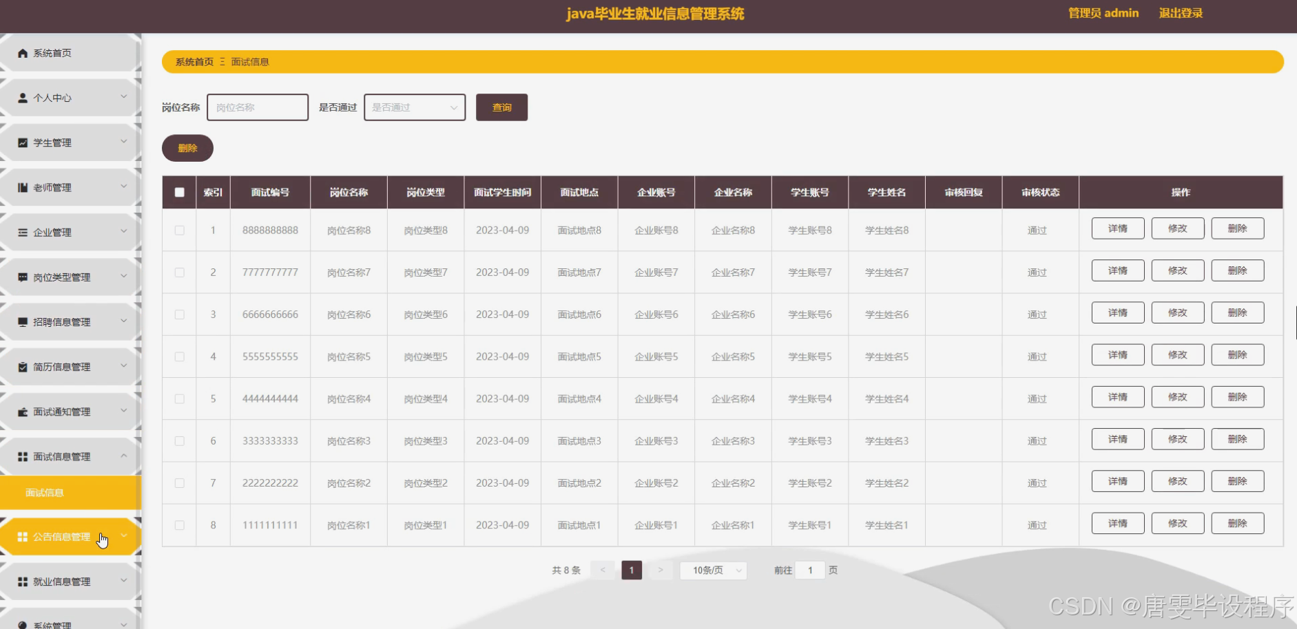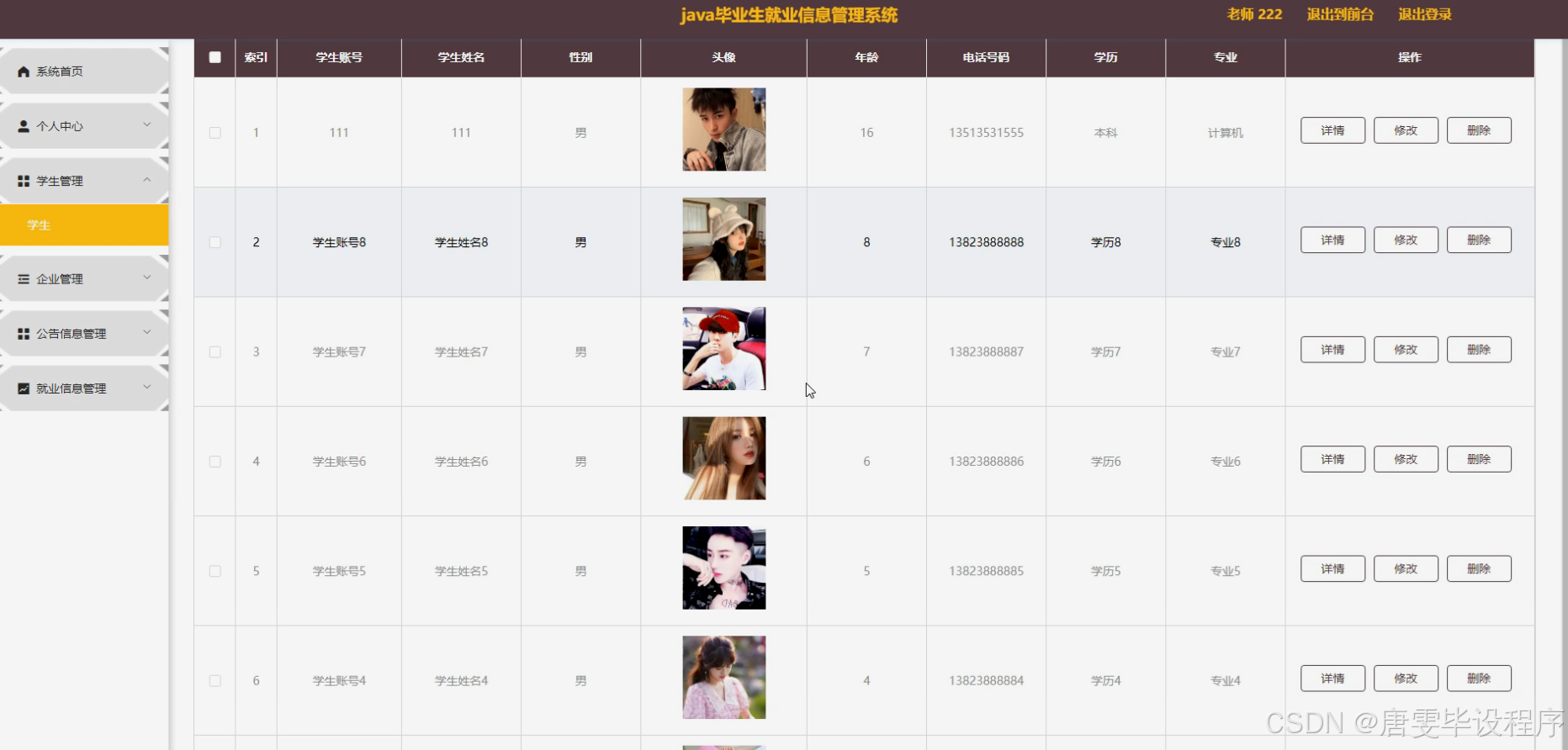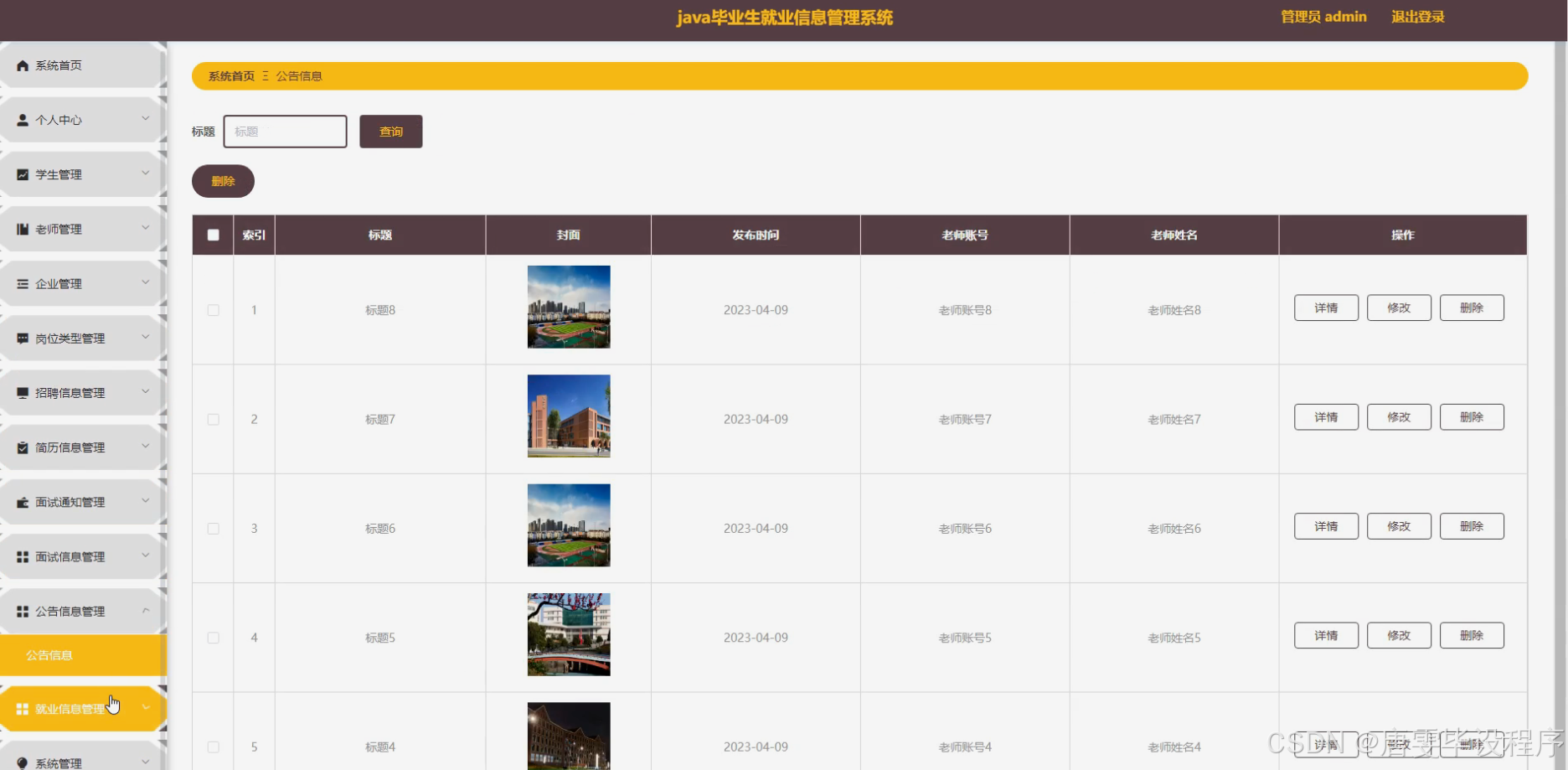 本研究将围绕高校毕业生就业信息管理系统的设计与实现展开,具体研究内容包括但不限于:学生信息管理模块,用于记录学生的基本信息、求职意向等;老师信息管理模块,用于提供老师对学生就业的指导和跟踪;企业信息管理模块,用于管理企业的基本信息、招聘岗位等;岗位类型管理模块,用于分类展示不同类型的岗位;招聘信息管理模块,用于发布和更新企业的招聘信息;简历信息管理模块,用于学生上传和管理个人简历;面试通知管理模块,用于向学生发送面试邀请和提醒;面试信息管理模块,用于记录面试过程和结果;公告信息管理模块,用于发布就业相关的通知和公告;就业信息管理模块,用于记录学生的就业情况和去向;分院信息管理模块,用于按学院或专业分类管理学生的就业信息。通过这些模块的设计和实现,构建一个功能全面、操作便捷的高校毕业生就业信息管理系统。