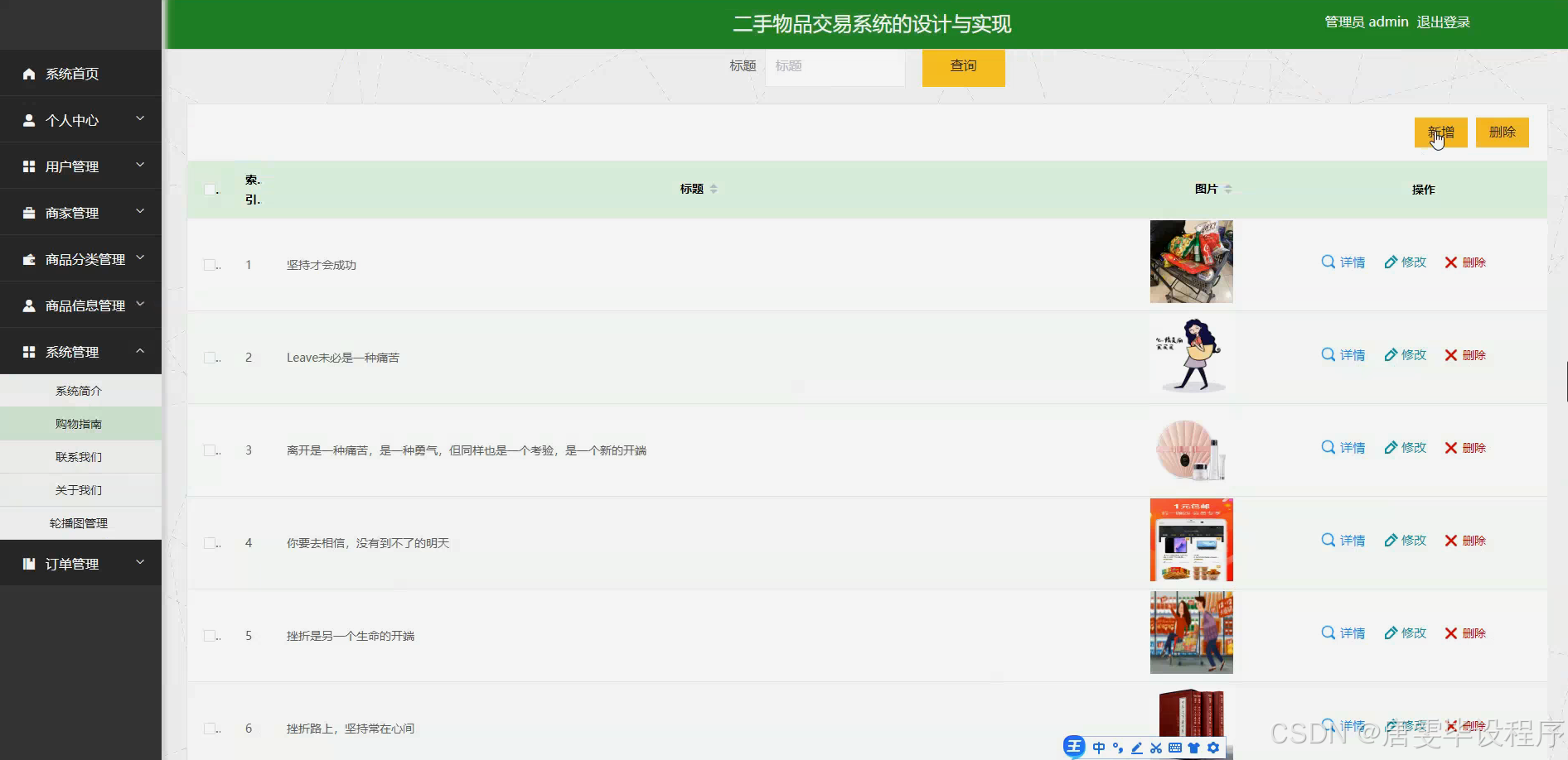 本研究旨在设计并实现一个功能完善的二手物品交易系统,以满足当前社会对二手物品交易的需求。通过该系统,用户能够方便地发布和搜索二手物品信息,商家能够展示自己的商品并吸引潜在买家。同时,系统还提供商品分类、商品信息展示等功能,以提升交易的便捷性和安全性。本研究旨在通过该系统的实现,推动二手物品交易的规范化、信息化发展,为资源的循环利用和可持续发展贡献力量。