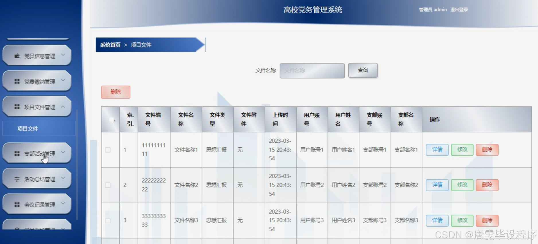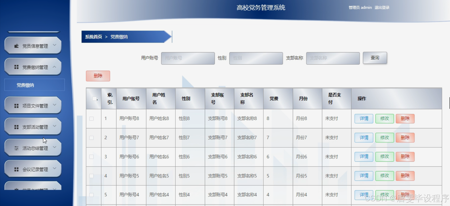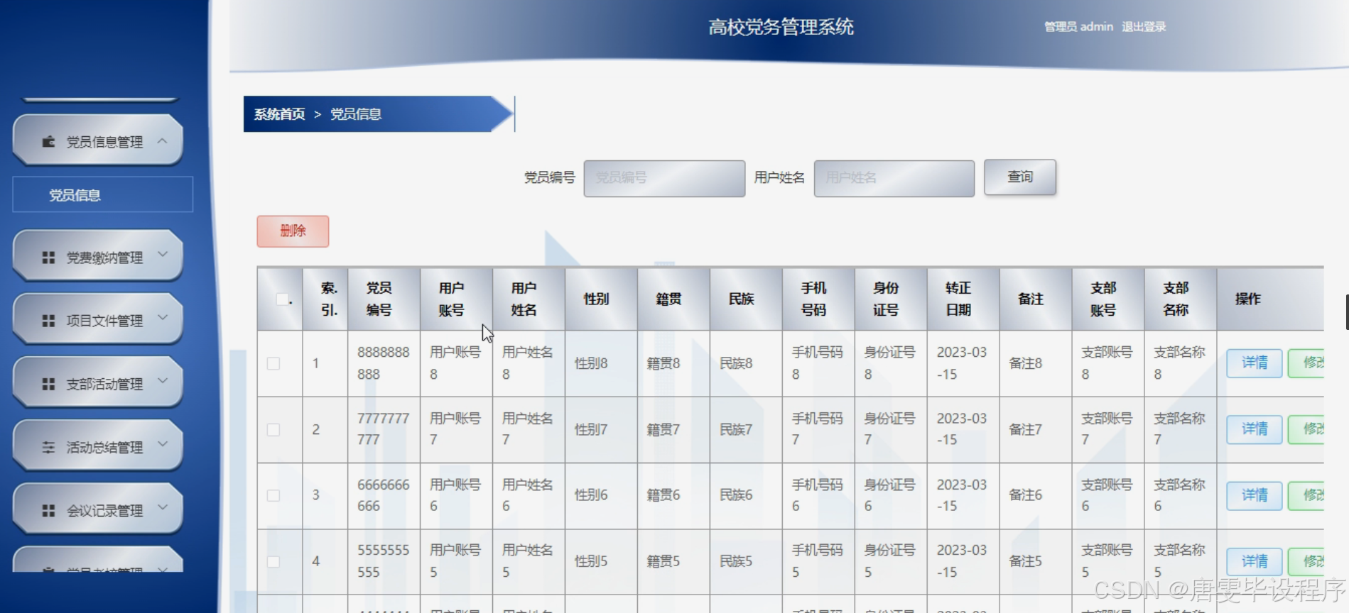 随着信息技术的飞速发展和高校党建工作的不断深入,传统的手工党务管理方式已难以满足当前高校党务工作的需求。高校党务工作涉及党支部管理、党费缴纳、项目文件归档、支部活动组织、活动总结撰写、用户信息管理、入党申请处理、党员信息维护、会议记录保存以及党员考核等多个方面,这些工作繁琐且复杂,需要高效、准确的管理系统来支撑。因此,开发一套集信息化、智能化、便捷化于一体的高校党务管理系统,对于提升高校党务工作效率、加强党员管理、促进党建工作规范化具有重要意义。