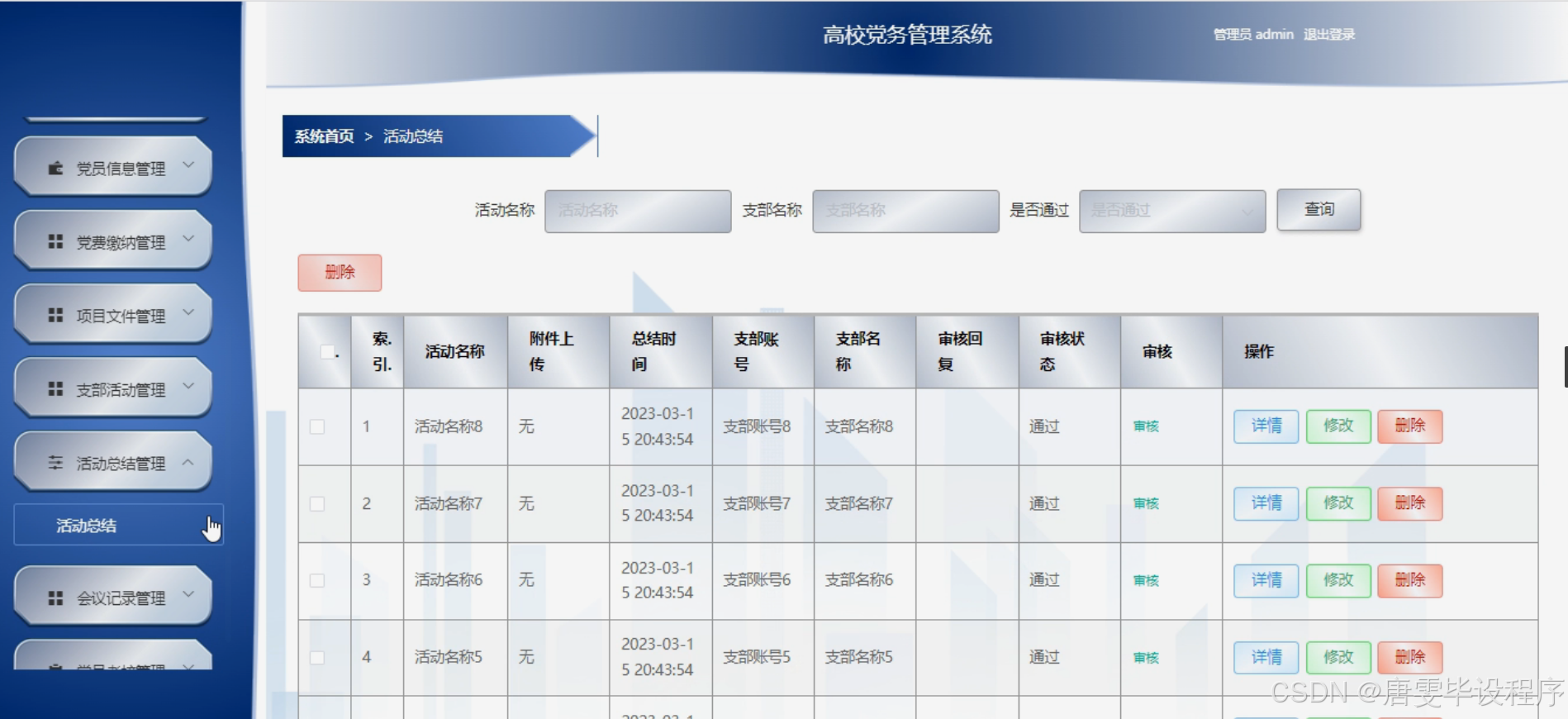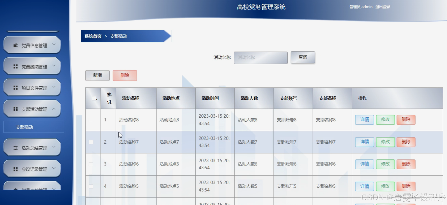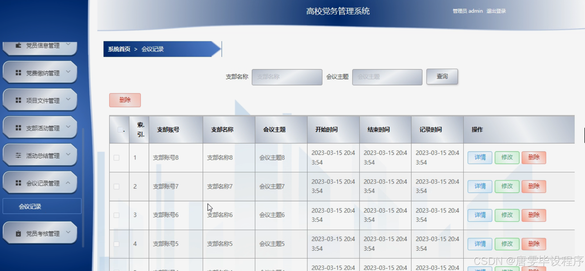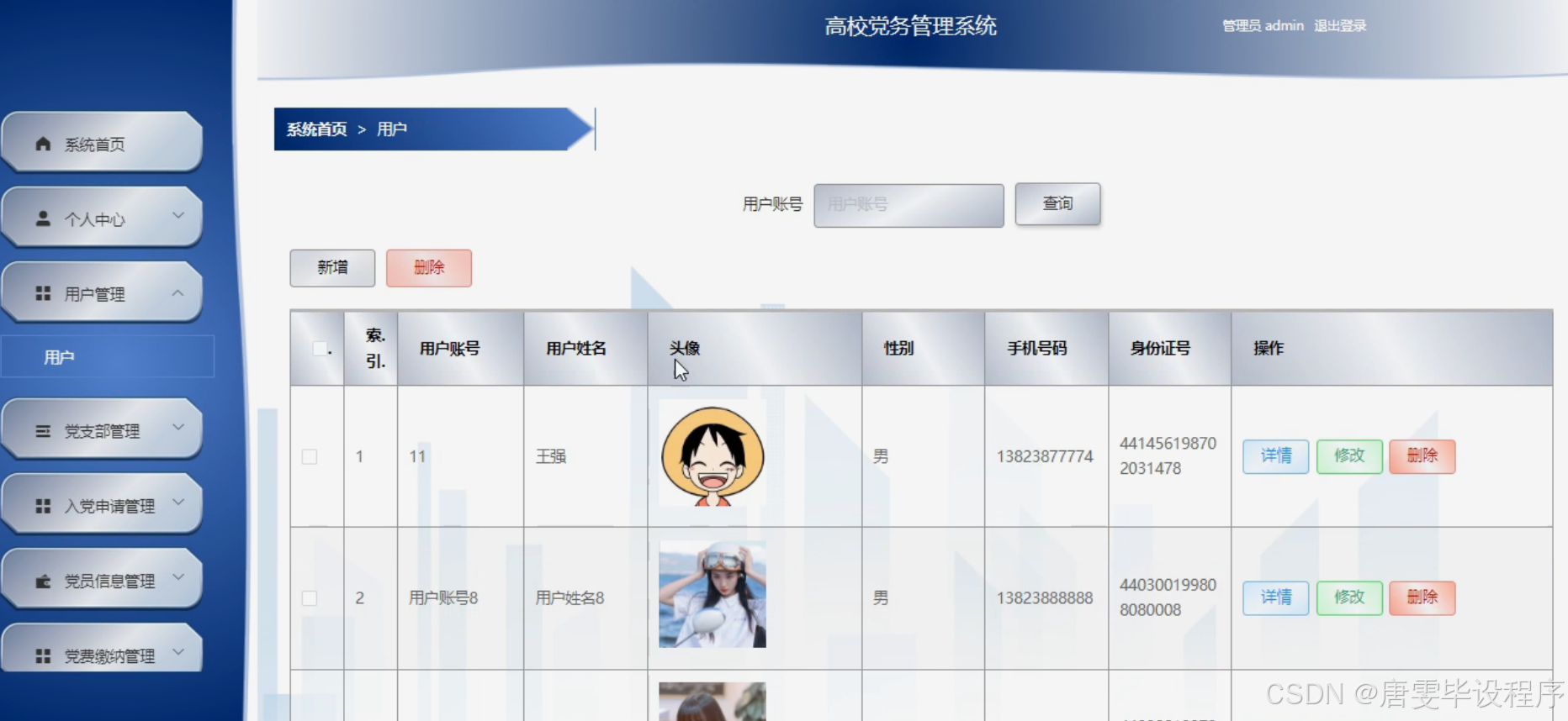 随着信息技术的飞速发展和高校党建工作的不断深入,传统的手工党务管理方式已难以满足当前高校党务工作的需求。高校党务工作涉及党支部管理、党费缴纳、项目文件归档、支部活动组织、活动总结撰写、用户信息管理、入党申请处理、党员信息维护、会议记录保存以及党员考核等多个方面,这些工作繁琐且复杂,需要高效、准确的管理系统来支撑。因此,开发一套集信息化、智能化、便捷化于一体的高校党务管理系统,对于提升高校党务工作效率、加强党员管理、促进党建工作规范化具有重要意义。