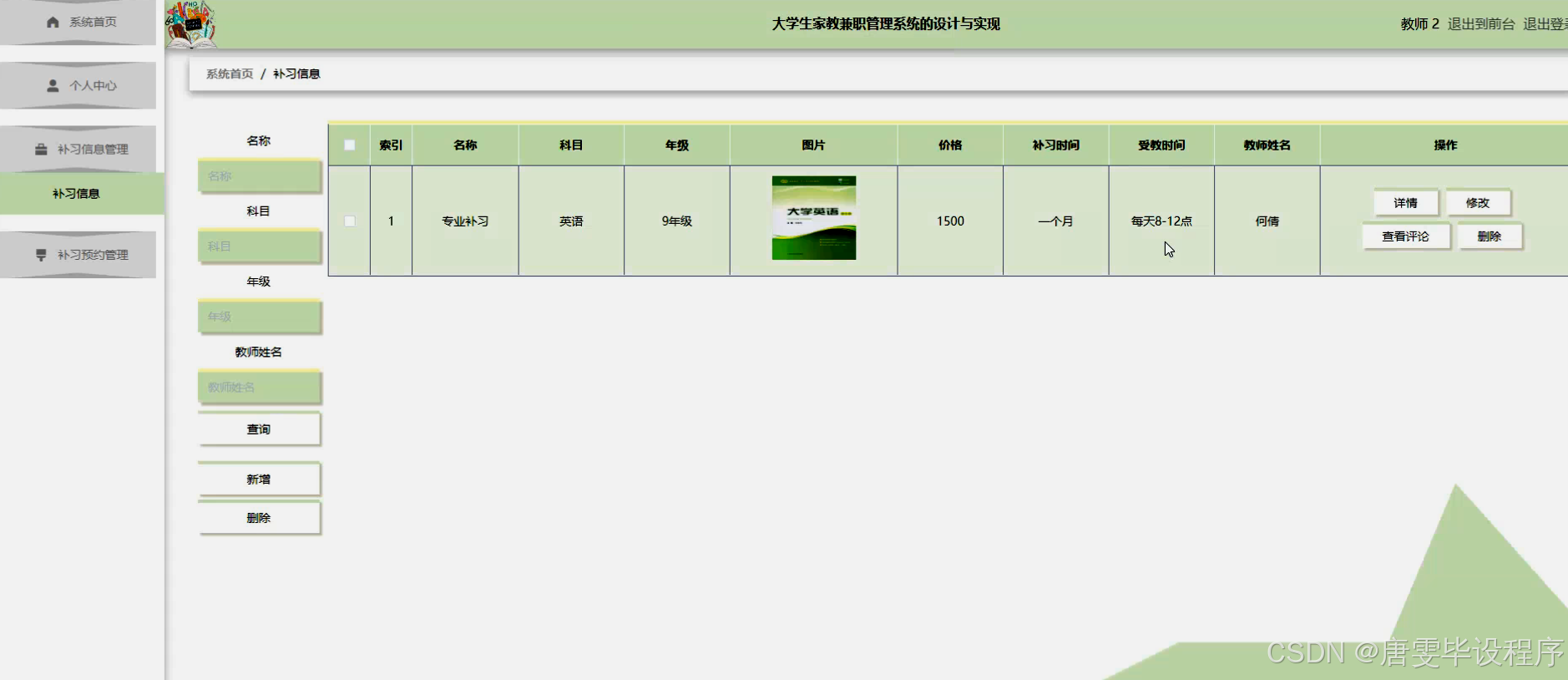 本系统将围绕学员管理、教师管理、补习信息管理以及补习预约四大核心功能展开设计。学员管理模块将实现学员信息的录入、查询和更新,为学员提供个性化的家教服务推荐;教师管理模块则负责教师信息的注册、审核和展示,确保教师资源的优质可靠;补习信息管理模块将整合各类补习课程信息,包括课程内容、时间、地点等,供学员参考选择;补习预约模块则实现学员与教师之间的在线预约和确认功能,确保补习活动的顺利进行。此外,系统还将设计合理的用户权限管理和数据安全机制,保障用户信息的隐私性和安全性。