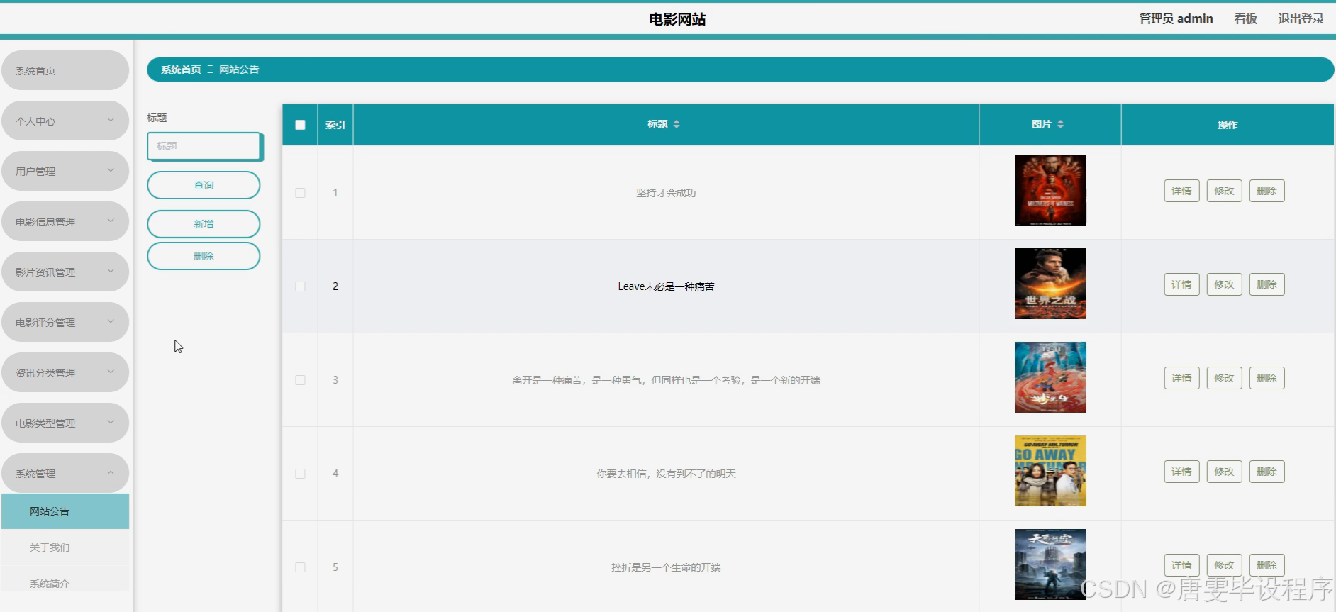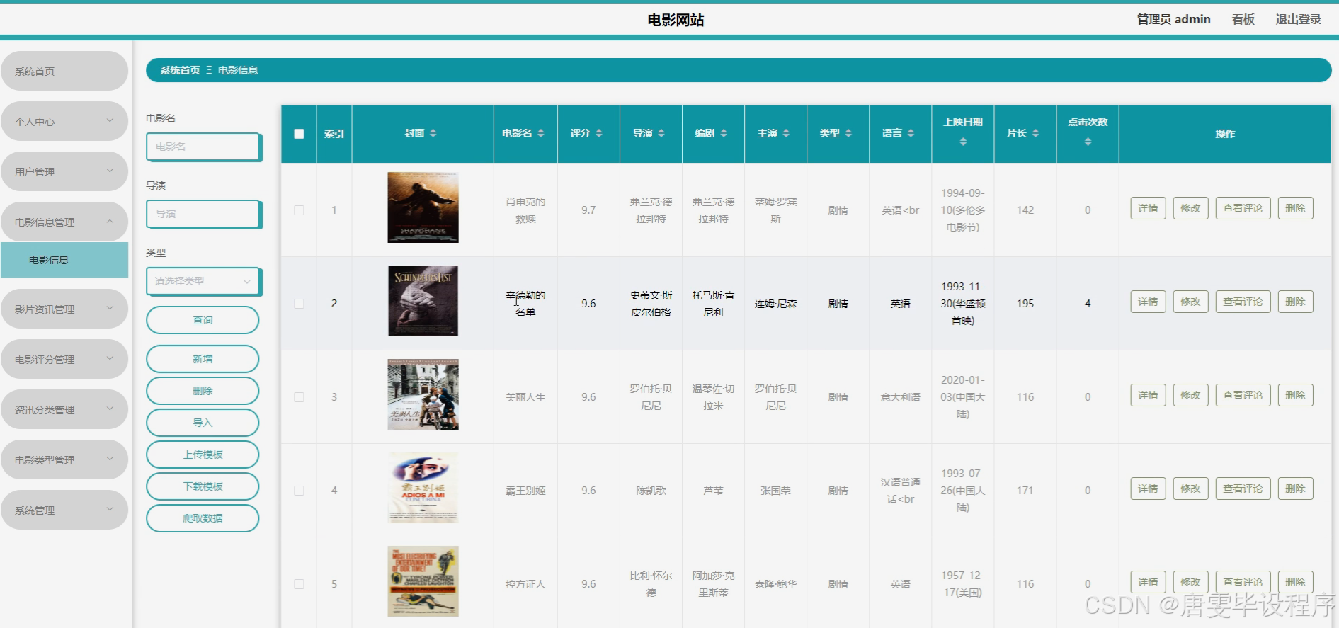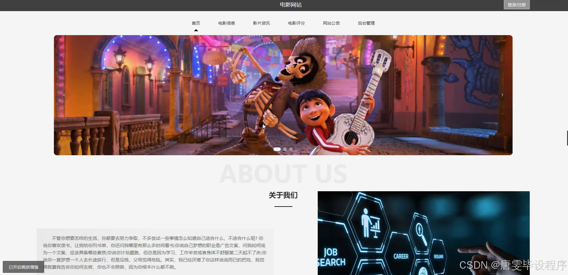 本研究的主要目的是开发一个功能完善、用户体验优良的电影网站,以满足用户对电影信息的多元化需求。通过整合电影信息查询、用户管理、影片资讯发布等功能模块,构建一个集资讯、娱乐、互动于一体的综合性平台。同时,通过电影评分、资讯分类、电影类型筛选等功能的实现,提升用户的观影体验和参与度。此外,本研究还将探索如何通过热门影片和最新影片的推荐算法,提高网站的流量和用户粘性,为电影网站的长期发展奠定坚实基础。