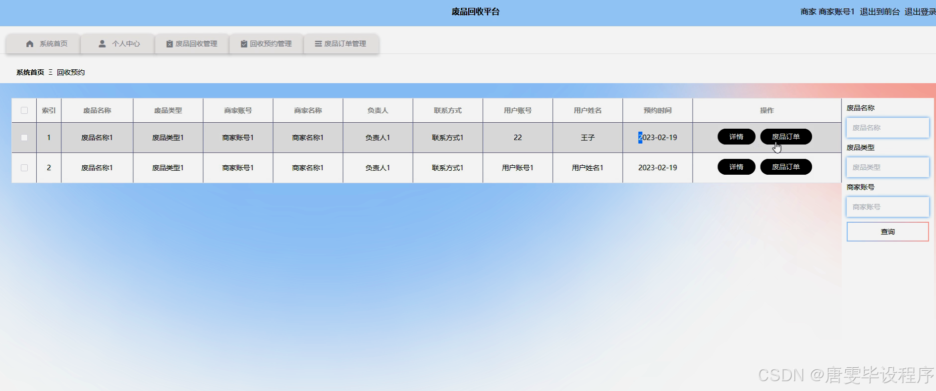 本研究旨在设计并实现一个功能完善的废品回收平台,以满足商家和用户对于废品回收的多样化需求。通过该平台,商家可以便捷地发布废品回收信息,接收用户预约,并管理废品订单;用户则可以轻松查询废品类型,预约回收服务,并实时跟踪订单状态。最终,通过优化资源配置,提高回收效率,实现废品处理的减量化、资源化和无害化目标。