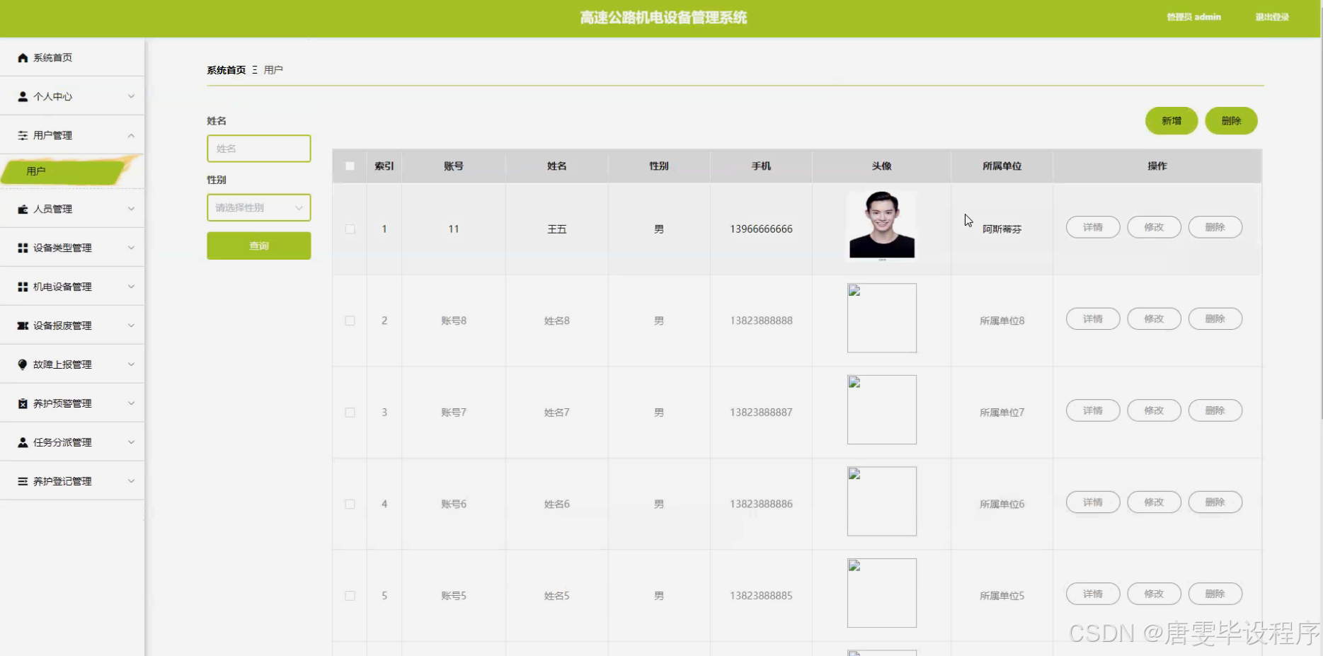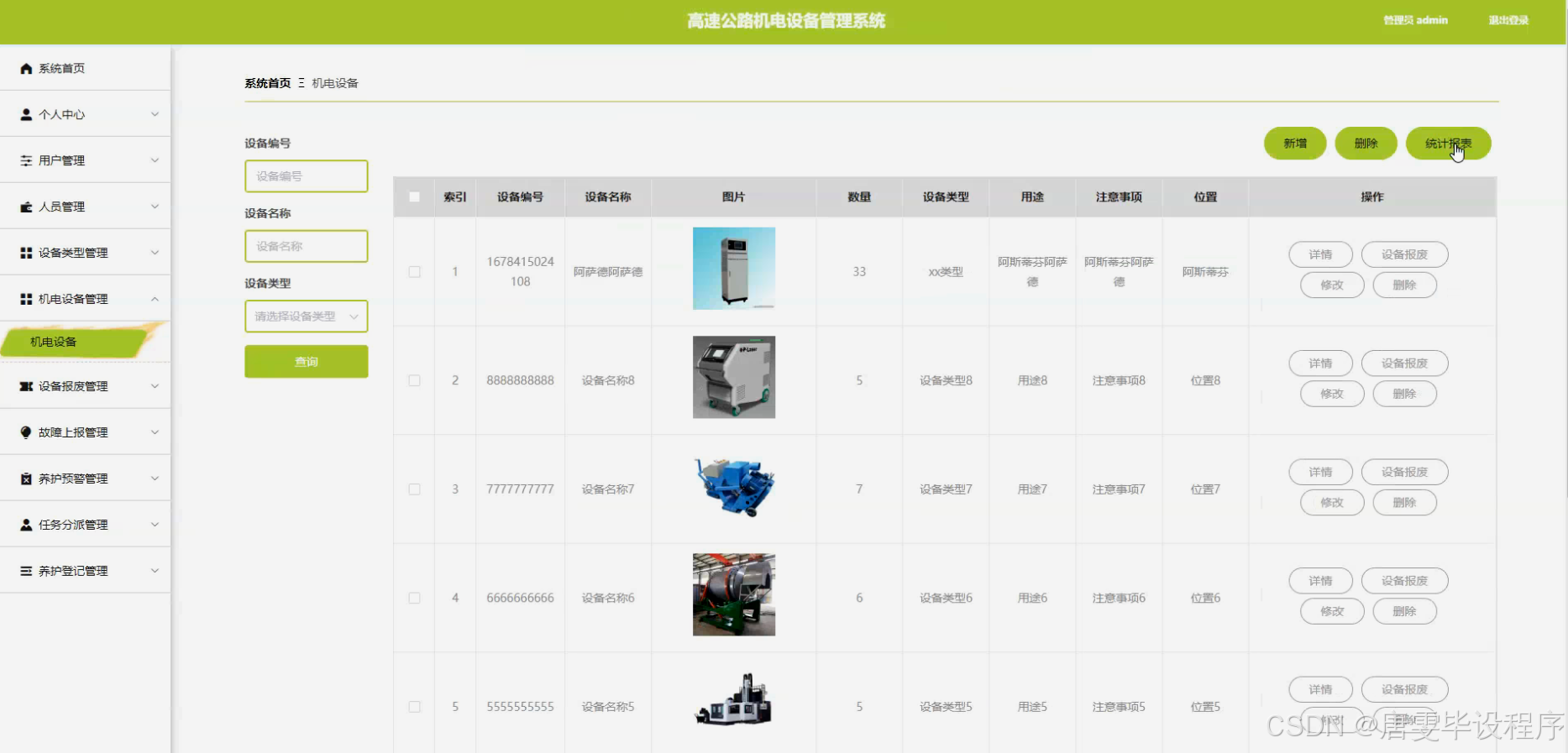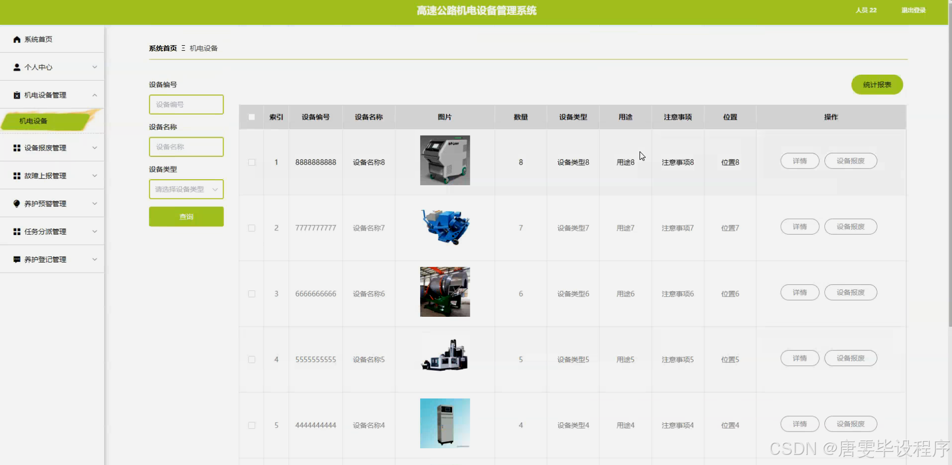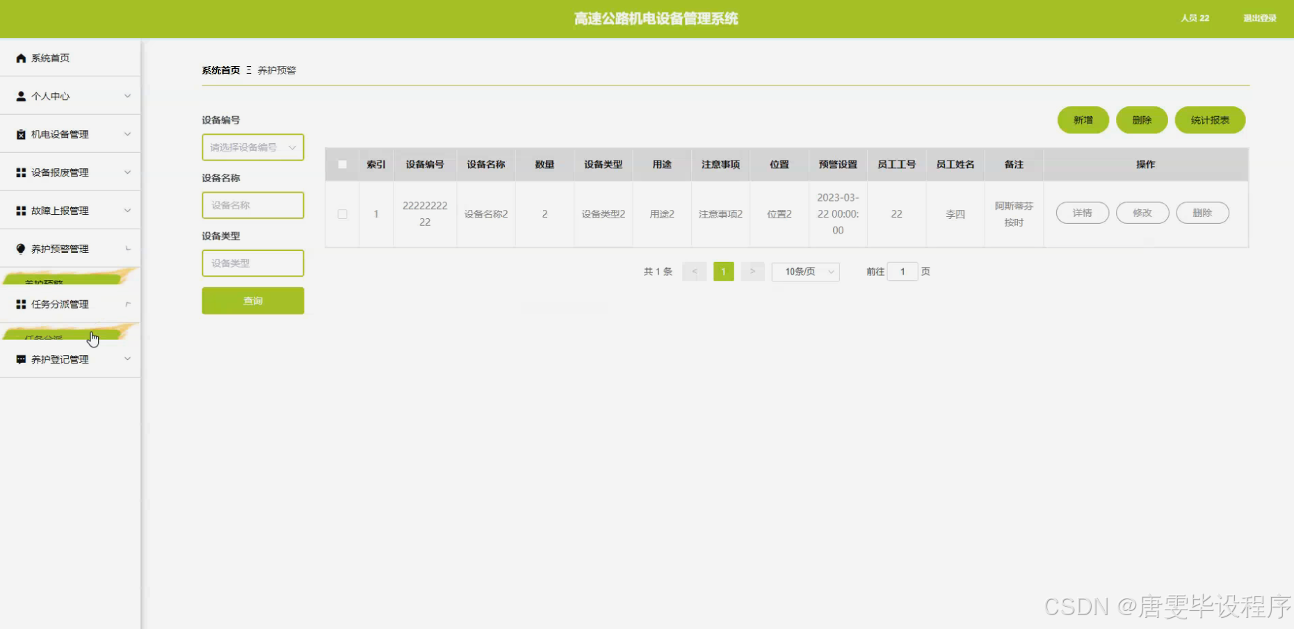 本研究旨在设计并实现一套功能完善、操作便捷的高速公路机电设备管理系统,以实现对机电设备的高效、智能管理。通过该系统,实现对代维人员、设备类型、机电设备、设备报废、故障上报、集团职工、养护预警、任务分派、维护登记、单位等关键信息的全面整合与管理,提高设备管理的透明度与效率,降低管理成本,为高速公路的安全、畅通运行提供坚实保障。