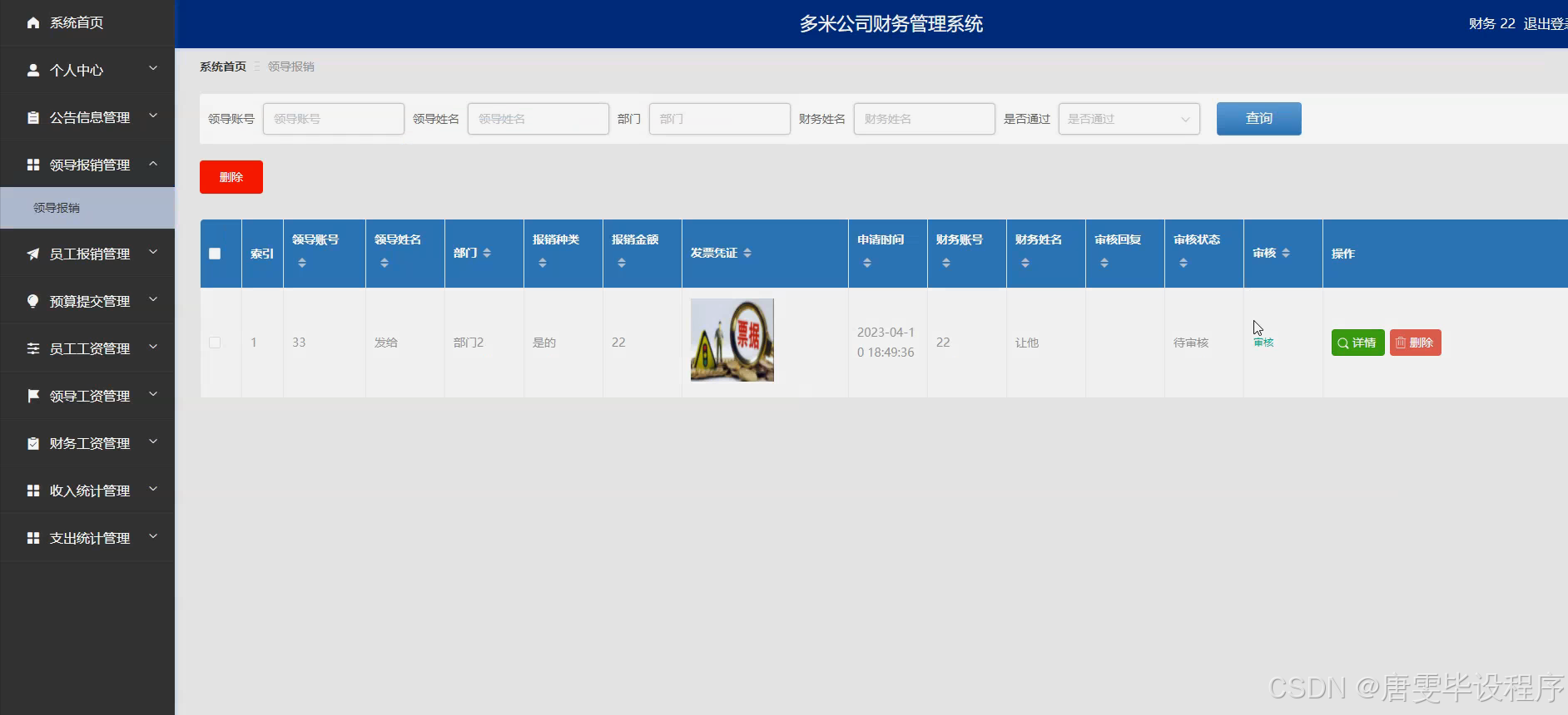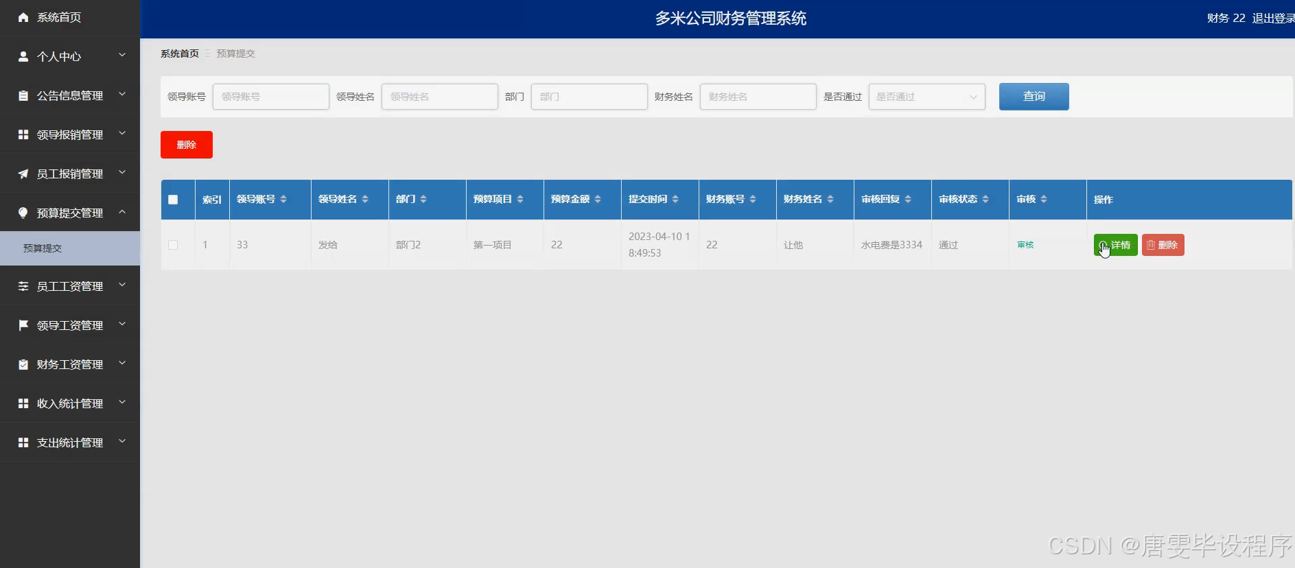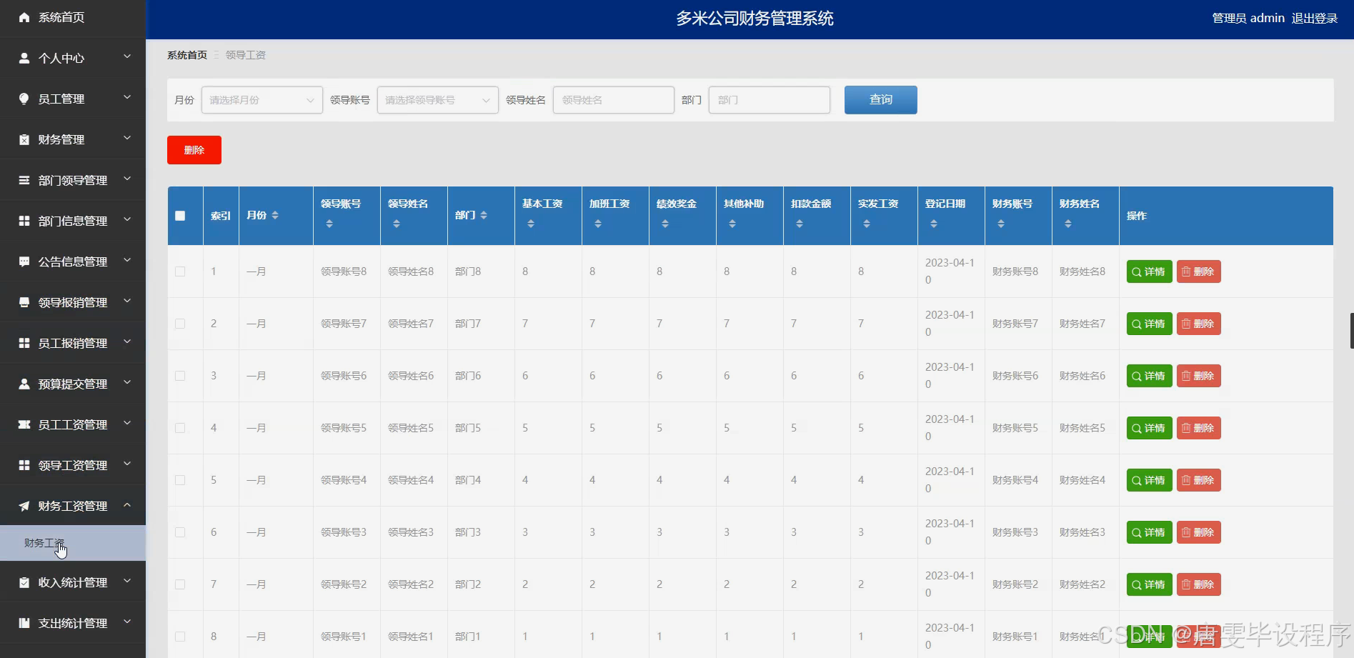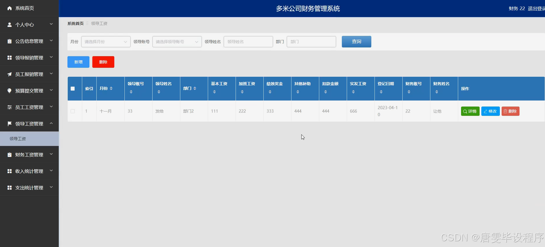 本研究的主要目的是设计并开发一套符合多米公司实际需求的财务管理系统,该系统应具备员工信息管理、财务信息管理、部门信息管理、员工工资管理、员工报销审批、部门领导审批、公告信息发布、领导报销处理、预算提交与审核、领导工资管理、财务工资管理、收入统计分析与支出统计分析等核心功能。通过该系统的实施,旨在实现财务管理的全面优化,提升企业的决策支持能力,增强企业的市场竞争力,为多米公司的长期稳定发展奠定坚实的基础。