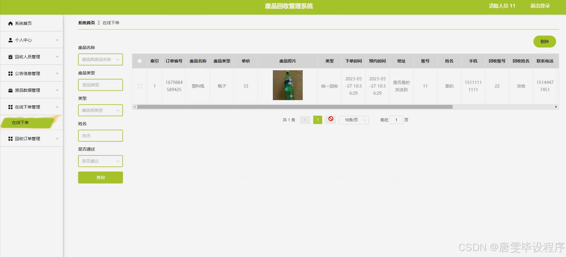 本研究旨在设计并实现一个功能完善的废品回收管理系统,以提高废品回收的智能化水平。通过该系统,用户可以方便地进行在线下单、查询废品类型、查看回收订单等操作;同时,系统还能够对清除人员、回收人员以及废品数据进行有效管理,确保回收过程的透明化和规范化。本研究旨在通过技术手段解决传统废品回收方式中存在的问题,推动废品回收行业的转型升级,为环保事业贡献力量。