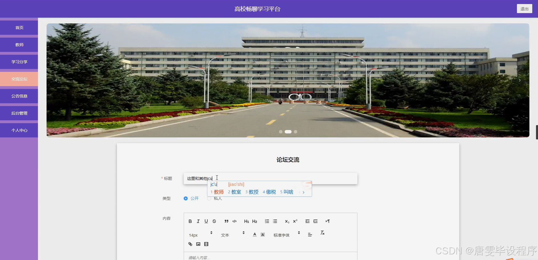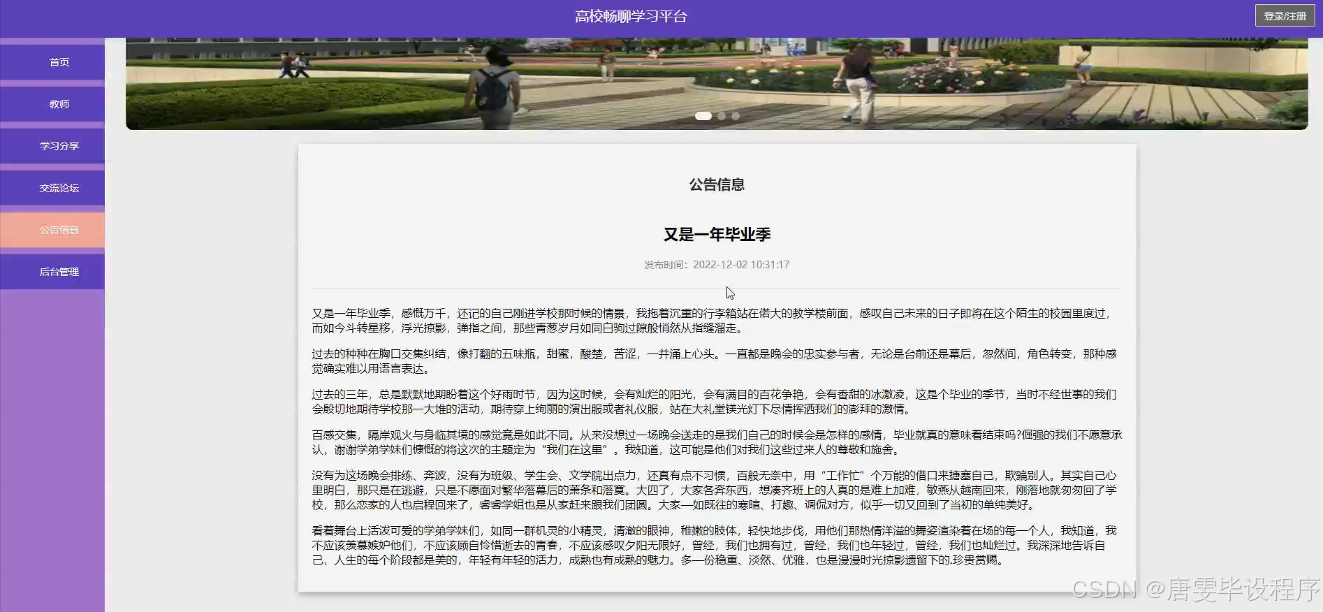 随着信息技术的飞速发展和互联网应用的普及,教育领域正经历着深刻的变革。在高校环境中,学生们面临着繁重的课业负担和多样的学习资源选择,而教师们则承担着教学、科研和学生指导等多重任务。传统的学习方式和沟通渠道已难以满足当前高校师生的需求。因此,构建一个高效、便捷的高校畅聊学习平台显得尤为重要。该平台旨在打破时空限制,促进师生间的交流与互动,提高学习效率,营造积极向上的学习氛围。近年来,虽然已有一些学习平台出现,但它们在功能设计、用户体验和安全性等方面仍存在不足,难以满足高校师生的个性化需求。