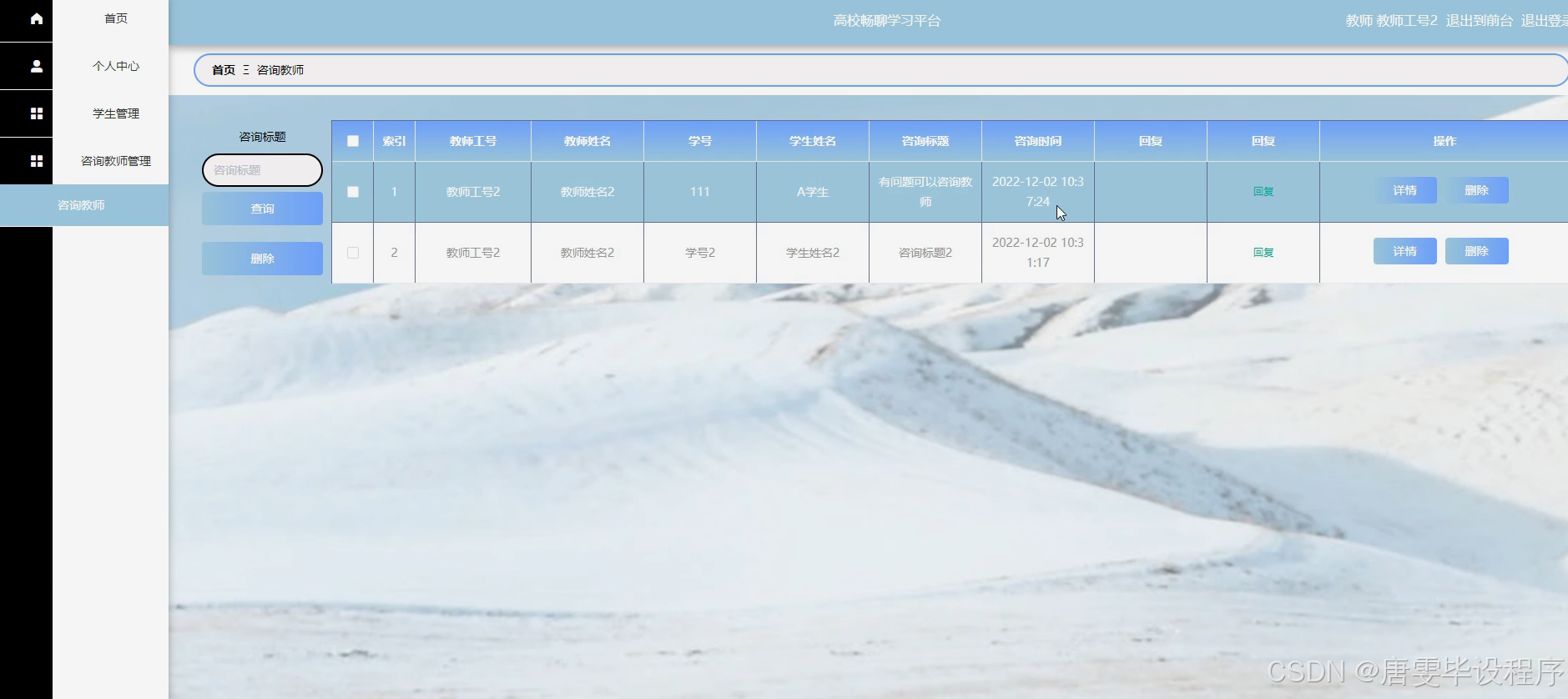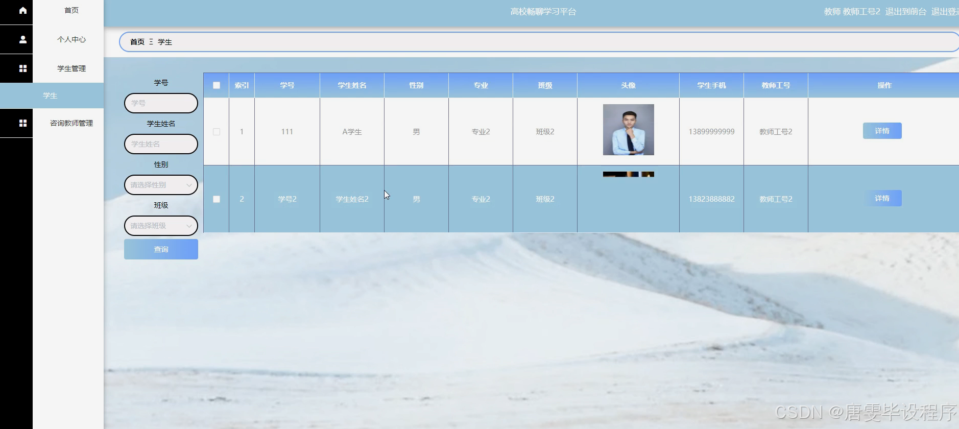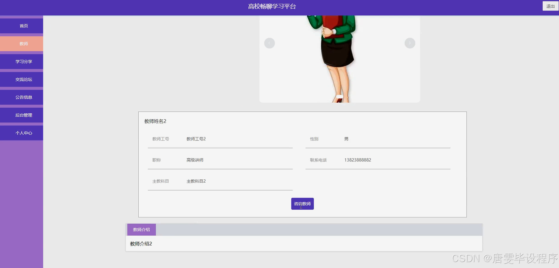 本研究将围绕高校畅聊学习平台的系统设计与实现展开,具体包括学生、教师、班级、专业、咨询教师和学习分享等系统功能。在学生功能方面,平台将提供个人资料管理、学习资源浏览与下载、学习讨论区参与等功能;在教师功能方面,将实现课程管理、作业发布与批改、学生答疑等功能;班级功能将包括班级公告发布、班级成员管理、班级讨论区等;专业功能则涉及专业资讯推送、专业论坛交流等;咨询教师功能将允许学生向指定教师发起咨询请求,并进行一对一或多人在线答疑;学习分享功能则鼓励学生分享学习笔记、心得体会等,促进知识共享与互助学习。通过这些功能的实现,平台将形成一个集学习、交流、分享于一体的综合性学习社区。