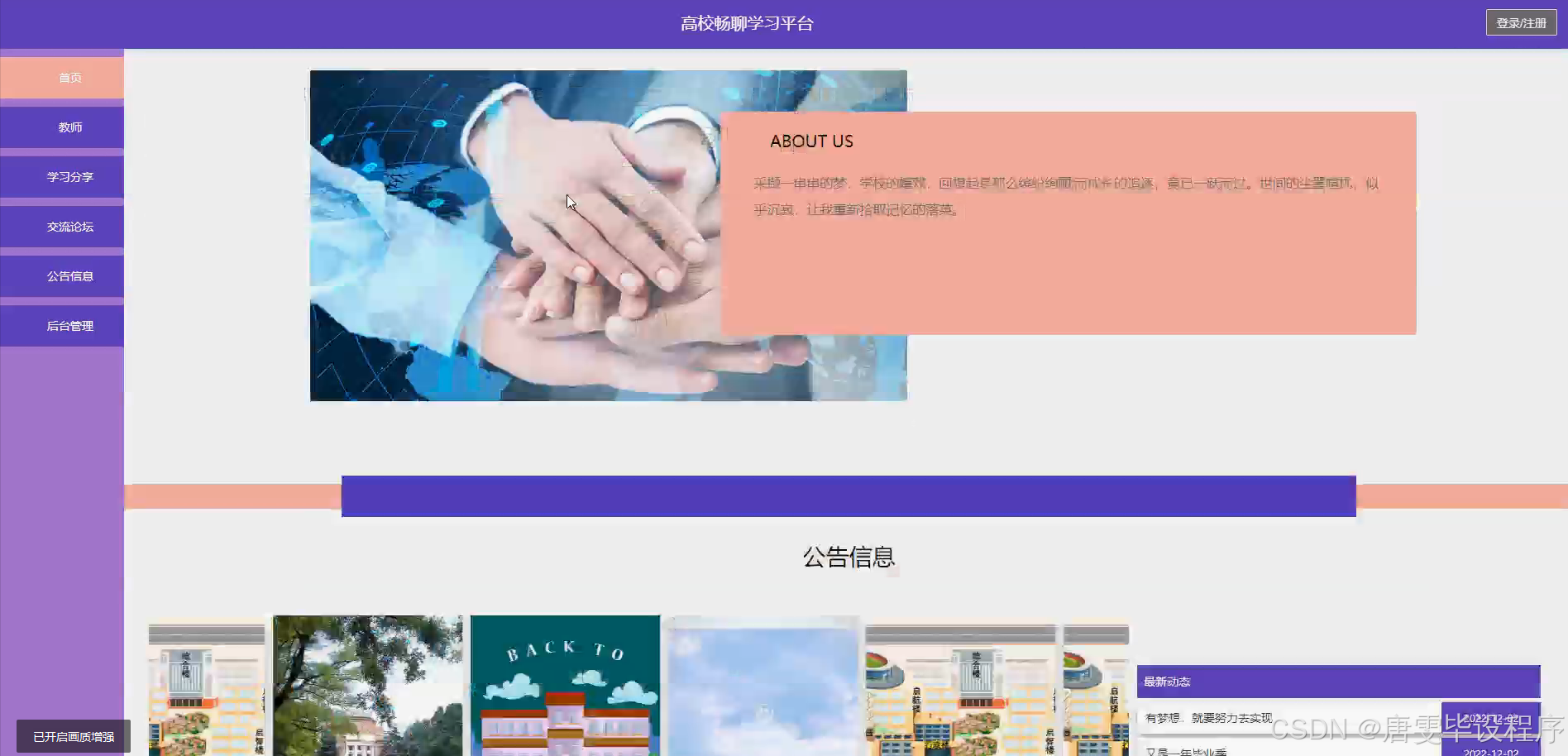 本研究旨在设计并实现一个功能完善、用户体验良好的高校畅聊学习平台,以满足高校师生在学习、交流和分享等方面的需求。通过该平台,学生可以方便地获取学习资源、参与学习讨论、分享学习经验;教师可以高效地管理班级、解答学生问题、分享教学心得;同时,平台还能够为高校管理层提供学生学习情况、教师教学效果等方面的数据支持,助力高校教育质量的提升。