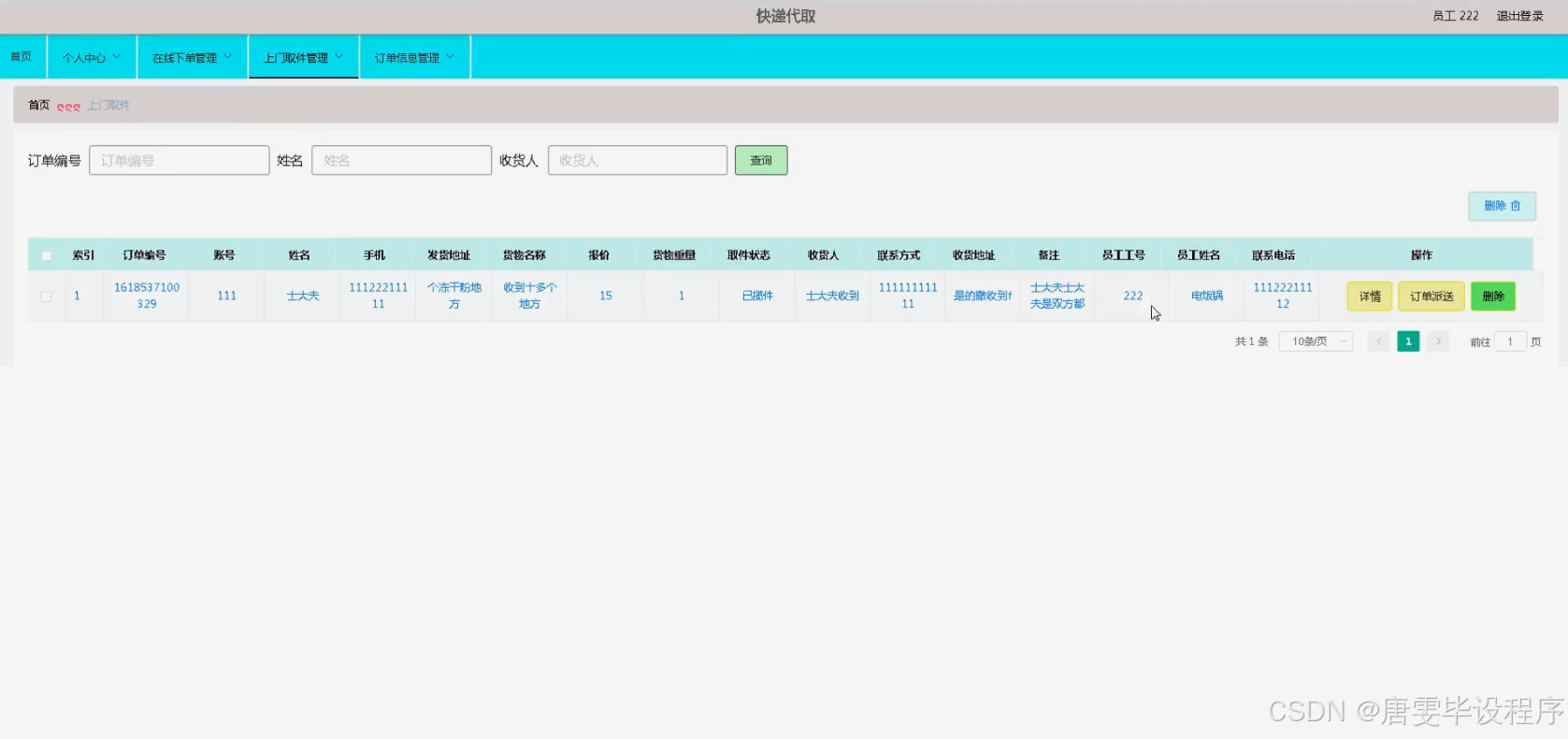 本研究旨在设计并实现一个功能完善的快递代取系统,以提升快递服务的便捷性和用户体验。通过该系统,用户能够轻松实现在线下单、预约上门取件等功能,同时能够实时查看订单信息,了解包裹的寄送状态。此外,系统还需具备员工管理、订单分配等功能,以确保服务的顺利进行。通过本研究的实施,期望能够为快递行业提供一种高效、便捷的代取服务解决方案,推动行业的持续健康发展。
