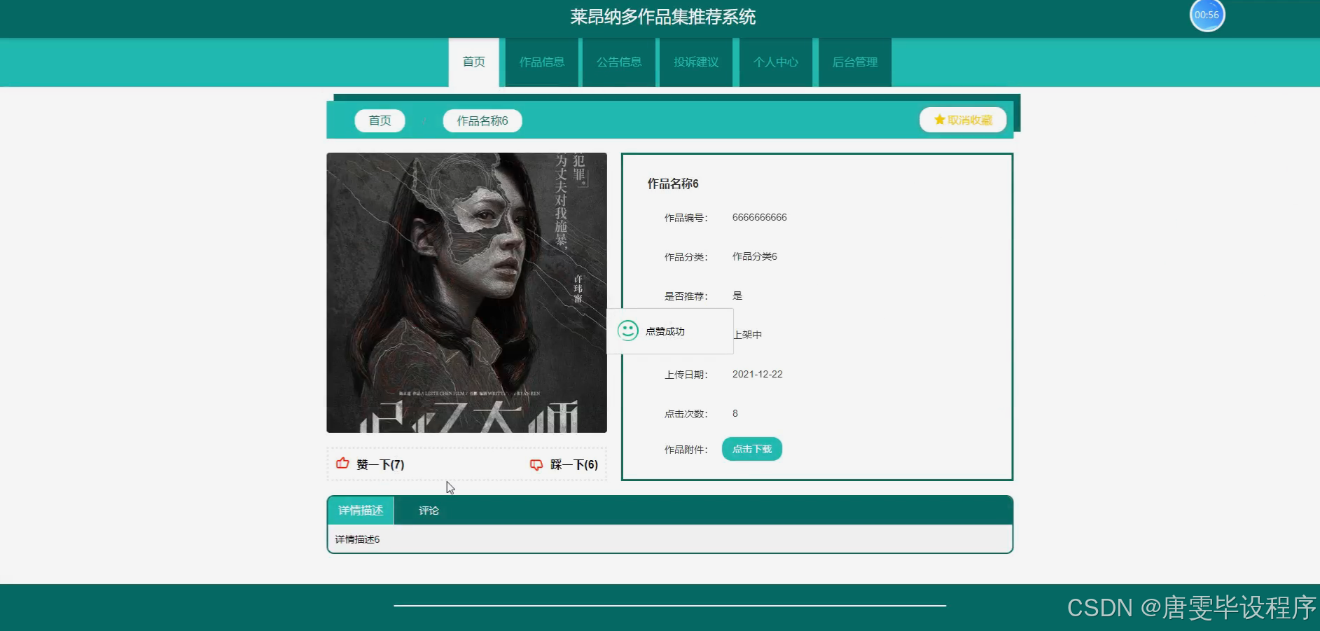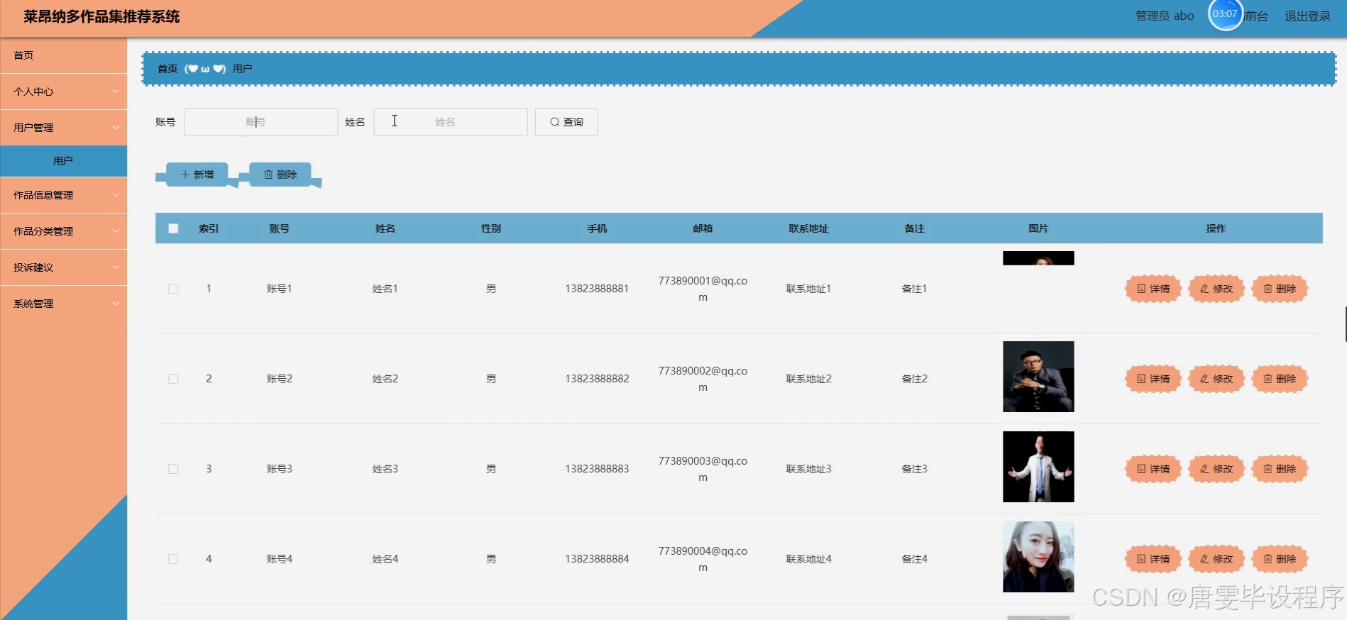 首先,构建用户管理系统,实现用户注册、登录、个人信息管理等功能,确保系统的安全性和用户数据的完整性。其次,建立作品信息管理系统,收集并整理莱昂纳多的全部作品信息,包括作品名称、类型、上映时间、剧情简介、演员阵容等,为推荐算法提供数据支持。同时,根据作品的类型、风格等特征,对作品进行分类管理,方便用户按类别浏览和筛选作品。最后,设计并实现推荐算法,结合用户的历史观影记录、评分、偏好等信息,以及作品的特征数据,进行个性化推荐。通过不断优化推荐算法,提高推荐的准确性和用户满意度。此外,系统还应提供作品评价、分享等互动功能,增强用户的参与感和归属感。