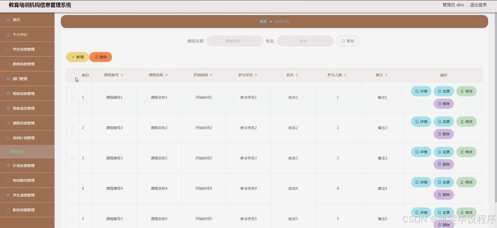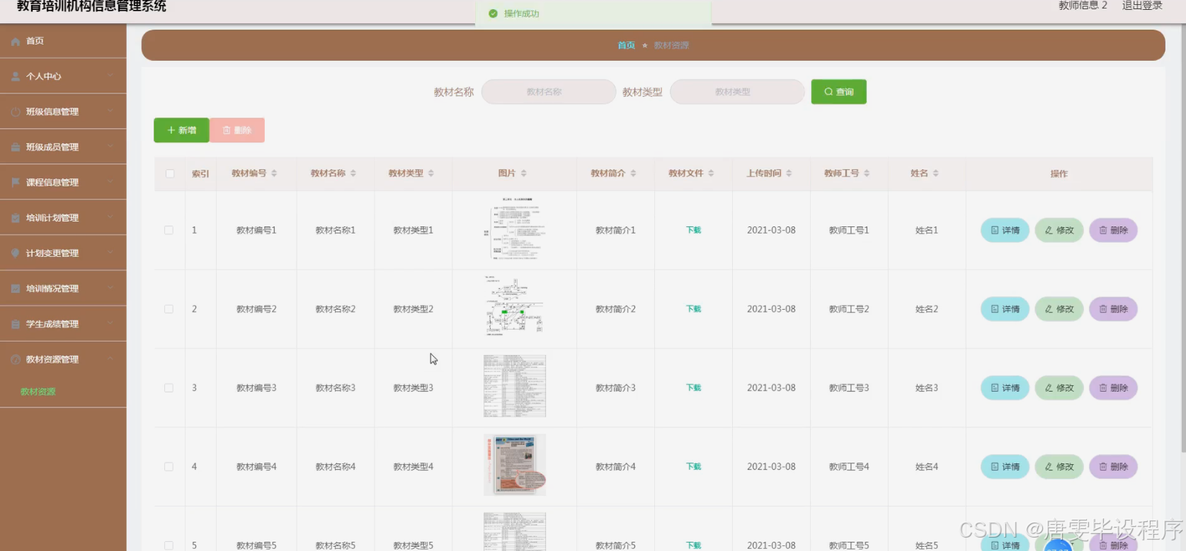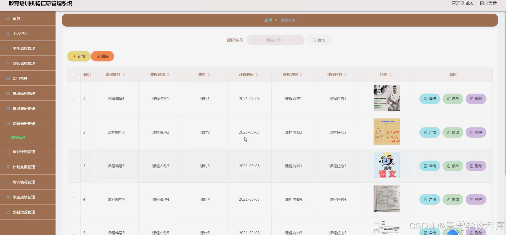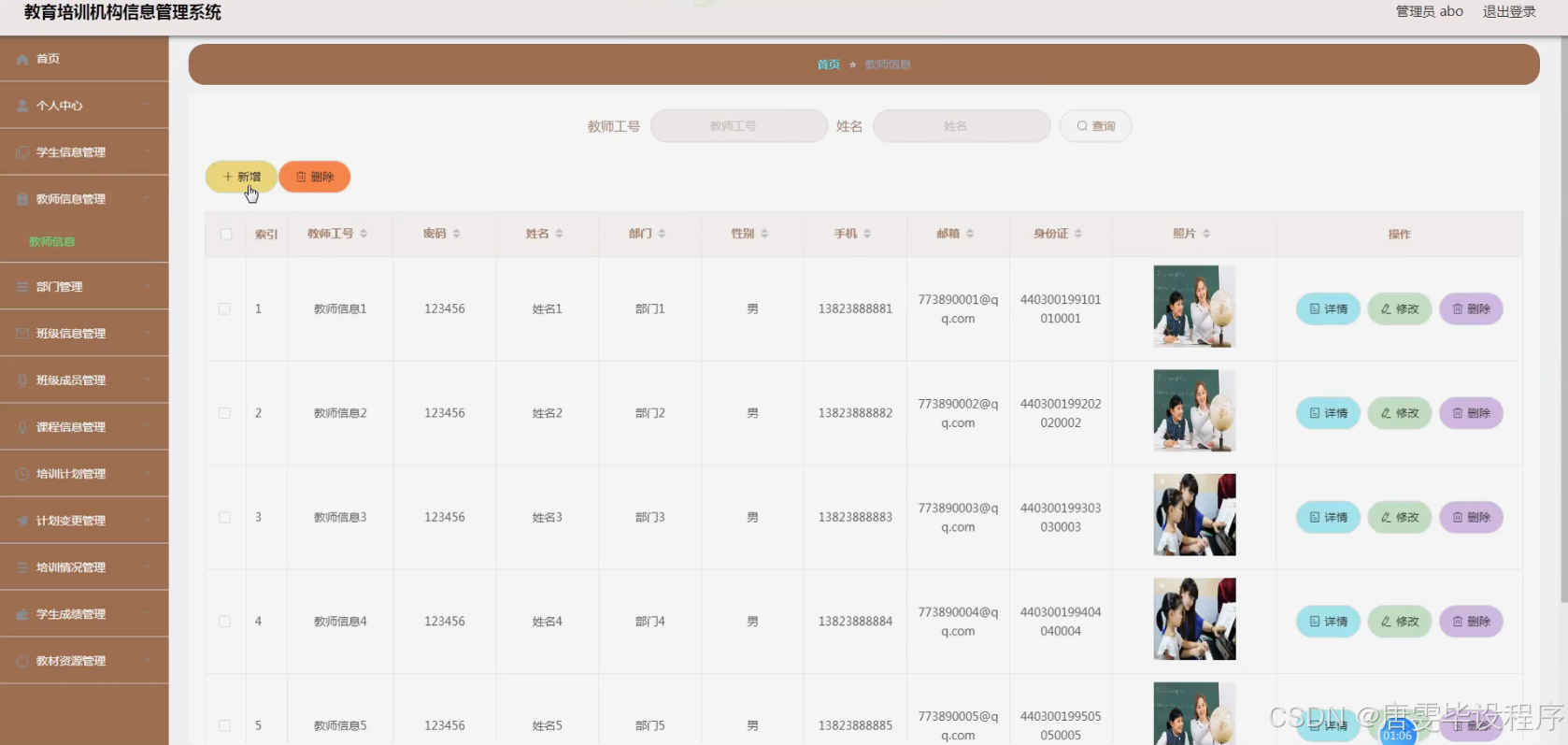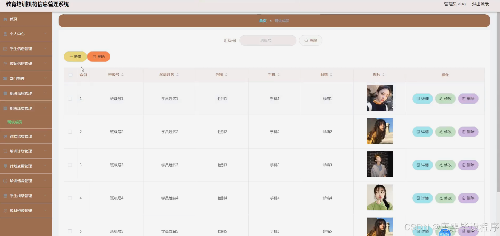 本研究将围绕教育培训机构信息管理系统的设计与实现展开,具体研究内容包括但不限于以下几个方面:首先,系统需要具备完善的学生信息管理功能,包括学生基本信息的录入、修改和查询等;其次,系统应能够管理教师信息,包括教师的个人信息、教学经历、科研成果等;再者,系统需实现班级信息和班级成员的管理,包括班级的创建、成员的添加和删除等;此外,课程信息管理也是系统的重要功能之一,包括课程的设置、课程表的生成和查询等;同时,系统还需支持部门管理,以便对机构内部的各个部门进行有效的组织和协调;在培训计划管理方面,系统应能够制定详细的培训计划,并允许根据实际情况进行变更和调整;培训情况的管理也是必不可少的,系统需记录每次培训的具体情况和参与人员;学生成绩管理功能将方便教师录入和查询学生的成绩信息;最后,系统还将提供丰富的教材资源,包括电子教材、教学视频等,以满足教师和学生的学习需求。