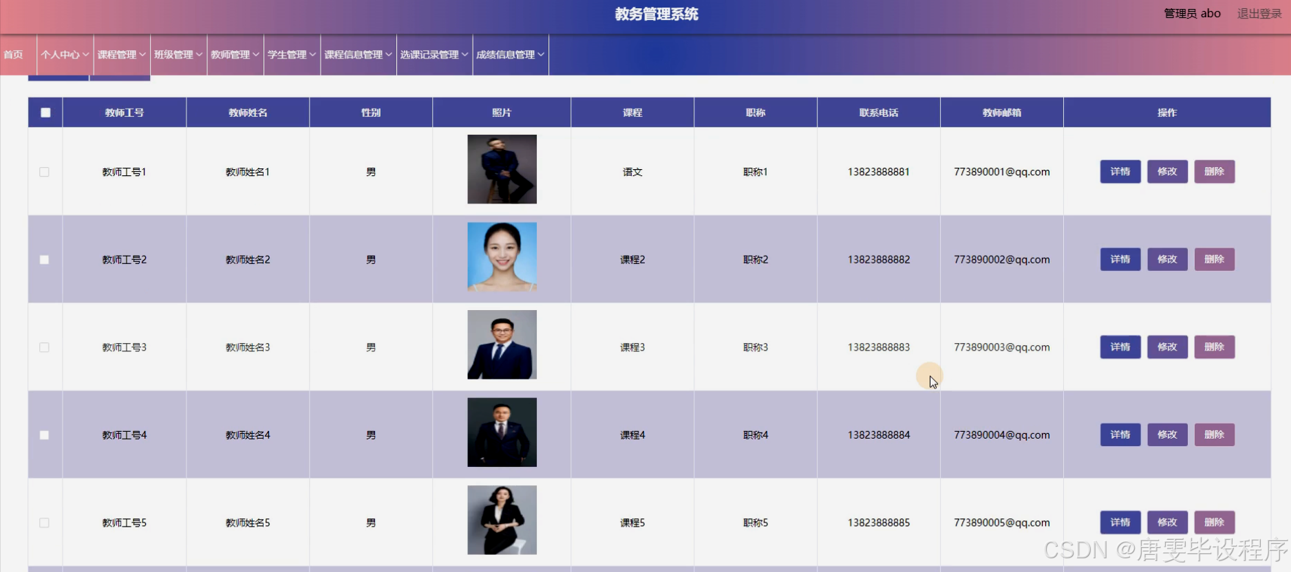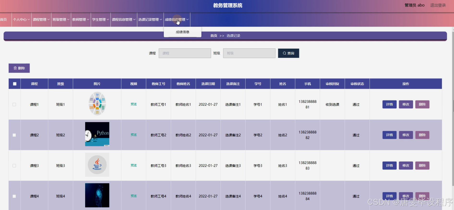 本研究旨在设计并实现一套功能完善的教务管理系统,以满足高校教务管理的实际需求。该系统应具备课程管理、班级管理、教师管理、学生管理、课程信息查询、选课记录管理、成绩信息管理等功能模块,实现教务信息的全面覆盖和高效管理。通过该系统的应用,旨在提高教务管理的效率和准确性,优化资源配置,提升教学质量,为高校教育事业的持续发展提供有力保障。