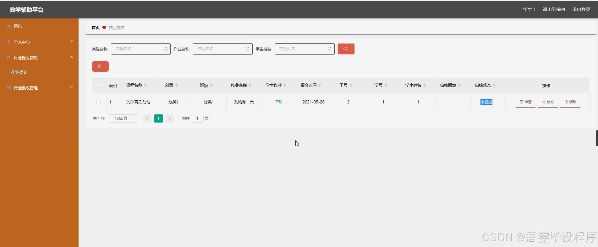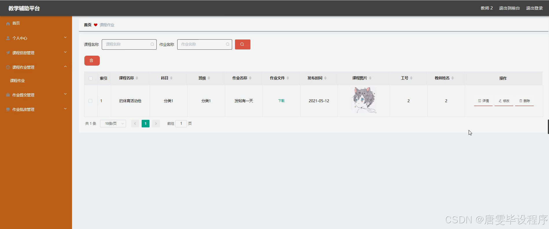 教学辅助平台的研究与开发对于提升教育质量、促进教育公平具有重要意义。通过该平台,教师可以更加便捷地发布课程信息、布置作业并进行批改,而学生则能够随时随地进行学习、提交作业并获取反馈。此外,平台的科目与班级分类功能有助于实现教育资源的精准推送和个性化学习路径的规划。这一平台的建立不仅能够减轻教师的教学负担,提高学生的学习效率,还能为教育管理者提供更加全面、准确的教学数据支持,从而推动教育决策的科学化和精准化。