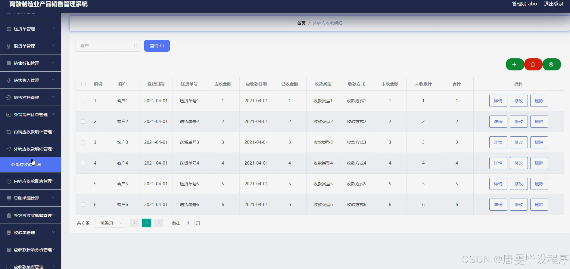 本研究的主要目的是设计并实现一套适用于离散制造业的产品销售管理系统,以满足企业对销售流程信息化、智能化的需求。通过该系统,企业能够实现对员工、产品资料、客户档案、库存等关键信息的有效管理,同时支持售货单、送货单、退货单等销售流程的全面跟踪。此外,该系统还将提供销售折扣、销售收入、销售对账等财务管理功能,以及内销应收款明细、外销应收款明细、呆账明细等账款管理功能,帮助企业实现销售流程的精细化管理和优化。