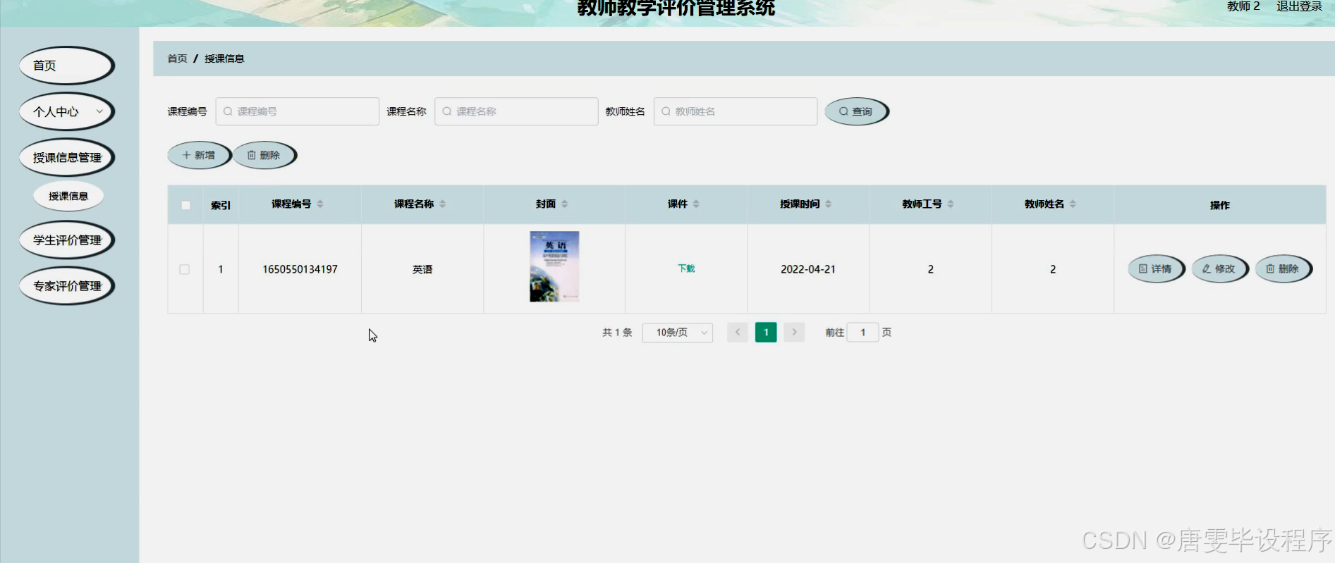 本研究将围绕教师教学评价管理系统的设计与实现展开,具体研究内容包括:系统架构设计、功能模块划分、数据库设计、前端界面开发、后端逻辑实现等。系统主要功能涵盖授课信息管理、学生评价、专家评价等多个方面。在授课信息管理方面,系统将实现课程信息的录入、查询与修改;在学生评价模块,系统将提供多种评价形式,如选择题、填空题、开放性问题等,以便全面收集学生对教师教学质量的反馈;在专家评价模块,系统将支持专家对教师的教学设计、教学方法、教学效果等方面进行综合评价。此外,系统还将具备数据统计分析功能,能够对评价数据进行深度挖掘,为教师提供个性化的教学改进建议,为教学管理决策提供科学依据。