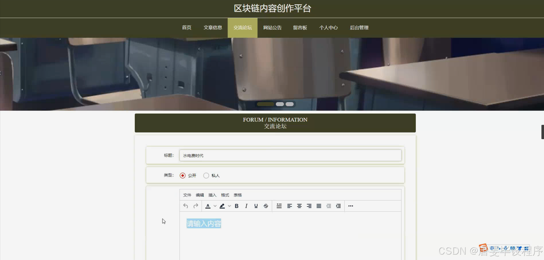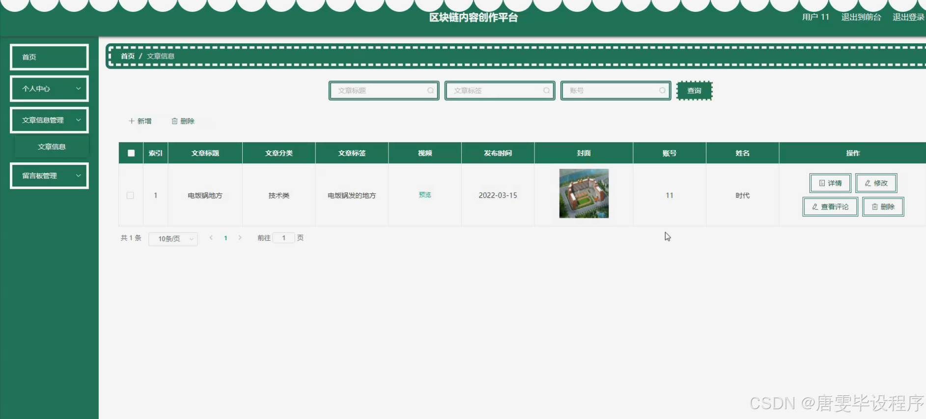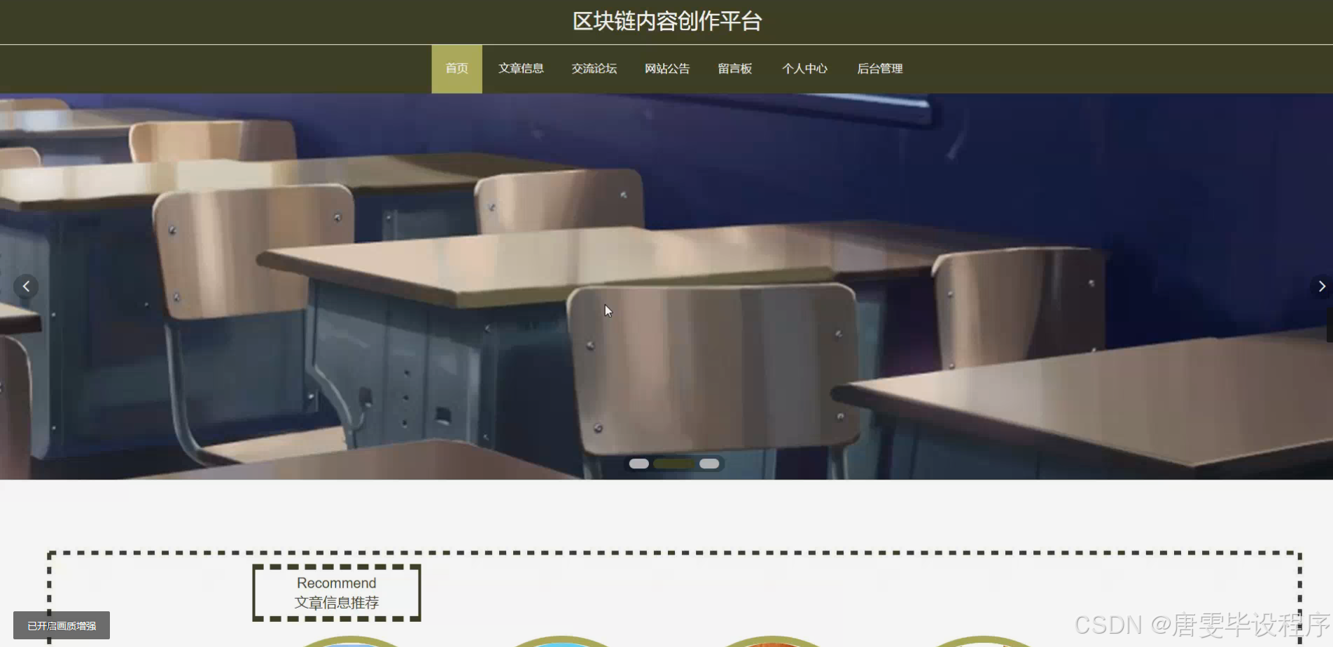 本研究旨在设计一个基于区块链的内容创作平台,通过整合用户管理、文章分类、文章信息展示等系统功能,为用户提供便捷的创作与分享体验。同时,利用区块链技术的特性,实现内容的版权保护、收益分配透明化以及内容真实性的验证,从而构建一个更加公平、安全、高效的创作环境。本研究期望通过这一平台的设计与实现,为内容创作行业带来新的发展机遇,推动行业的持续创新与进步。