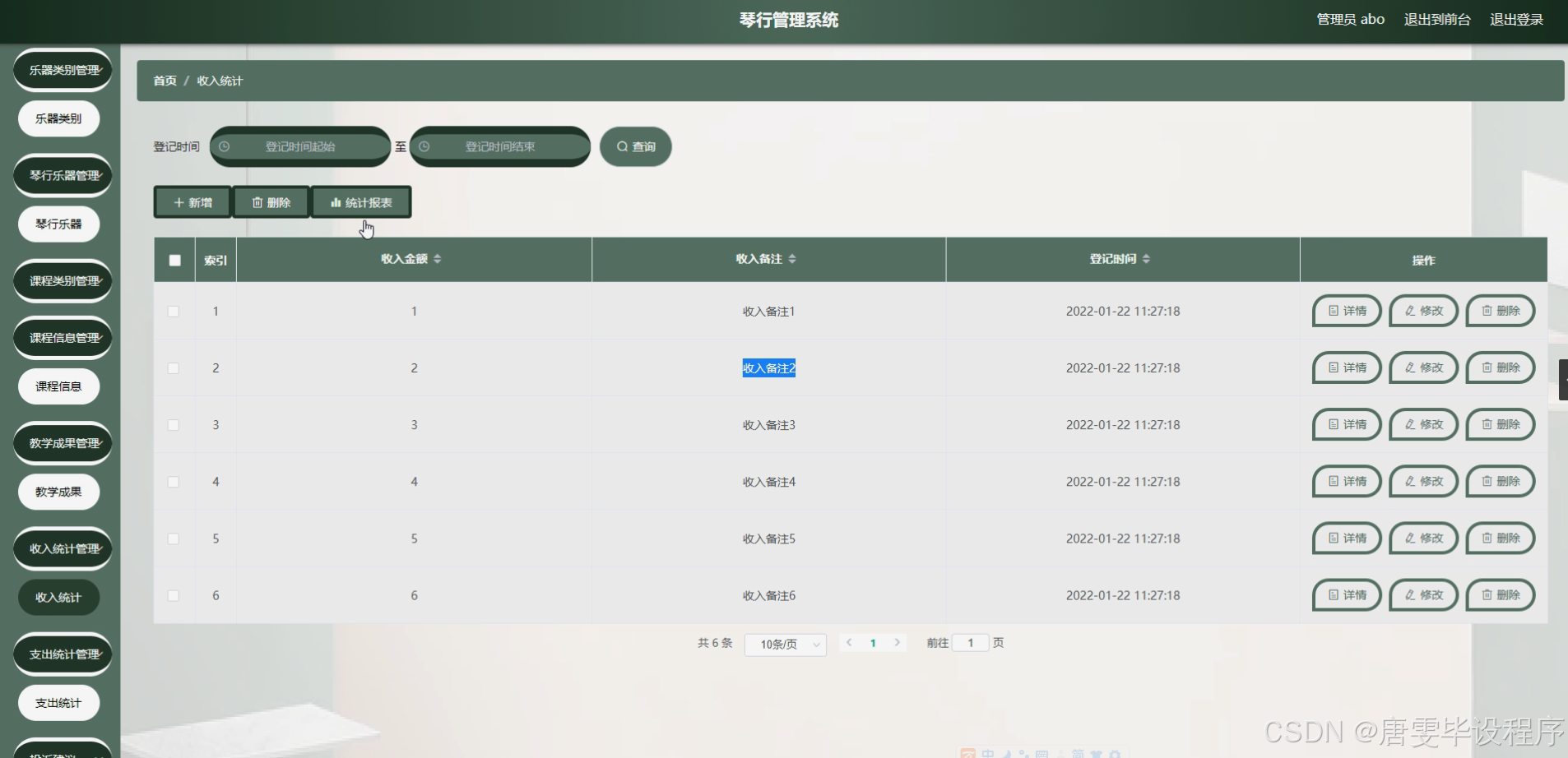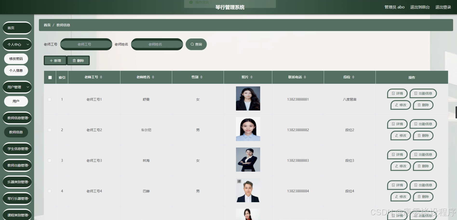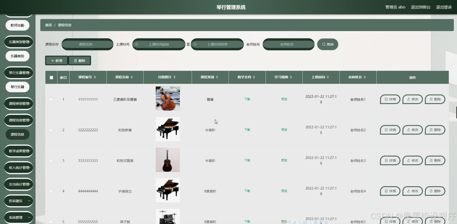 本研究旨在设计并实现一套功能全面、操作简便、易于维护的琴行管理系统,以满足琴行日常运营管理的需要。通过该系统,琴行可以实现对用户信息、琴行乐器、乐器类别、老师信息、学生信息、课程信息、课程类别、教学成果、老师出勤、收入统计、支出统计等关键信息的有效管理。同时,该系统还能够为琴行提供数据分析功能,帮助管理者更好地了解琴行的运营状况,为琴行的未来发展提供有力支持。