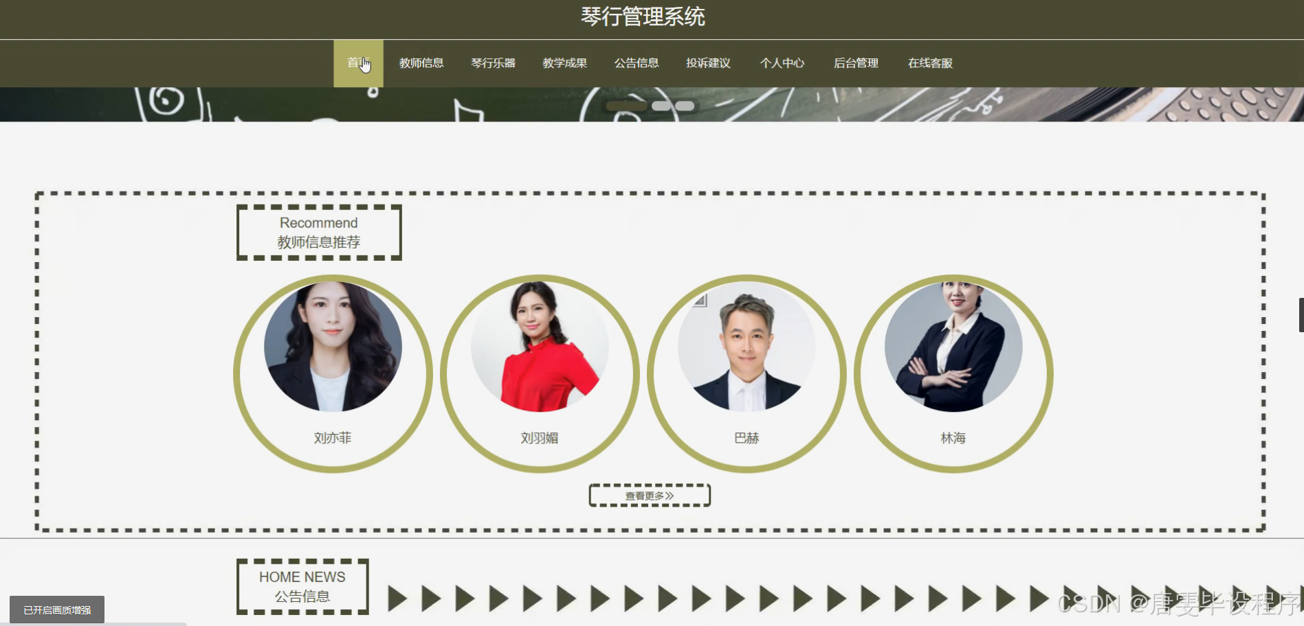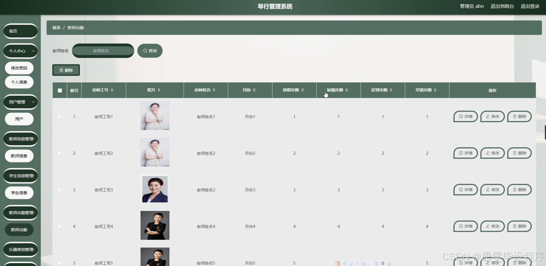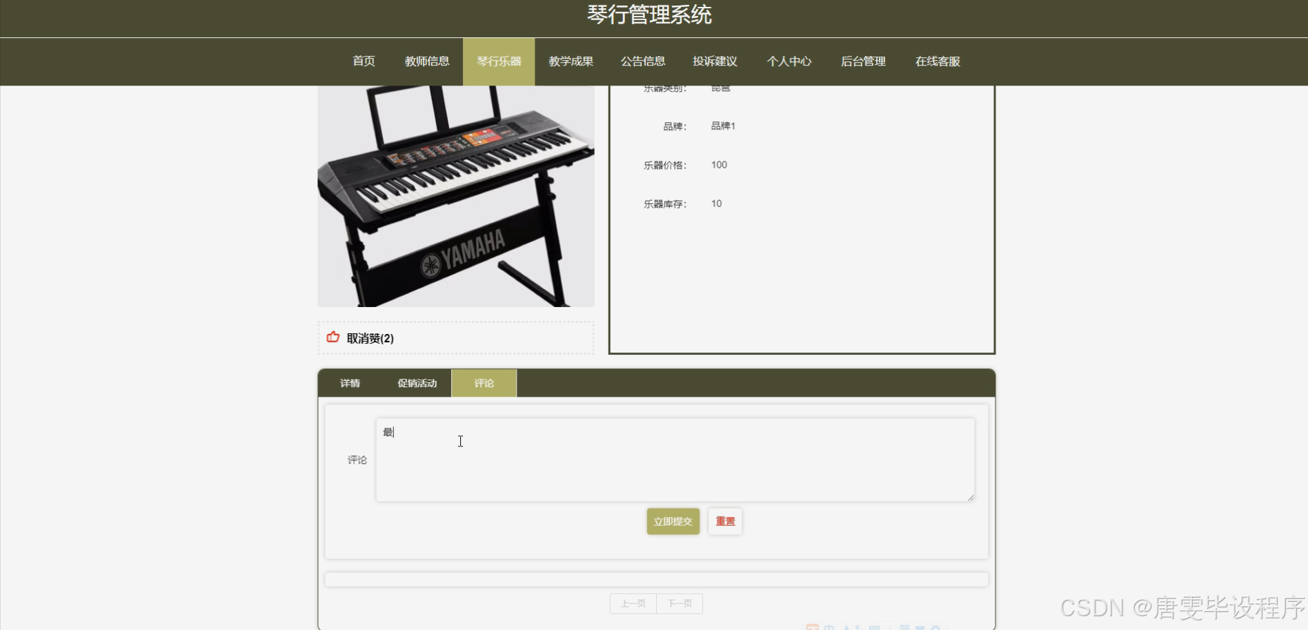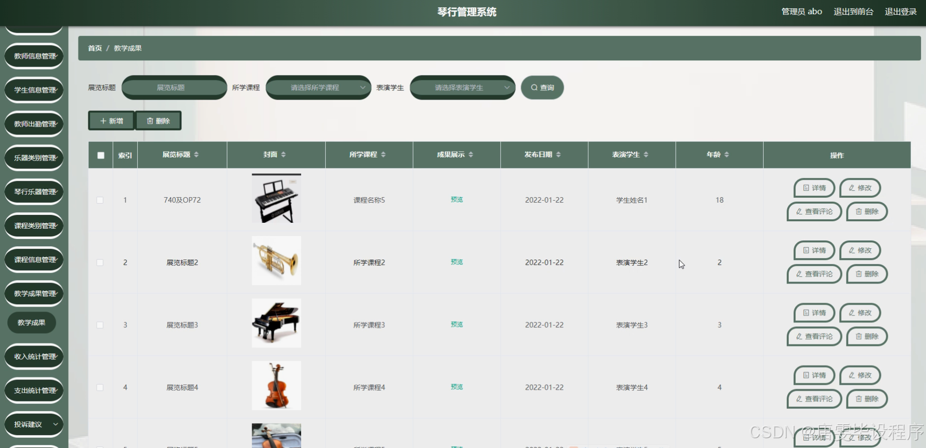 本研究旨在设计并实现一套功能全面、操作简便、易于维护的琴行管理系统,以满足琴行日常运营管理的需要。通过该系统,琴行可以实现对用户信息、琴行乐器、乐器类别、老师信息、学生信息、课程信息、课程类别、教学成果、老师出勤、收入统计、支出统计等关键信息的有效管理。同时,该系统还能够为琴行提供数据分析功能,帮助管理者更好地了解琴行的运营状况,为琴行的未来发展提供有力支持。