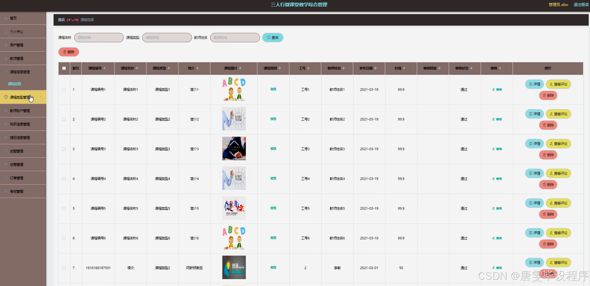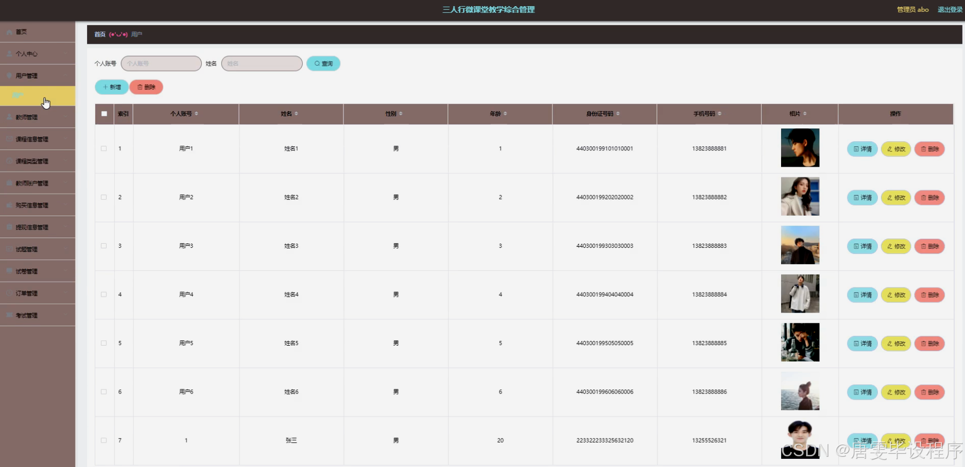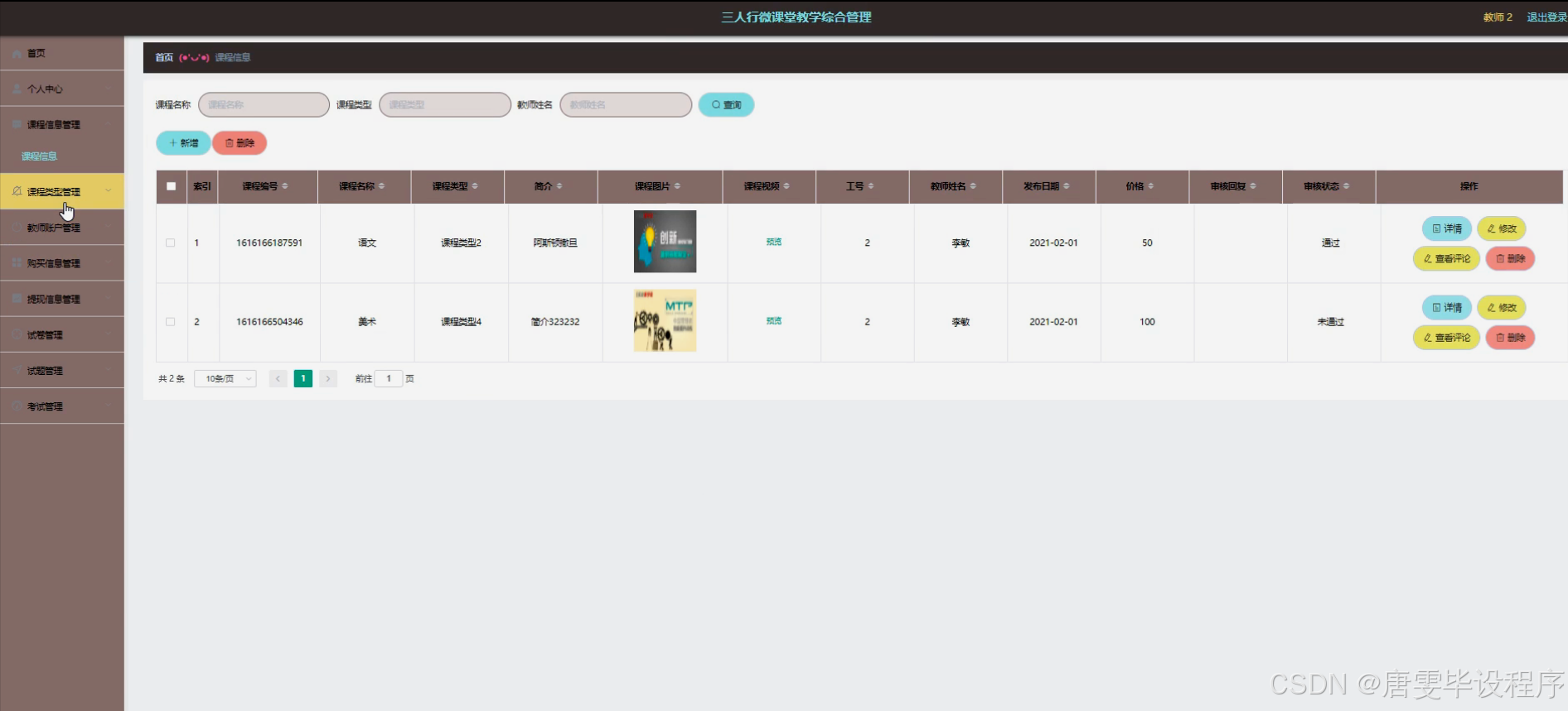 本研究的主要目的是设计并实现一套功能完善、操作简便的“三人行微课堂教学综合管理”系统,以满足教师、学生及管理者等不同用户角色的需求。通过该系统,期望实现用户信息的精准管理、课程资源的优化配置、教师账户的安全维护以及交易信息的透明化管理,从而全面提升微课堂教学的效率与质量,促进教育资源的广泛共享与深度应用。同时,本研究也希望通过实践探索,为在线教育平台的未来发展提供有益的参考与启示。