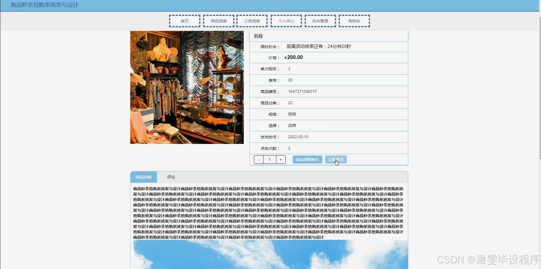 随着互联网技术的飞速发展和电子商务行业的日益繁荣,商品秒杀抢购活动已成为各大电商平台吸引用户、提升流量和销售额的重要手段。这类活动通过限时限量销售热门商品,以极低的价格激发消费者的购买欲望,从而在短时间内形成销售高峰。然而,秒杀抢购活动的高并发访问量和数据处理需求,对系统的稳定性、响应速度和安全性提出了极高的要求。传统的电商系统往往难以应对这种瞬间的流量冲击,容易出现页面卡顿、订单失败、数据不一致等问题,严重影响了用户体验和平台的信誉。因此,设计并实现一个高效、稳定、安全的商品秒杀抢购系统,成为当前电子商务领域亟待解决的重要课题。
