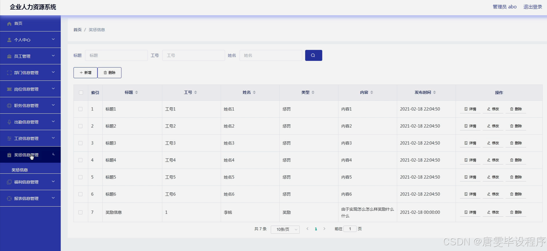 奖惩管理模块用于记录和管理员工的奖惩信息,包括奖励的类型、金额、时间以及惩罚的原因、措施等,以帮助企业维护良好的工作秩序和员工行为。
