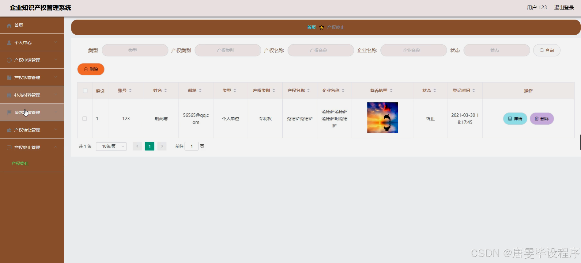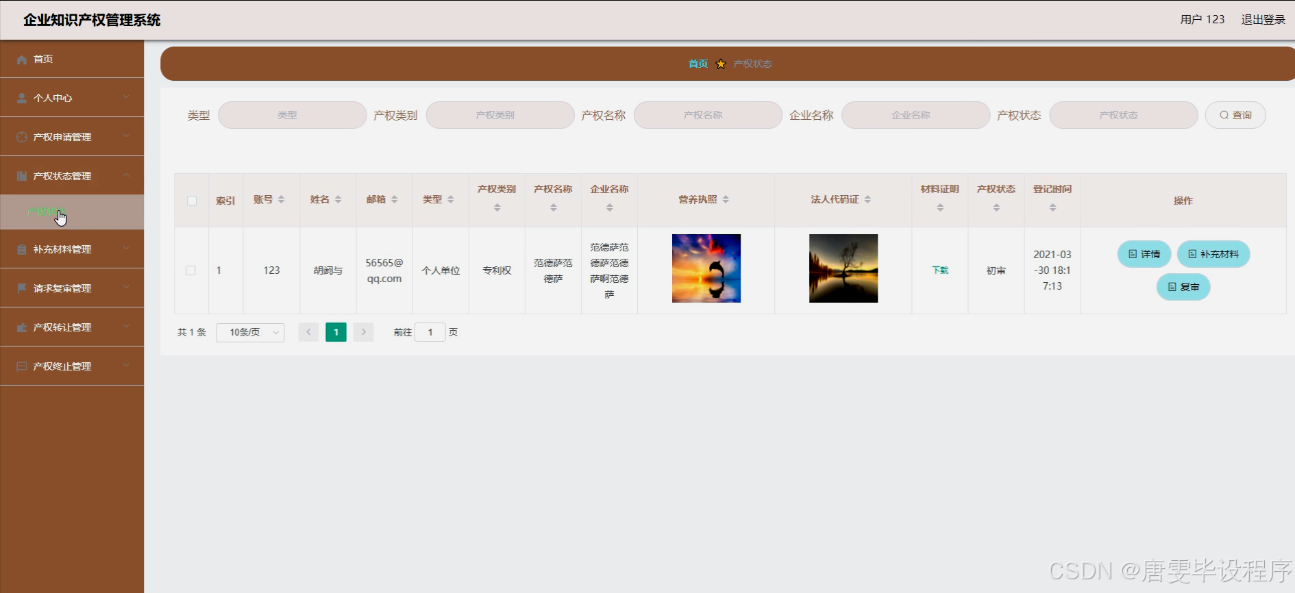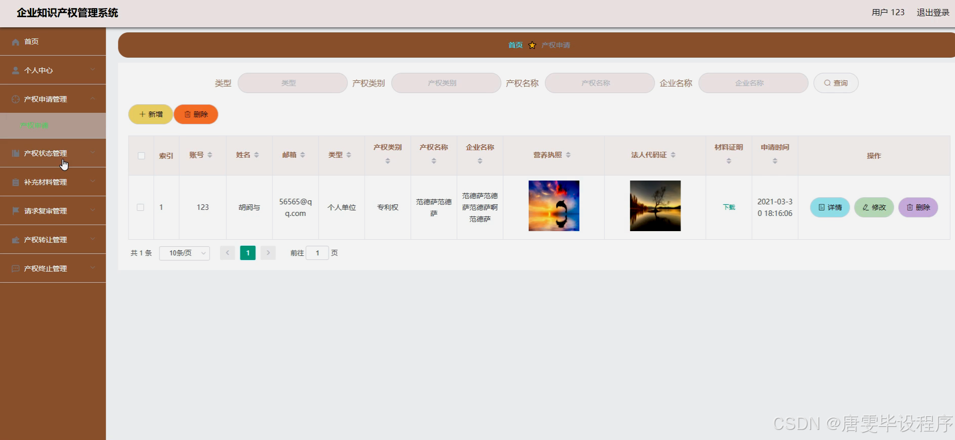 本研究旨在设计并实现一套功能完善、操作便捷的企业知识产权管理系统,旨在解决当前企业在知识产权管理上面临的诸多挑战。通过系统化、数字化的管理手段,提高知识产权保护的全面性与有效性,提升管理效率,减少人为错误,增强企业的核心竞争力。同时,该系统将为企业提供一站式知识产权服务,包括产权申请、状态跟踪、材料补充、复审请求、产权转让、终止处理、数据统计、公告发布及用户反馈等功能,实现知识产权生命周期的全链条管理,助力企业实现知识产权的价值最大化。