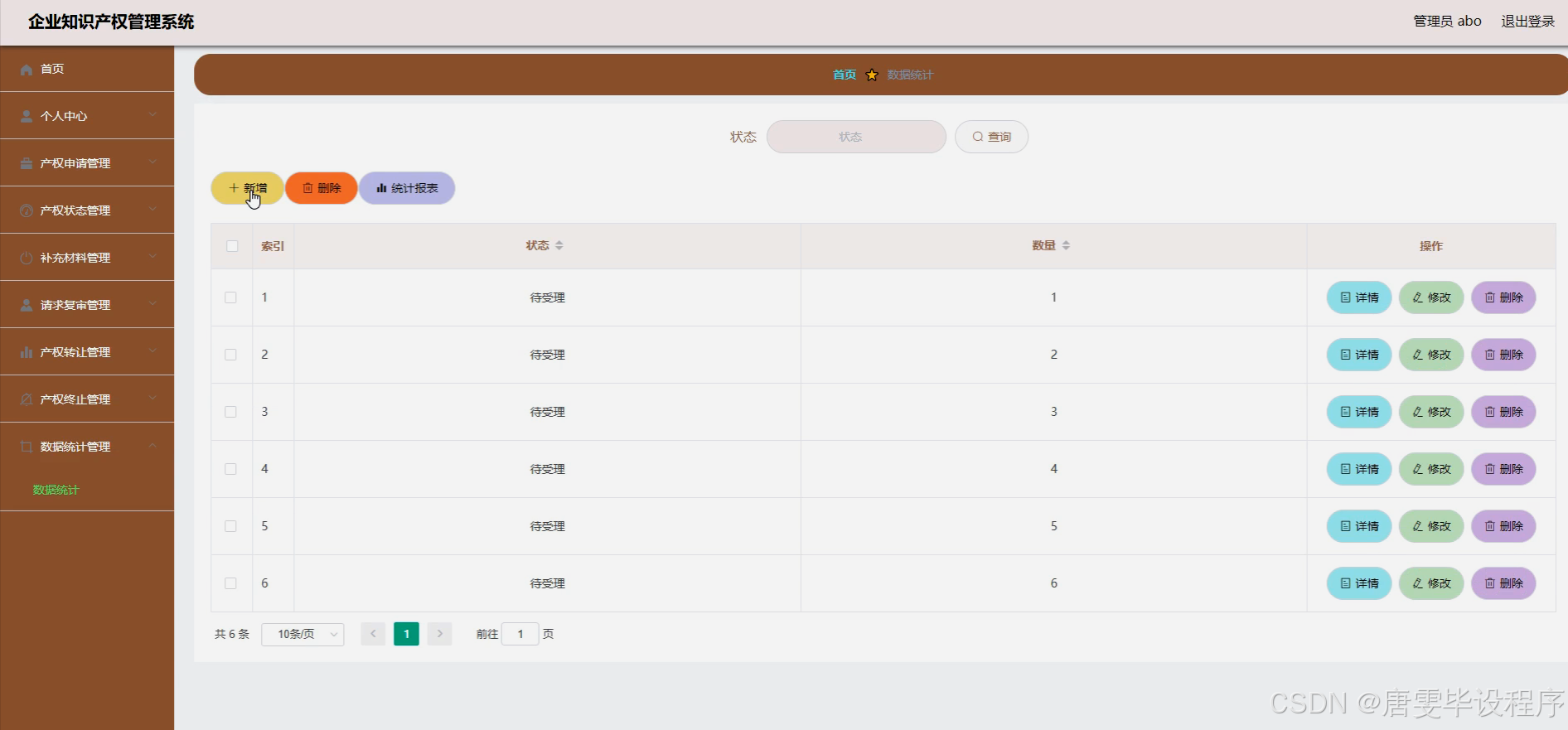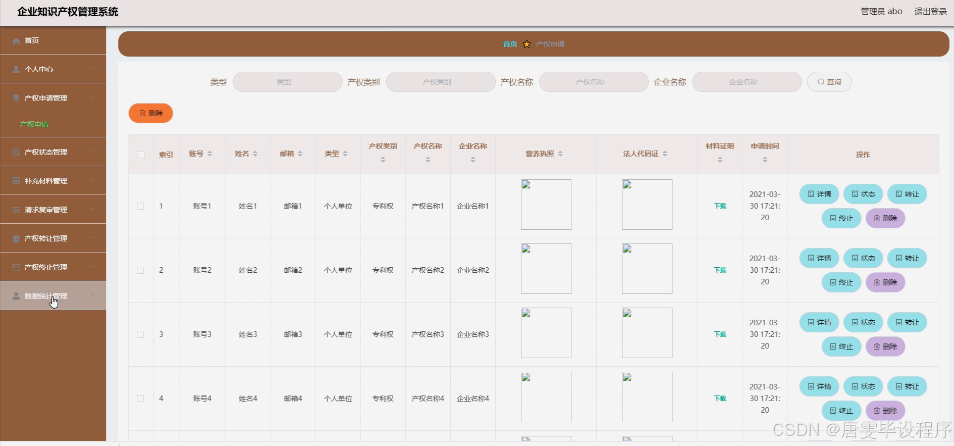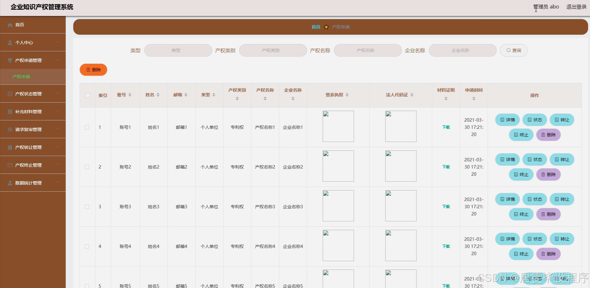 本研究旨在设计并实现一套功能完善、操作便捷的企业知识产权管理系统,旨在解决当前企业在知识产权管理上面临的诸多挑战。通过系统化、数字化的管理手段,提高知识产权保护的全面性与有效性,提升管理效率,减少人为错误,增强企业的核心竞争力。同时,该系统将为企业提供一站式知识产权服务,包括产权申请、状态跟踪、材料补充、复审请求、产权转让、终止处理、数据统计、公告发布及用户反馈等功能,实现知识产权生命周期的全链条管理,助力企业实现知识产权的价值最大化。