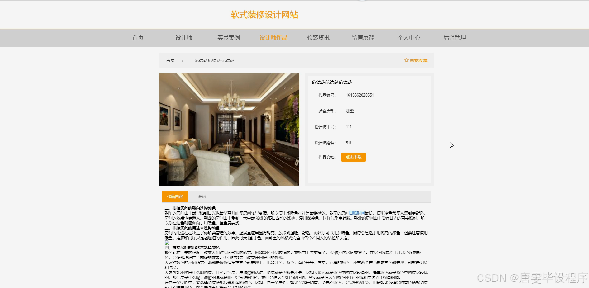 本研究不仅有助于推动软式装修设计行业的数字化转型,提升行业服务质量和效率,还能为用户提供更加丰富的设计选择和更加便捷的消费体验。通过整合设计师资源,构建实景案例库和设计师作品集,该网站能够为用户提供更加直观、全面的设计参考,降低装修决策的难度和风险。同时,对于设计师而言,这也是一个展示才华、拓展市场的良好平台,有助于促进设计师与用户的直接沟通与合作,推动设计创新和服务升级。
