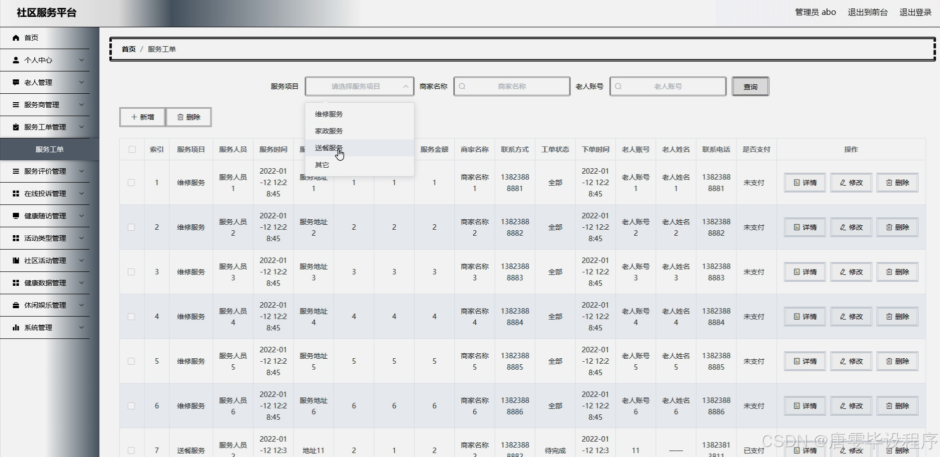 本研究旨在设计并实现一个功能全面的社区服务平台,该平台需涵盖老人关怀、服务商管理、服务工单处理、服务评价反馈、在线投诉解决、健康随访记录、社区活动组织、健康数据管理、休闲娱乐推荐、服务信息发布、服务项目展示、活动报名系统以及呼叫中心等功能模块。通过这些功能的集成,旨在打造一个高效、智能、人性化的社区服务体系,满足居民多样化需求,提升社区治理与服务水平,促进社区可持续发展。
