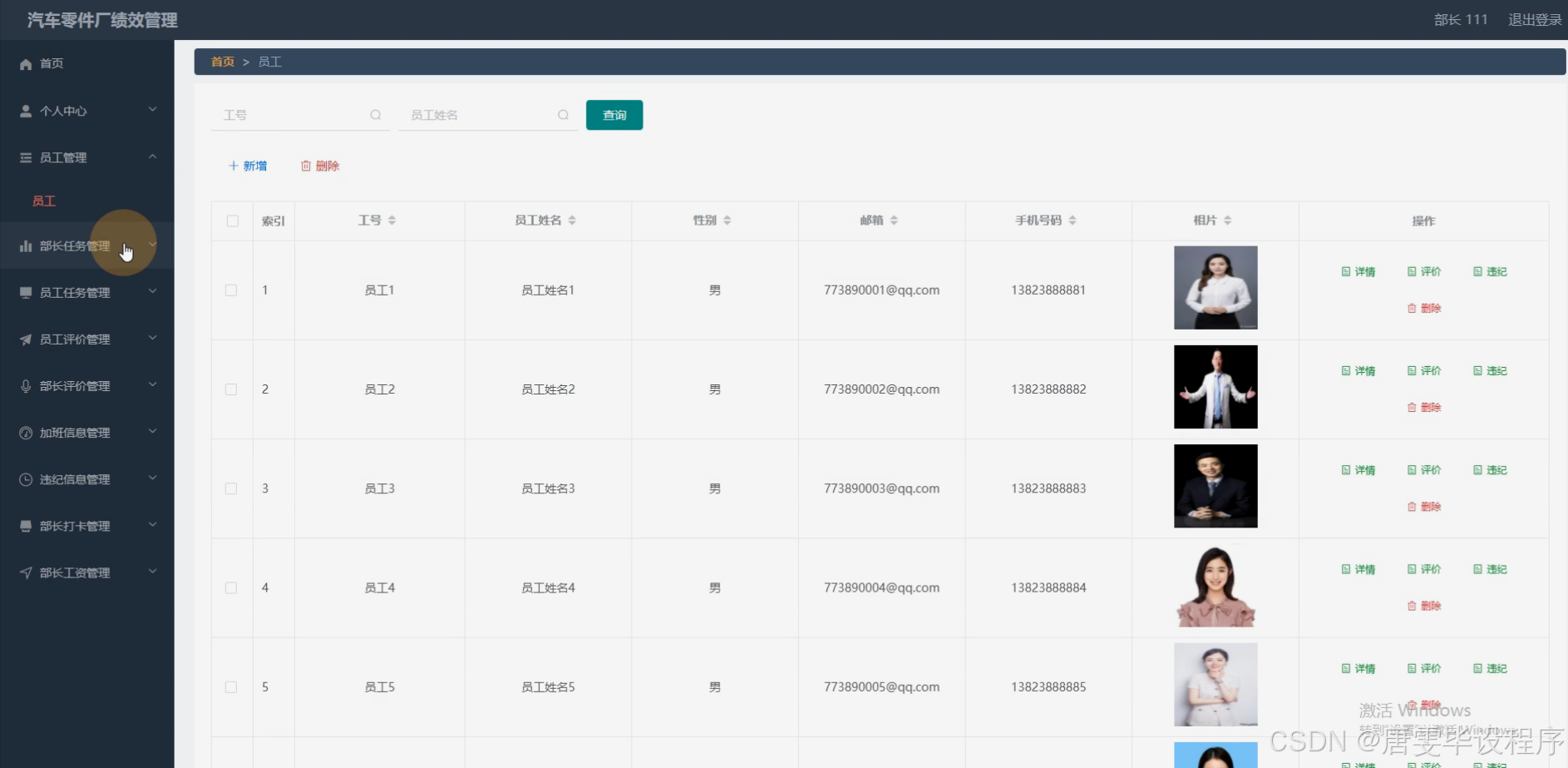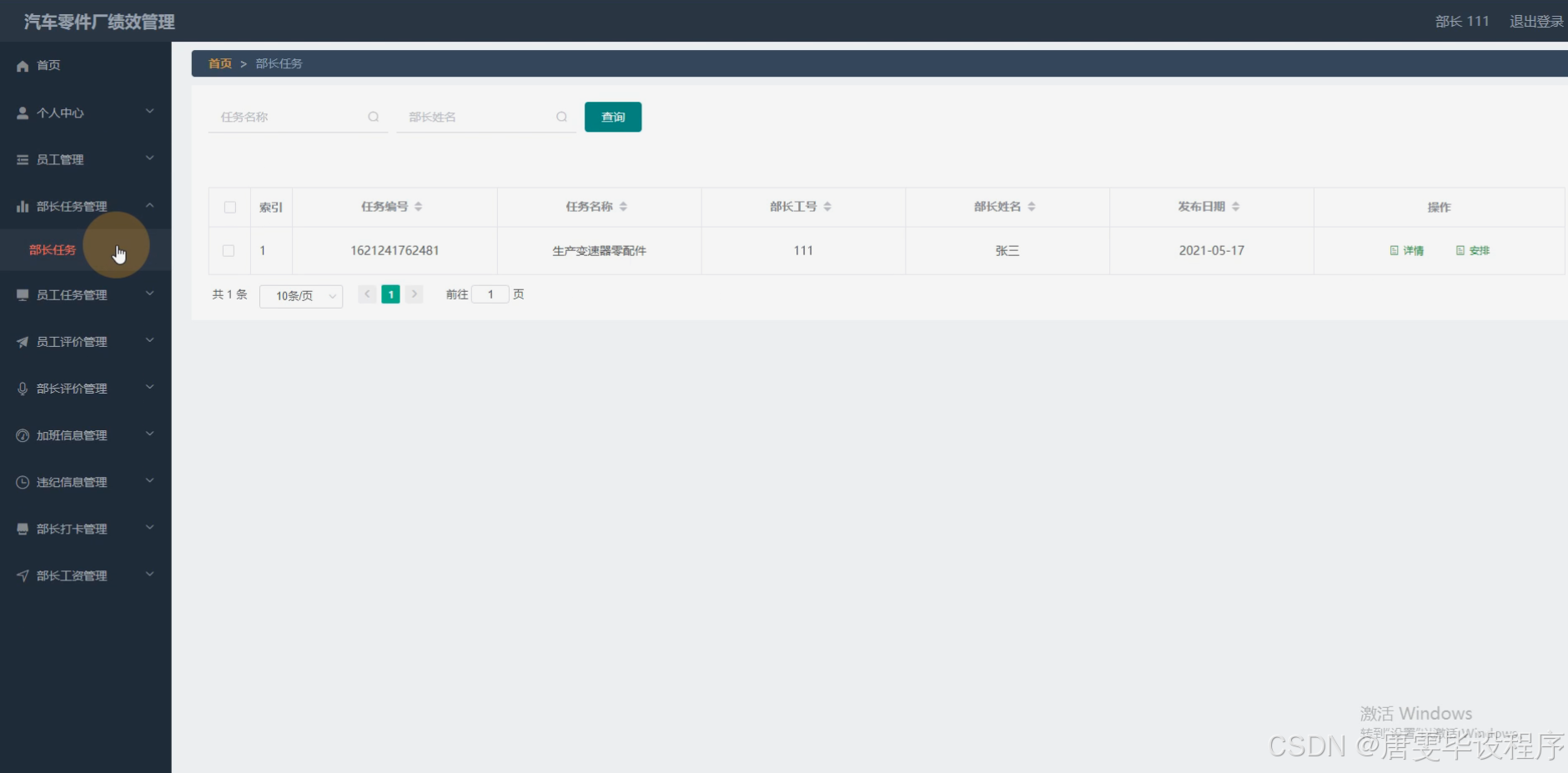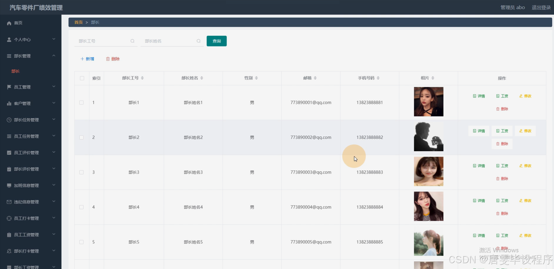 本研究旨在设计并实现一套适用于汽车零件厂的绩效管理系统,通过集成部长、员工、客户等角色,以及员工任务、员工评价、部长评价、加班信息、违纪信息、员工打卡、员工工资、部长打卡、部长工资等系统功能,实现对企业绩效的全面、精准管理。该系统旨在提升企业的管理效率,优化资源配置,增强企业的市场竞争力,为企业的可持续发展提供有力支持。