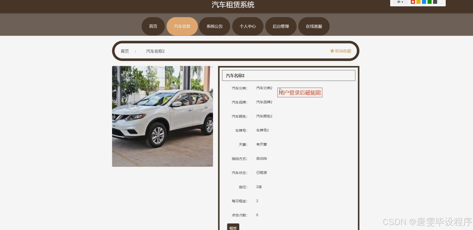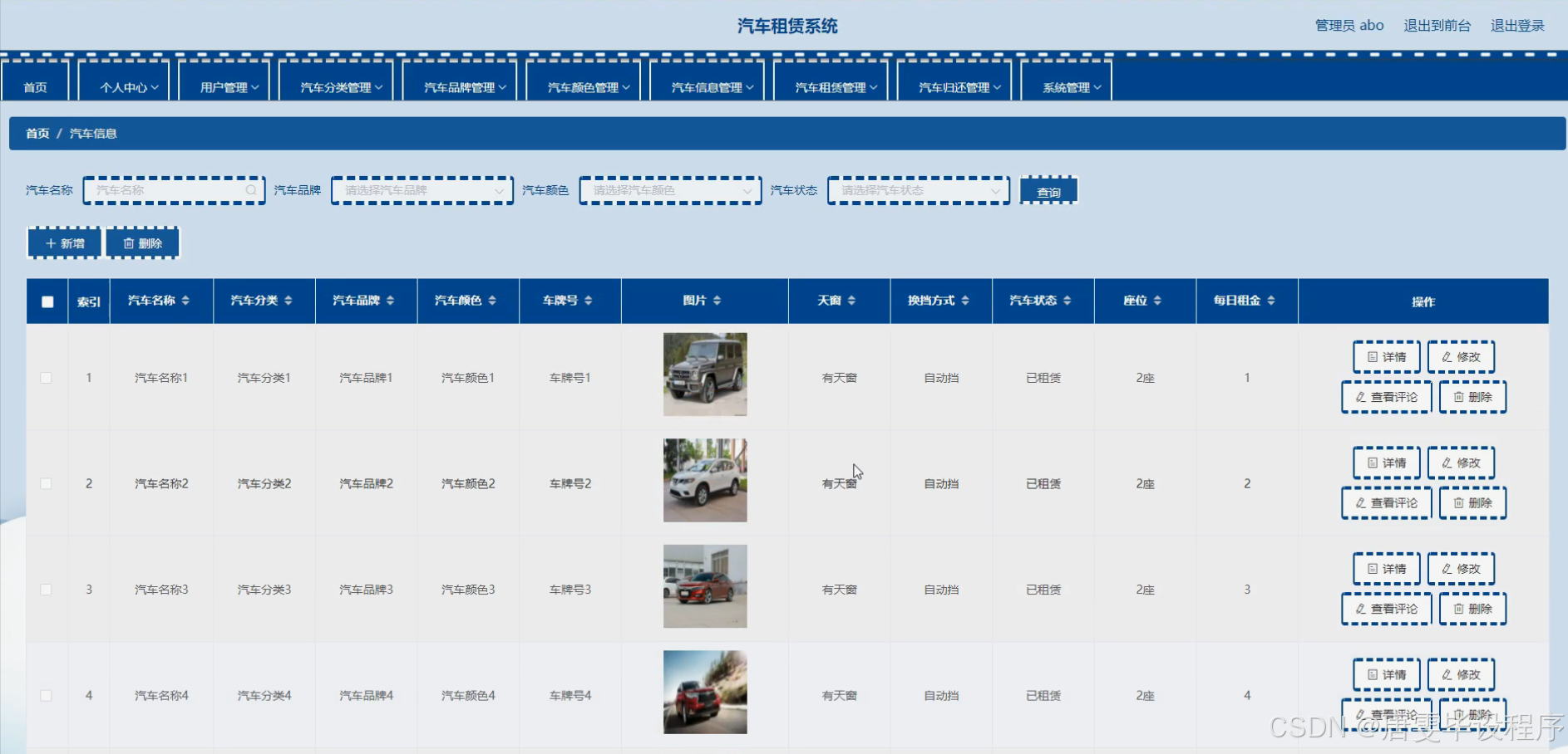 本研究的汽车租赁系统主要包含以下功能:用户管理模块,实现用户的注册、登录、个人信息管理等功能;汽车分类管理模块,根据车辆类型、品牌、颜色等进行分类管理;汽车品牌与颜色管理模块,详细记录各品牌汽车的颜色信息,为用户提供多样化的选择;汽车信息管理模块,记录车辆的详细信息,包括型号、性能、保养记录等;汽车租赁管理模块,实现车辆的预订、租赁、费用计算等功能;以及汽车归还管理模块,记录车辆的归还时间、状态等信息,确保租赁流程的顺畅进行。通过这些功能模块的协同工作,系统能够为用户提供便捷、高效的汽车租赁服务,同时帮助租赁公司实现精细化的运营管理。