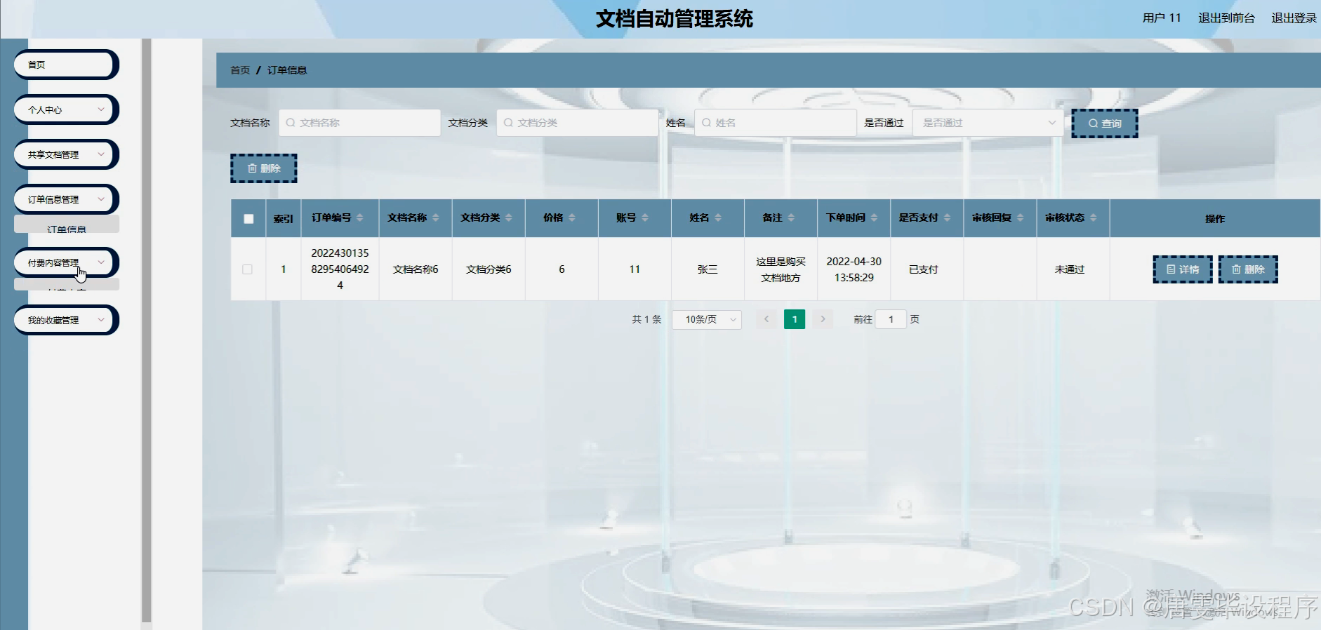 本研究将围绕文档自动管理系统的核心功能展开,具体包括用户管理、文档分类、文档信息管理、共享文档管理、订单信息管理以及付费内容管理等模块。用户管理模块负责用户注册、登录、角色分配及权限设置;文档分类模块通过智能化算法对上传的文档进行自动分类,便于用户快速定位;文档信息管理模块则负责文档的详细信息记录,如标题、作者、上传时间、摘要等;共享文档管理模块提供文档的共享链接生成、访问权限设置及共享记录追踪功能;订单信息管理模块用于处理用户购买付费文档的记录、支付状态跟踪及订单历史查询;付费内容管理模块则涉及付费文档的定价策略、支付接口集成及收益统计。通过这些模块的协同工作,系统将实现文档的全面自动化管理,满足用户多样化的文档处理需求。