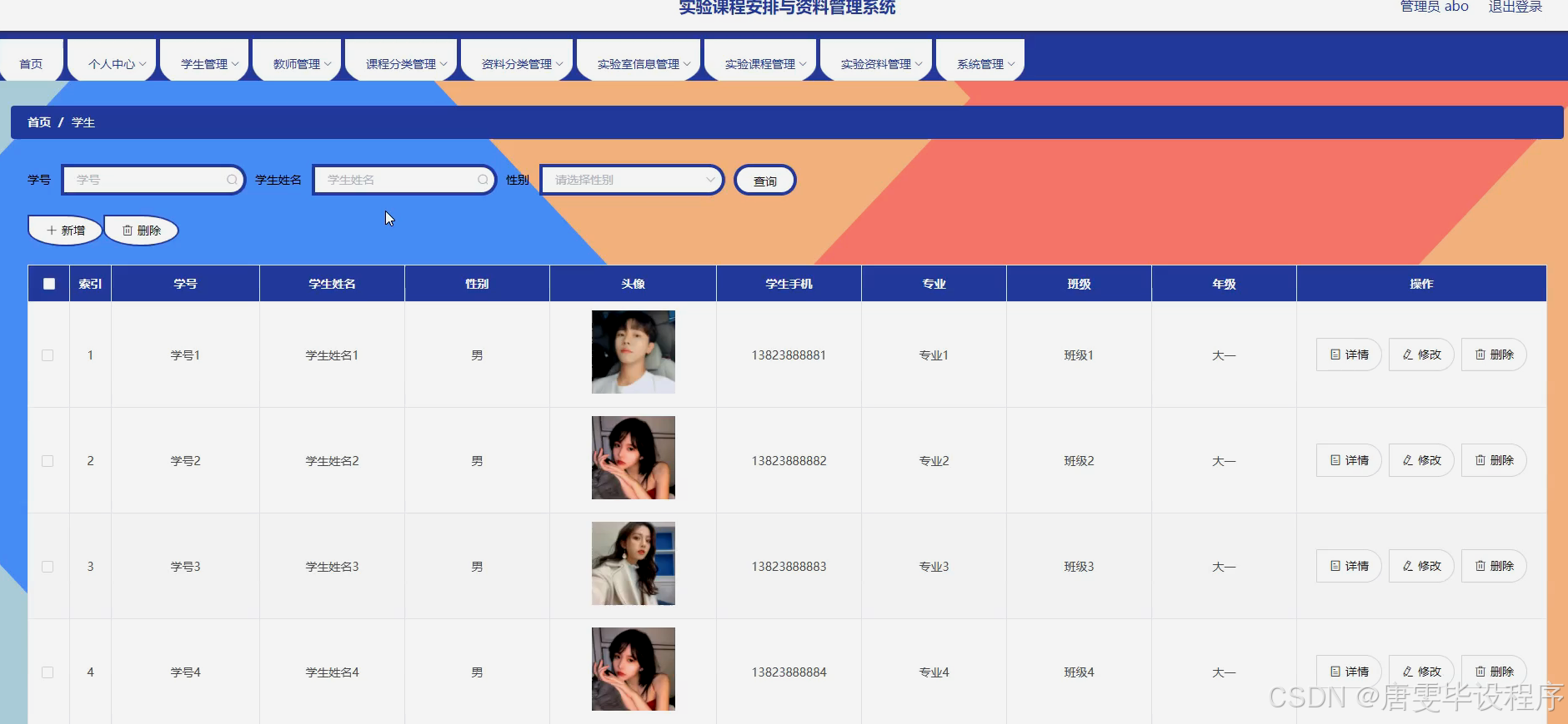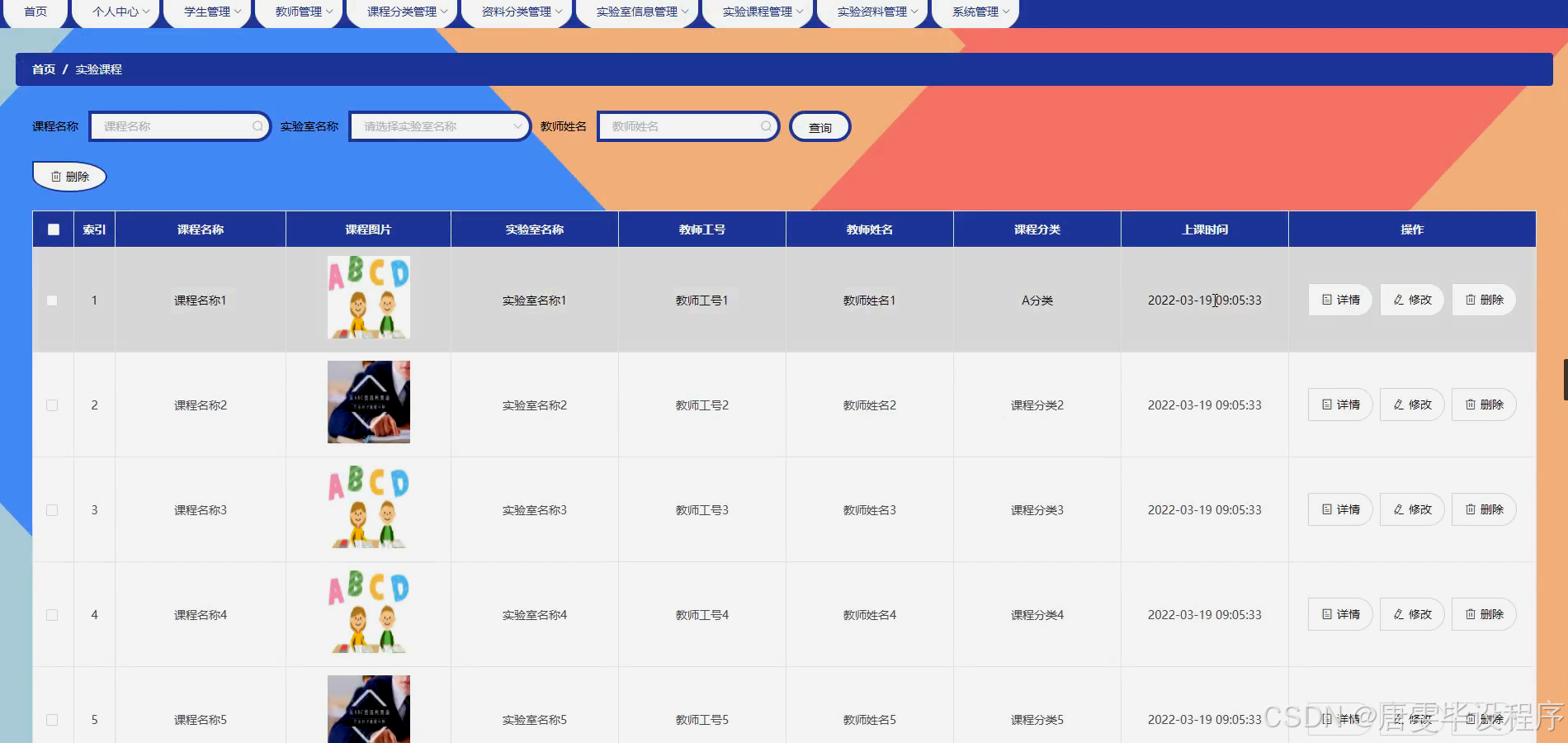 本研究的主要目的是设计并实现一套功能完善的实验课程安排与资料管理系统,以满足高校实验课程管理的实际需求。系统需具备学生信息管理、教师信息管理、课程分类管理、资料分类管理、实验室信息管理、实验课程安排、实验资料管理以及学生课表生成等功能模块。通过系统的应用,旨在实现实验课程安排的智能化、实验资料的数字化管理,以及实验室资源的有效调度,为师生提供一个高效、便捷的实验课程管理与学习平台。