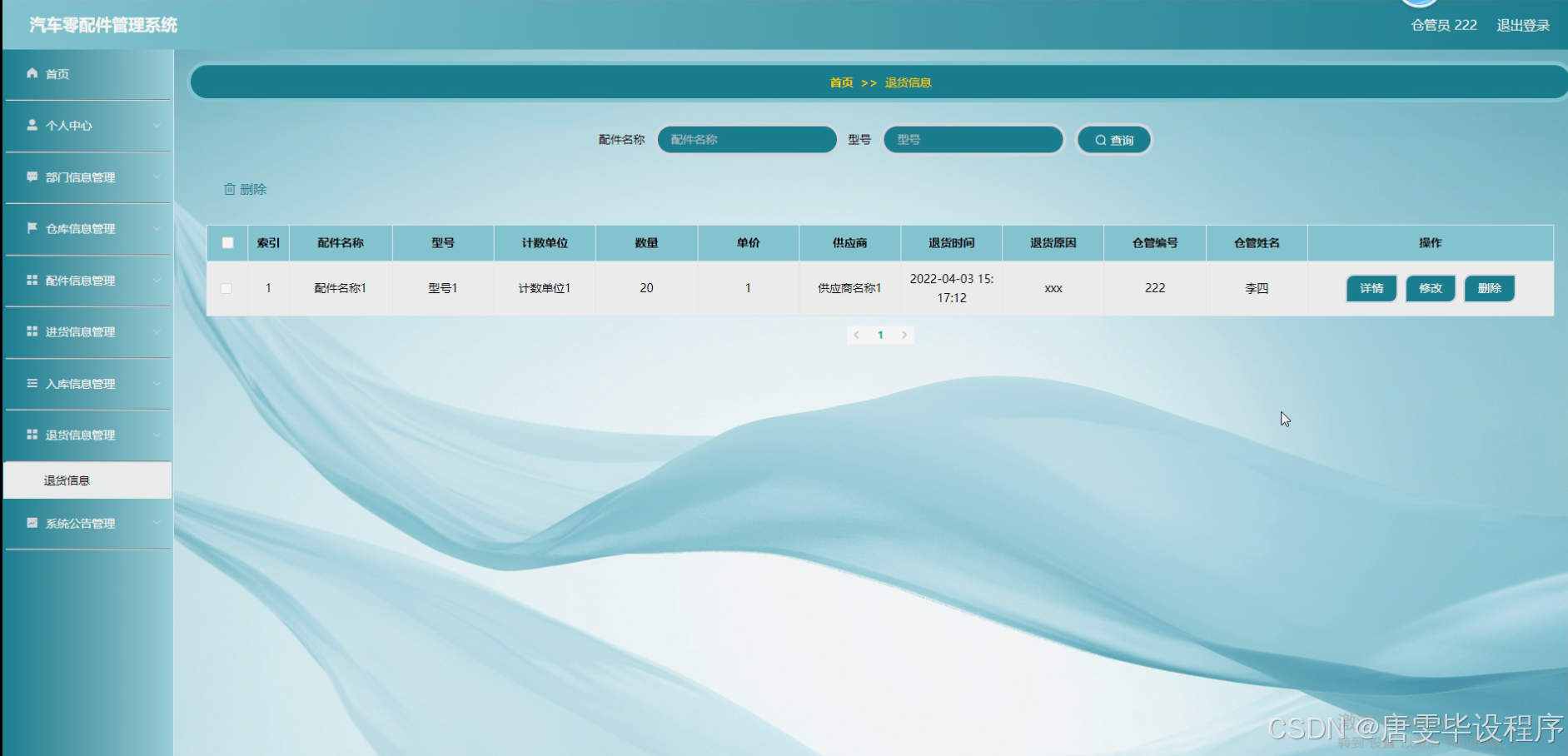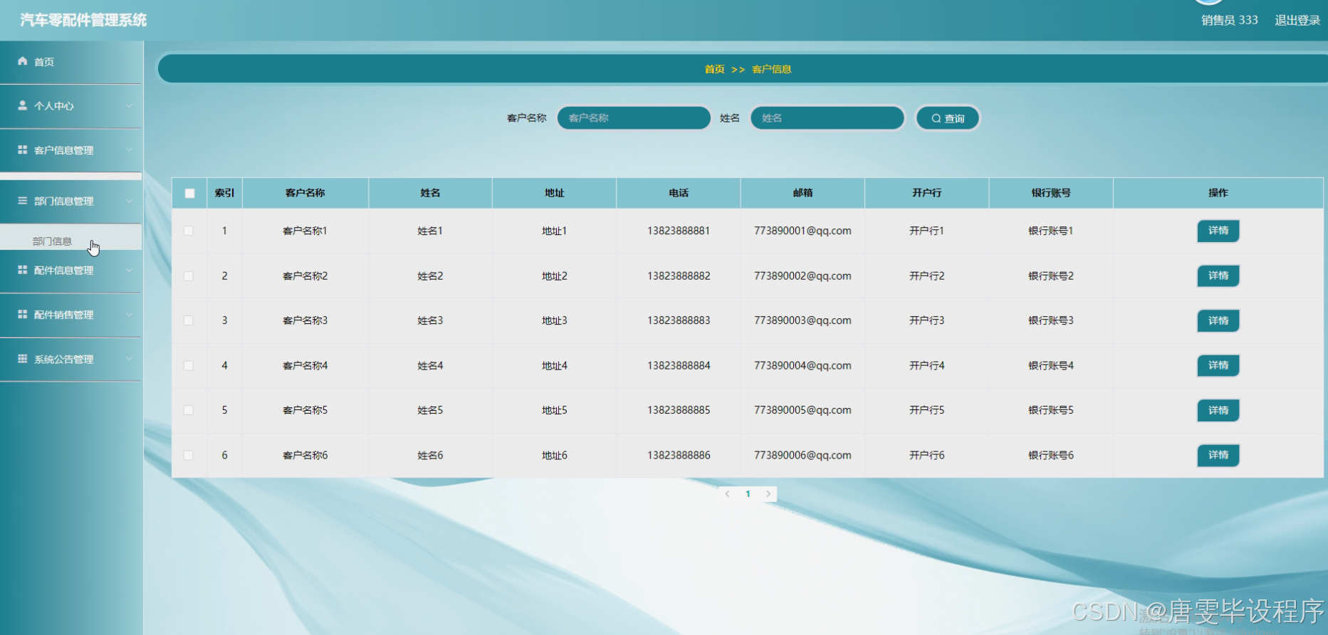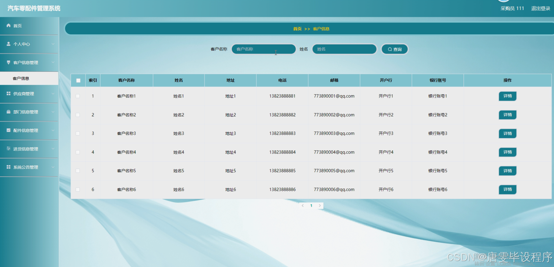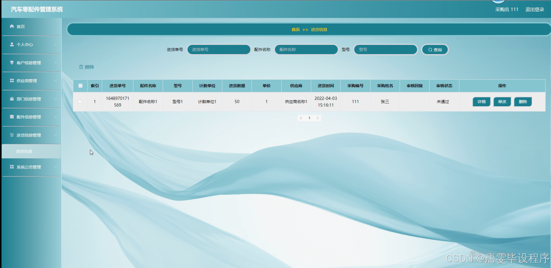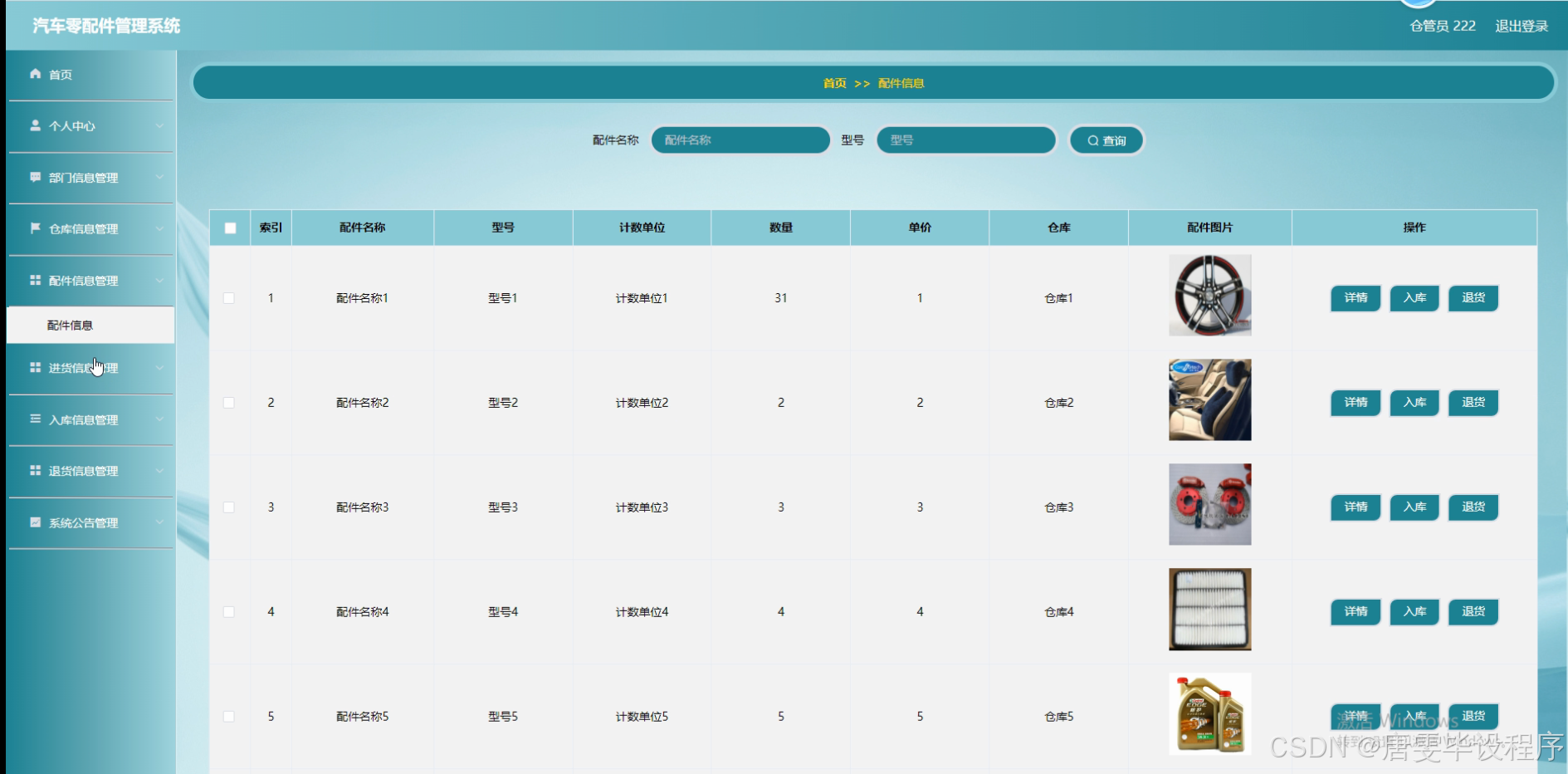 汽车零配件管理系统主要包括以下功能模块:采购员管理模块负责记录和管理采购员的基本信息;客户信息模块用于存储和维护客户的详细资料;供应商管理模块实现对供应商信息的录入和查询;部门信息管理模块负责部门信息的设置和维护;仓库信息管理模块记录仓库的基本情况和位置;仓管员管理模块管理仓管员的职责和权限;销售员管理模块记录销售员的基本信息和销售业绩;配件信息管理模块用于记录配件的详细信息,包括名称、型号、价格等;进货信息管理模块实现进货信息的录入和查询;退货信息管理模块处理退货业务;配件销售管理模块负责配件的销售记录;入库信息管理模块记录配件的入库情况;系统公告模块用于发布重要通知和消息。通过这些功能模块,系统能够实现对汽车零配件的全面管理,满足企业的实际需求。