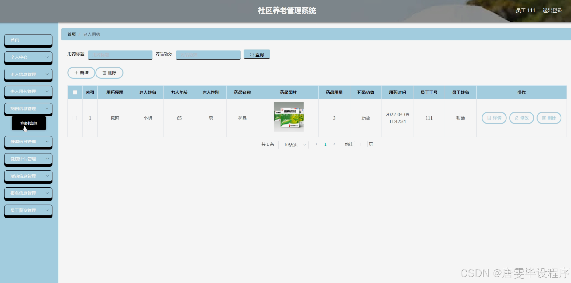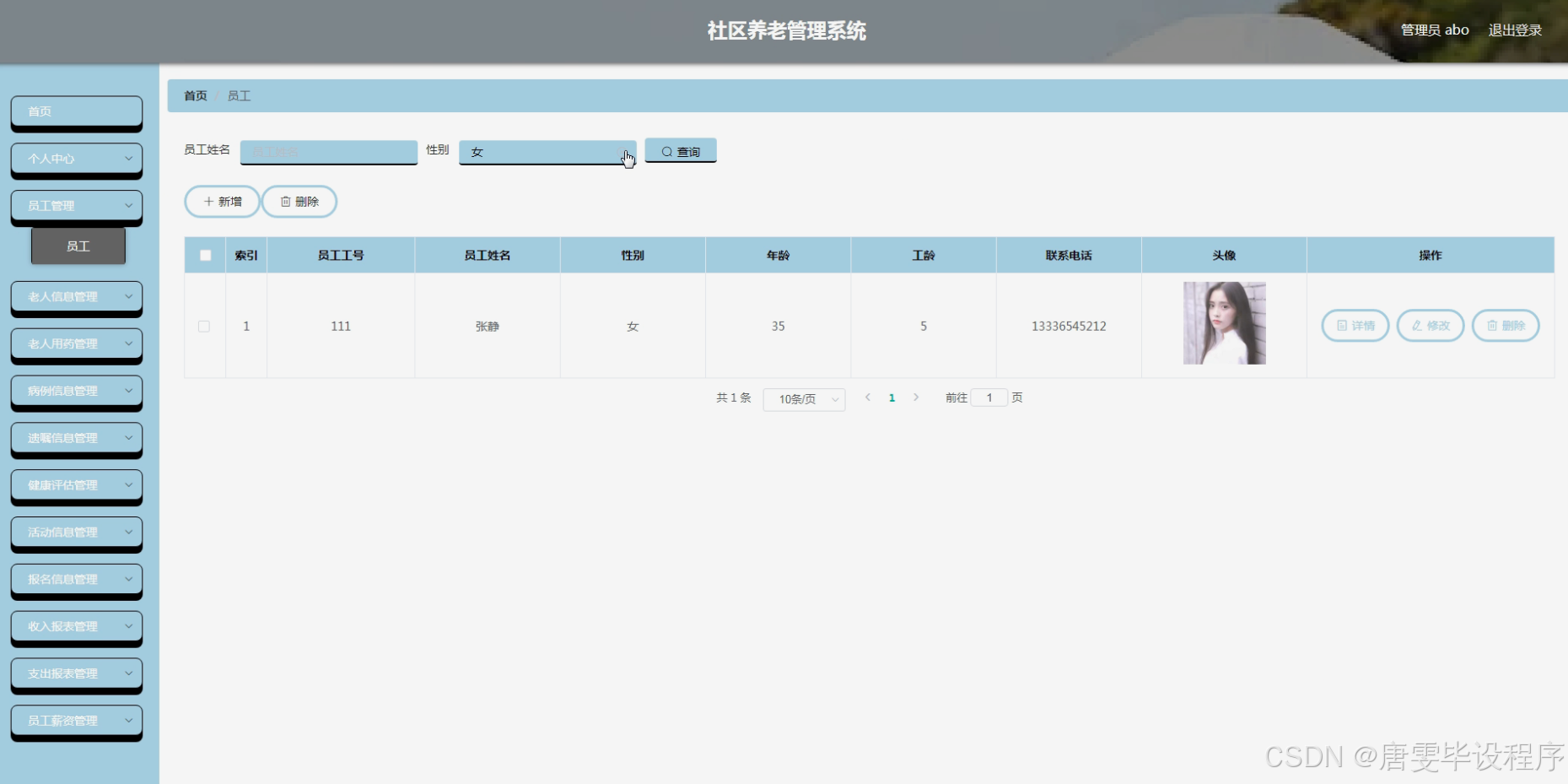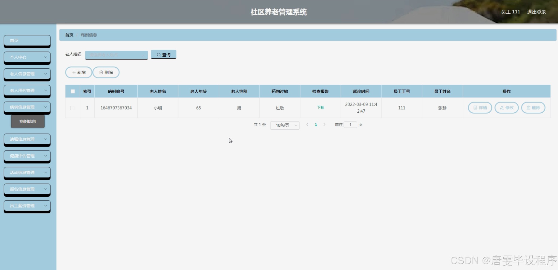 本研究的主要目的是设计并实现一套功能完善的社区养老管理系统,以信息化手段提升社区养老管理的效率和水平。通过该系统,实现对员工、老人信息的全面管理,包括健康评估、用药记录、病例信息、遗嘱信息等关键数据的存储与查询。同时,系统还应具备活动信息发布、报名管理、收入报表、支出报表以及员工薪资管理等功能,以满足社区养老服务的全方位需求。通过该系统的应用,旨在提高社区养老服务的整体效率和质量,为老年人提供更加便捷、舒适的养老服务体验。