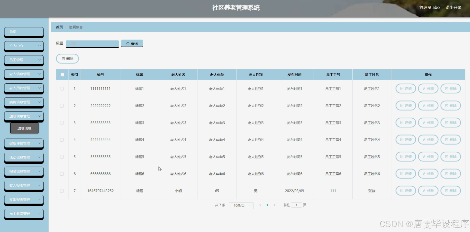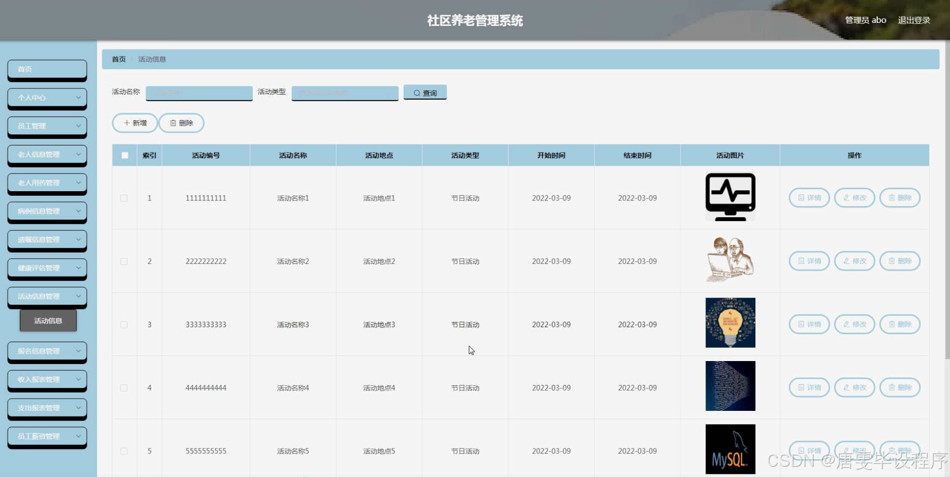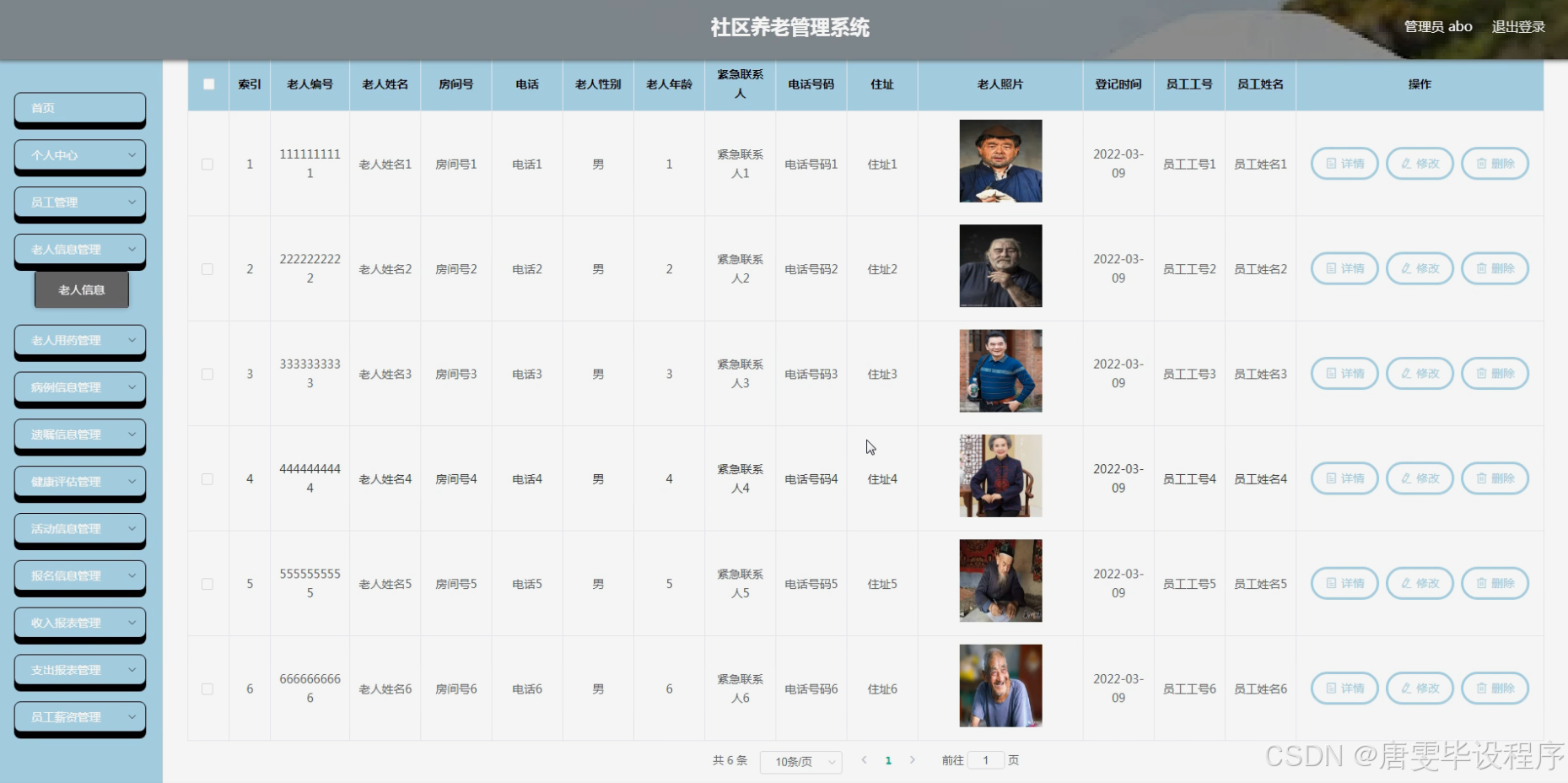 开发一套功能完善的社区养老管理系统:该系统将具备员工和老人信息管理、健康评估、用药记录、病例信息、遗嘱信息、活动信息发布与报名管理、收入报表与支出报表以及员工薪资管理等功能,满足社区养老管理的全方位需求。