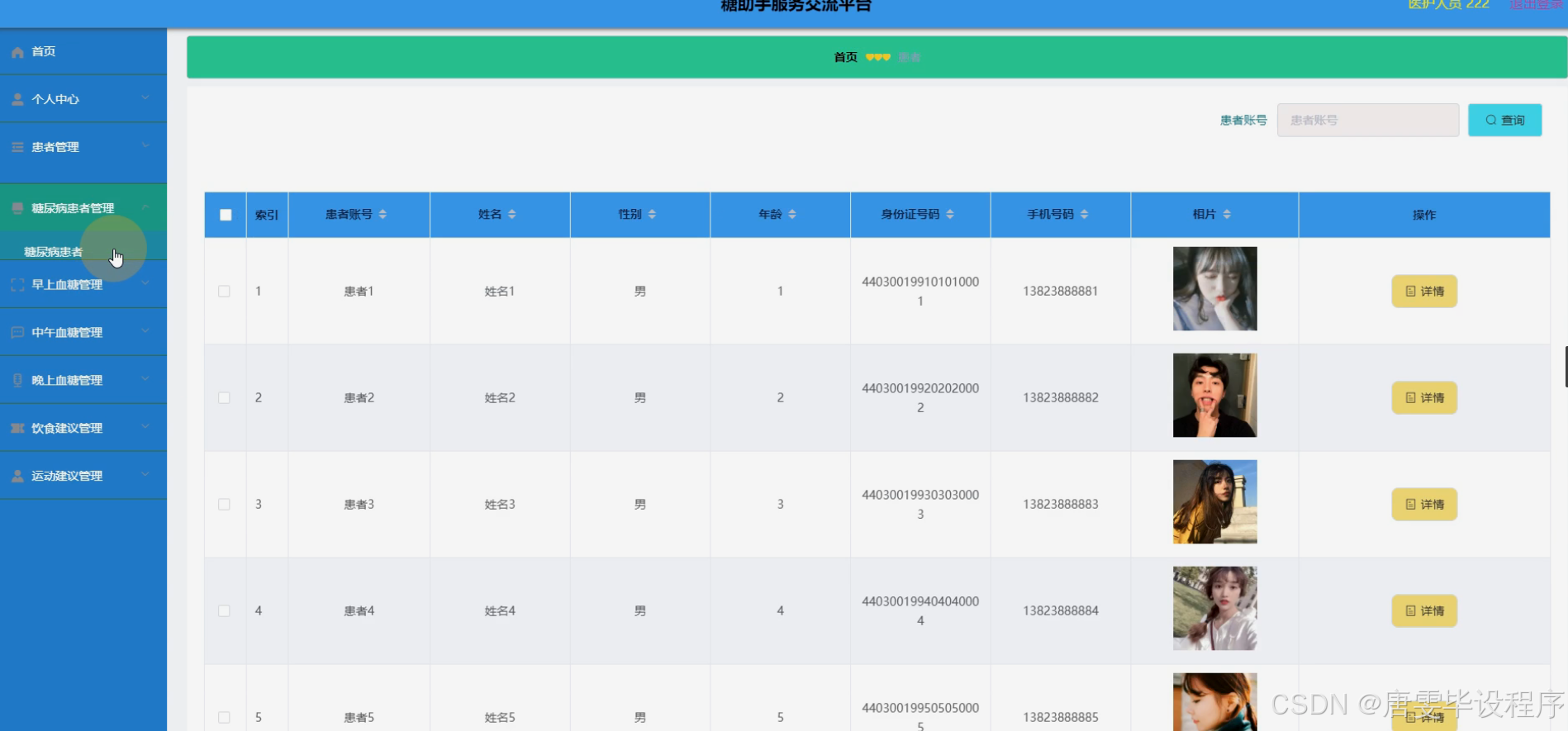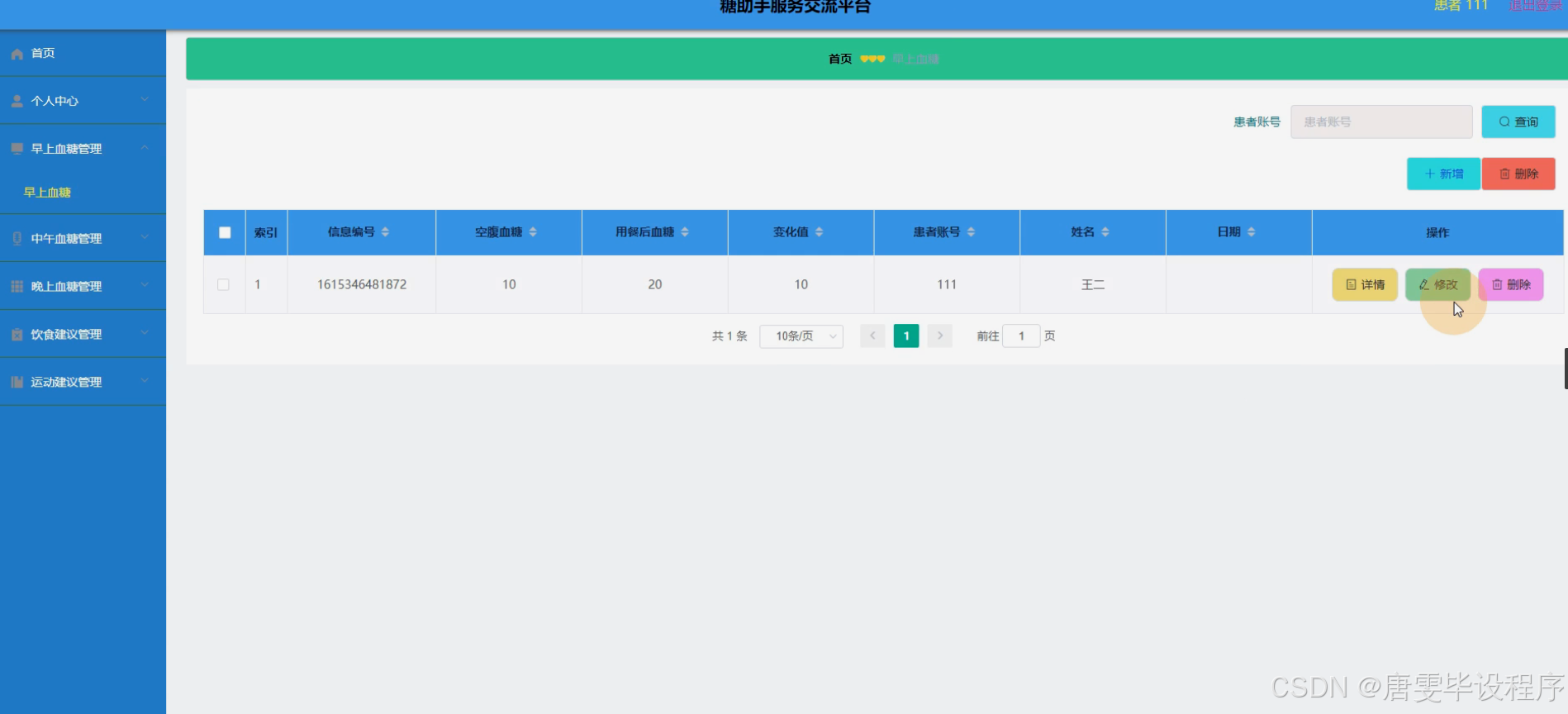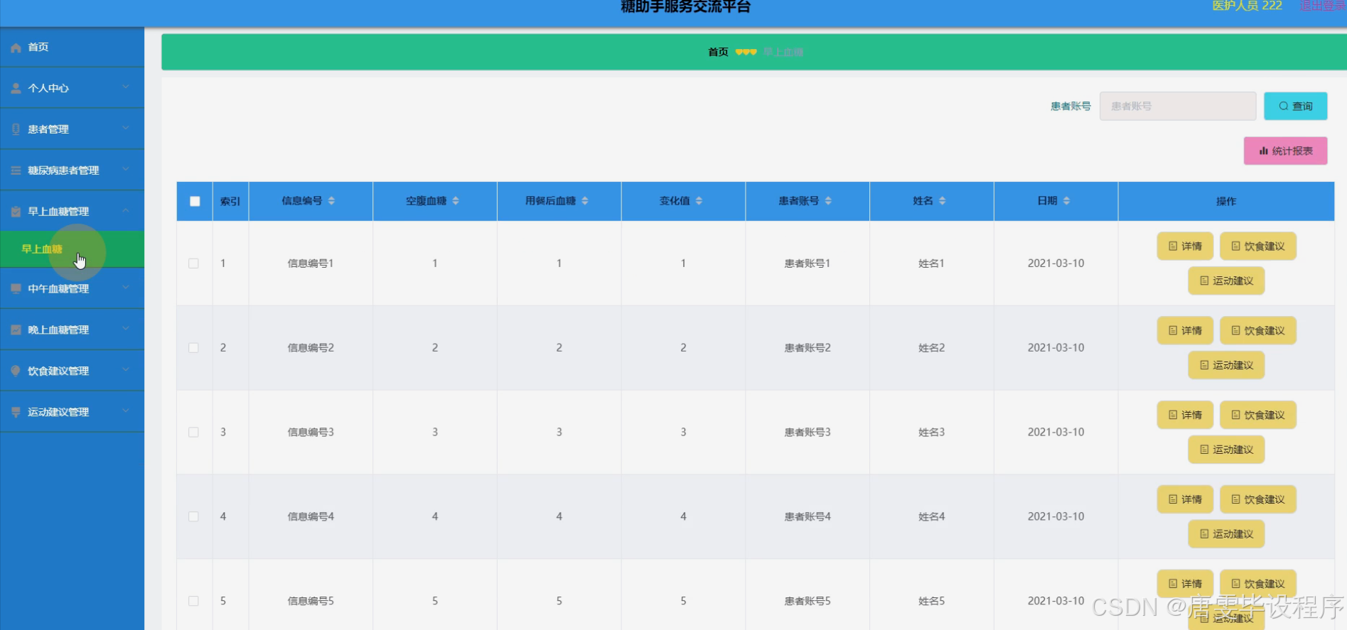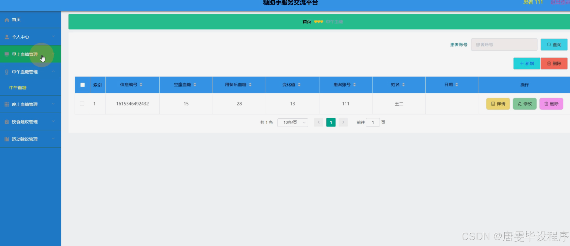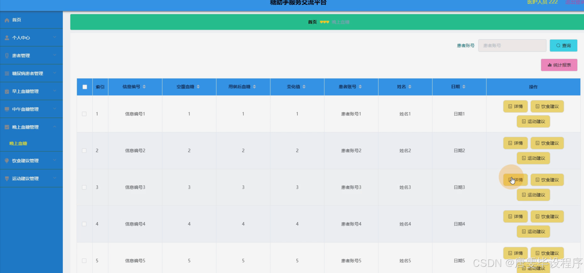糖助手服务交流平台将围绕患者、医护人员及糖尿病患者的实际需求,设计并实现以下核心功能:首先,平台将支持患者录入早上、中午、晚上的血糖数据,实现血糖的实时监测与记录。其次,基于患者的血糖数据和个人信息,平台将运用智能算法提供个性化的饮食建议和运动计划,帮助患者科学调整生活方式。此外,平台还将搭建一个医护人员与患者之间的交流渠道,方便医护人员及时了解患者情况,提供远程指导与咨询服务。通过这些功能的实现,糖助手服务交流平台将形成一个全方位的糖尿病管理服务体系。