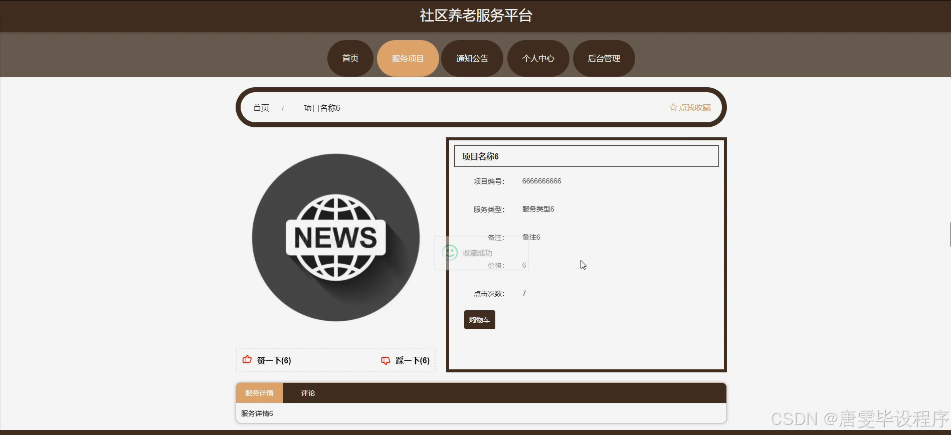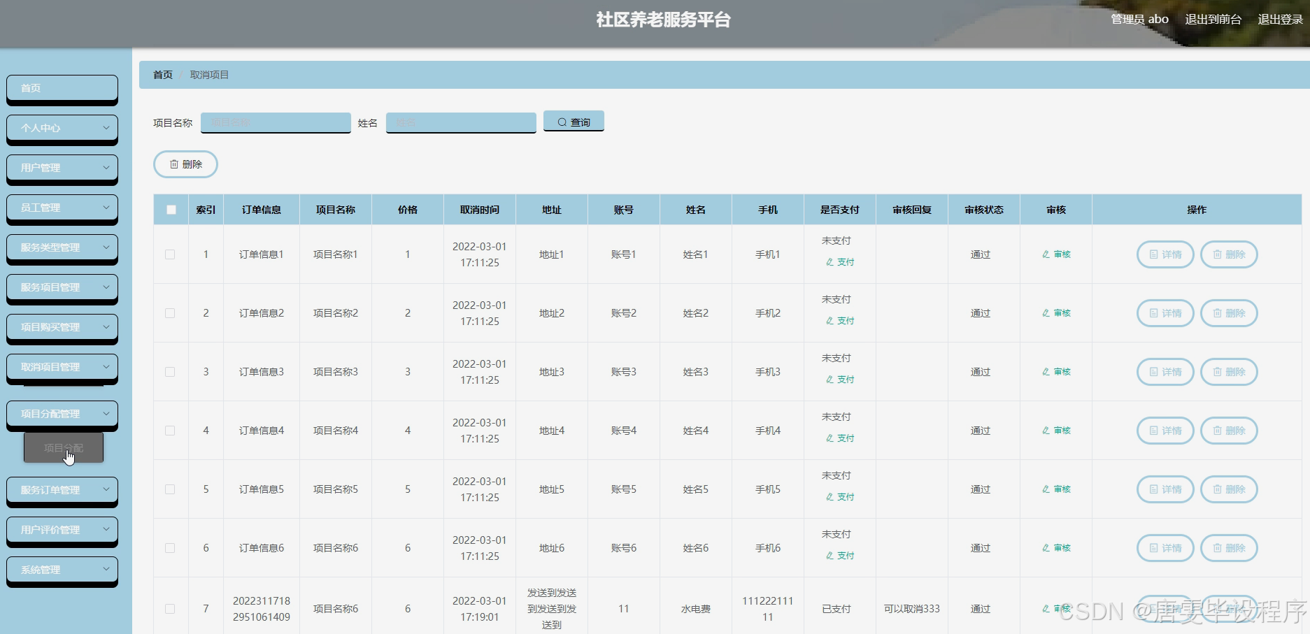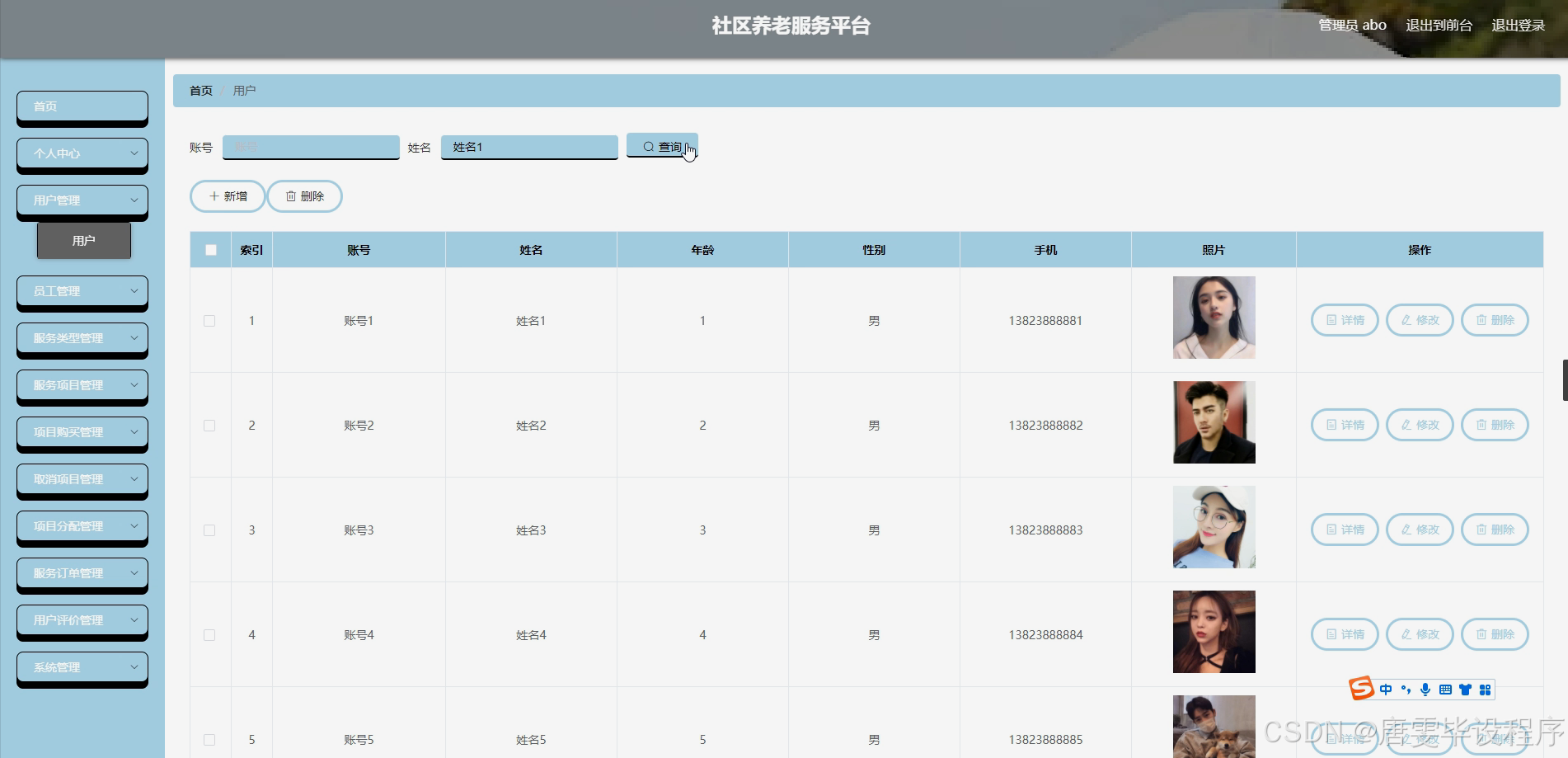 本研究旨在设计并实现一个功能完善的社区养老服务平台,以满足老年人多样化的养老服务需求。通过平台,实现用户信息管理、员工调度管理、服务类型与项目展示、项目购买与取消、项目分配、服务订单管理以及用户评价等功能,为老年人提供一站式、全方位的养老服务体验。同时,通过平台的运营和优化,推动社区养老服务的标准化、专业化发展,提升养老服务的整体质量和效率。