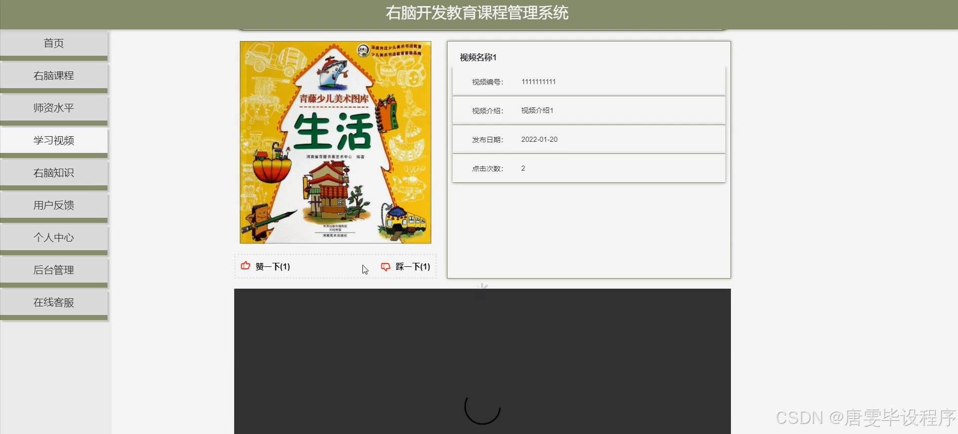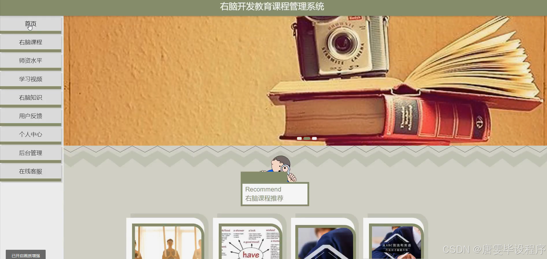 本研究旨在通过构建右脑开发教育课程管理系统,实现教育资源的有效整合与优化配置,提升右脑开发教育的质量与效率。该系统不仅能够为教育机构提供一个展示课程、管理师资、处理订单的综合平台,还能为学习者提供个性化的学习建议,增强其学习体验与效果。此外,系统的实施还有助于推动右脑开发教育的普及与发展,为培养更多具有创新思维和综合能力的人才贡献力量。