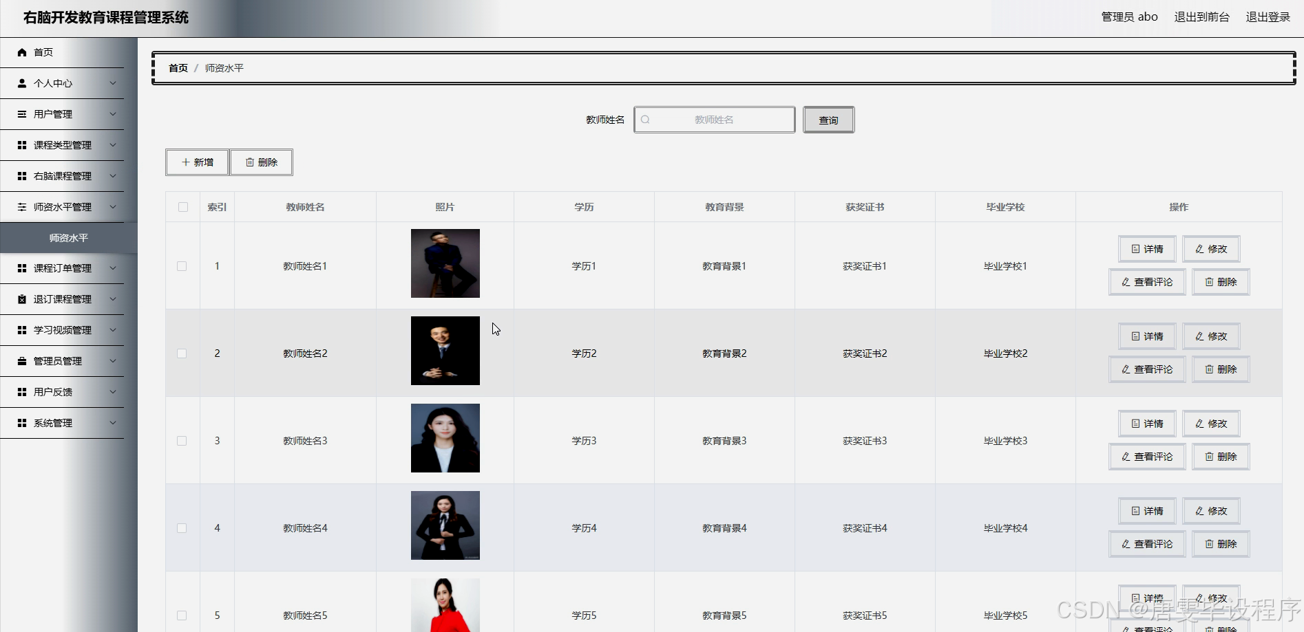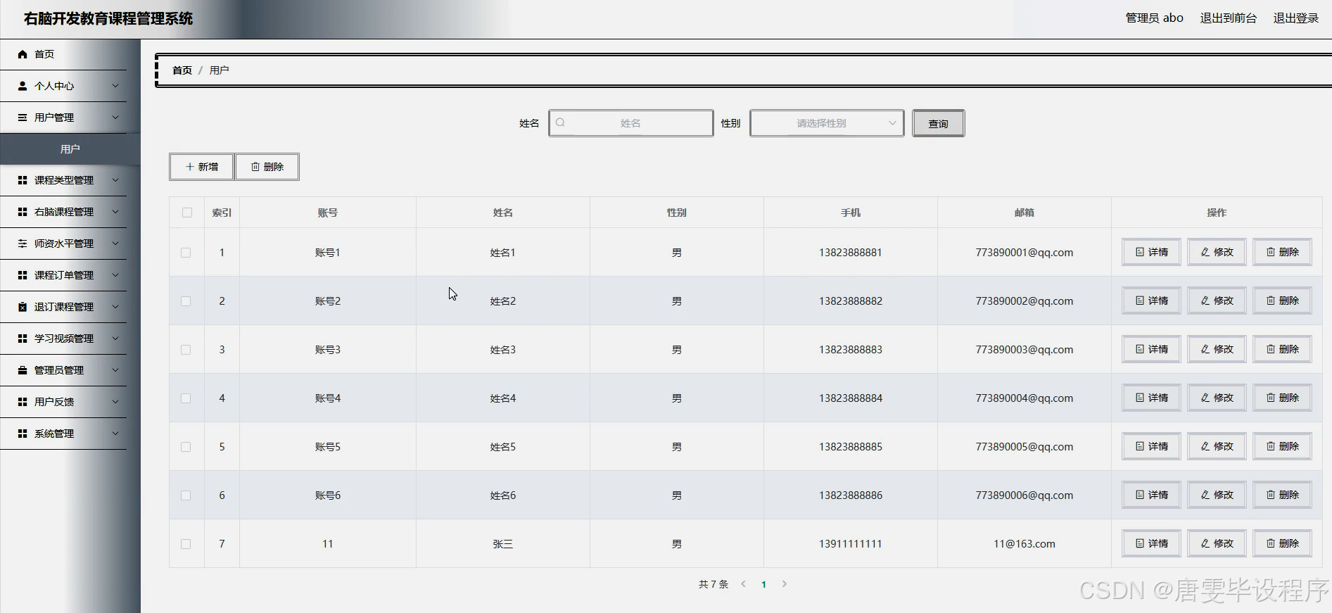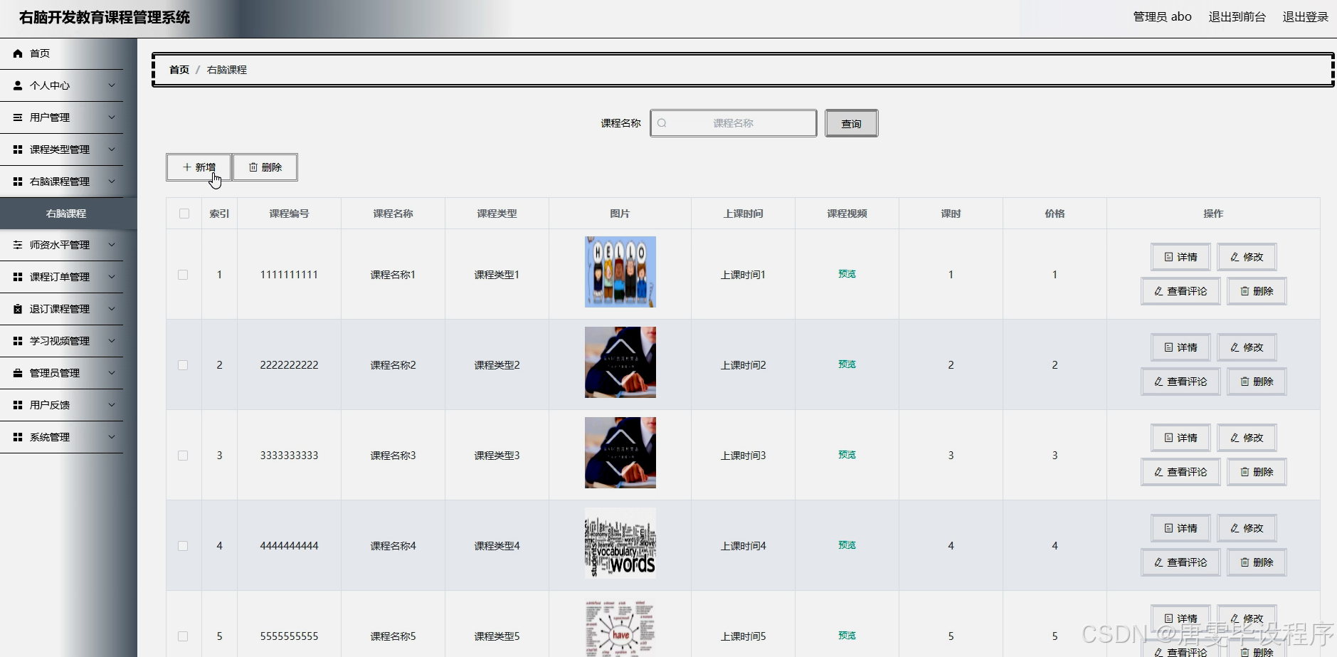 本研究将围绕右脑开发教育课程管理系统的设计与实现展开,具体内容包括:用户信息管理模块,用于记录并管理教育机构、教师、学生及家长的基本信息;课程类型管理模块,实现课程分类的灵活设置与调整;右脑课程管理模块,涵盖课程内容的上传、编辑、发布等功能;师资水平评估模块,通过多维度评价教师教学质量;课程订单管理模块,处理学生的课程购买、支付及退订请求;学习视频管理模块,提供视频资源的上传、分类、播放等功能。通过这些模块的设计与实施,构建一个功能全面、操作便捷、用户体验良好的右脑开发教育课程管理系统。